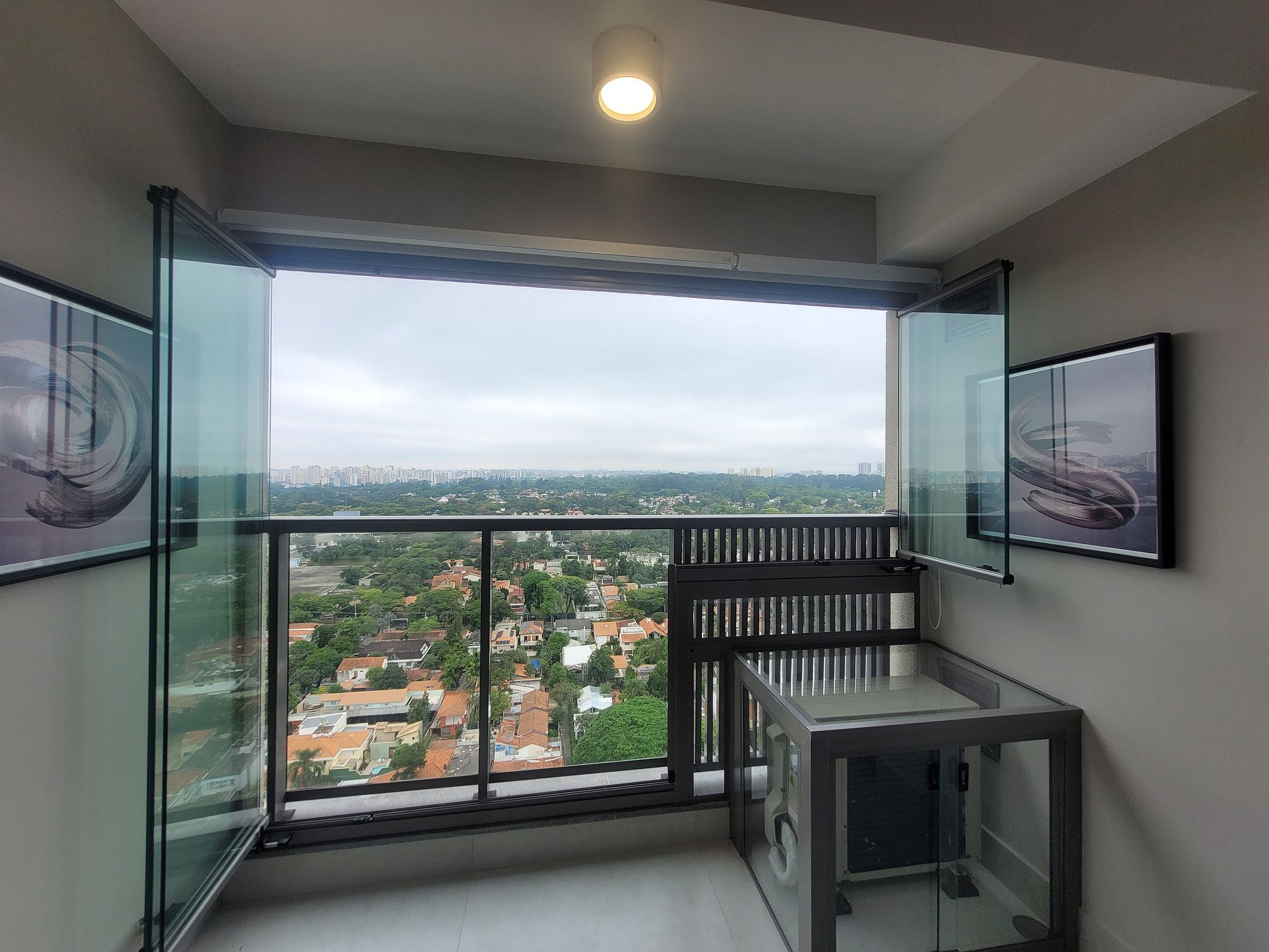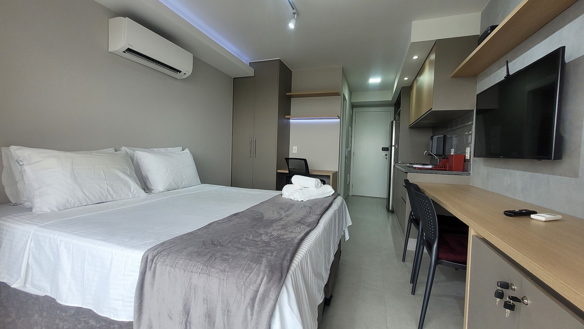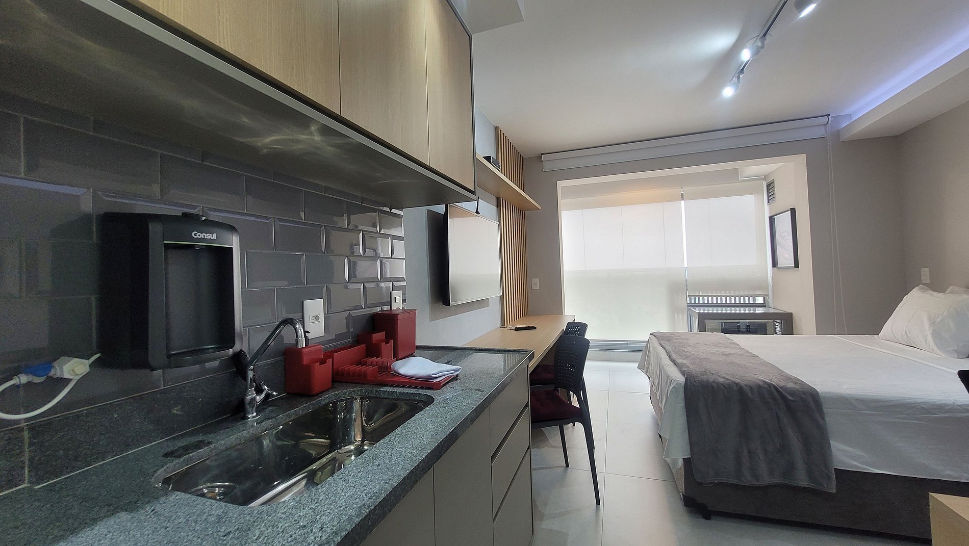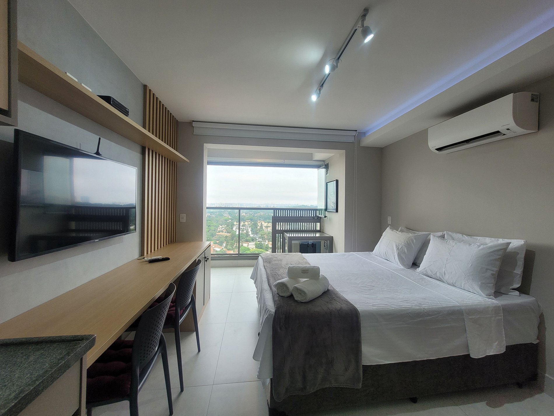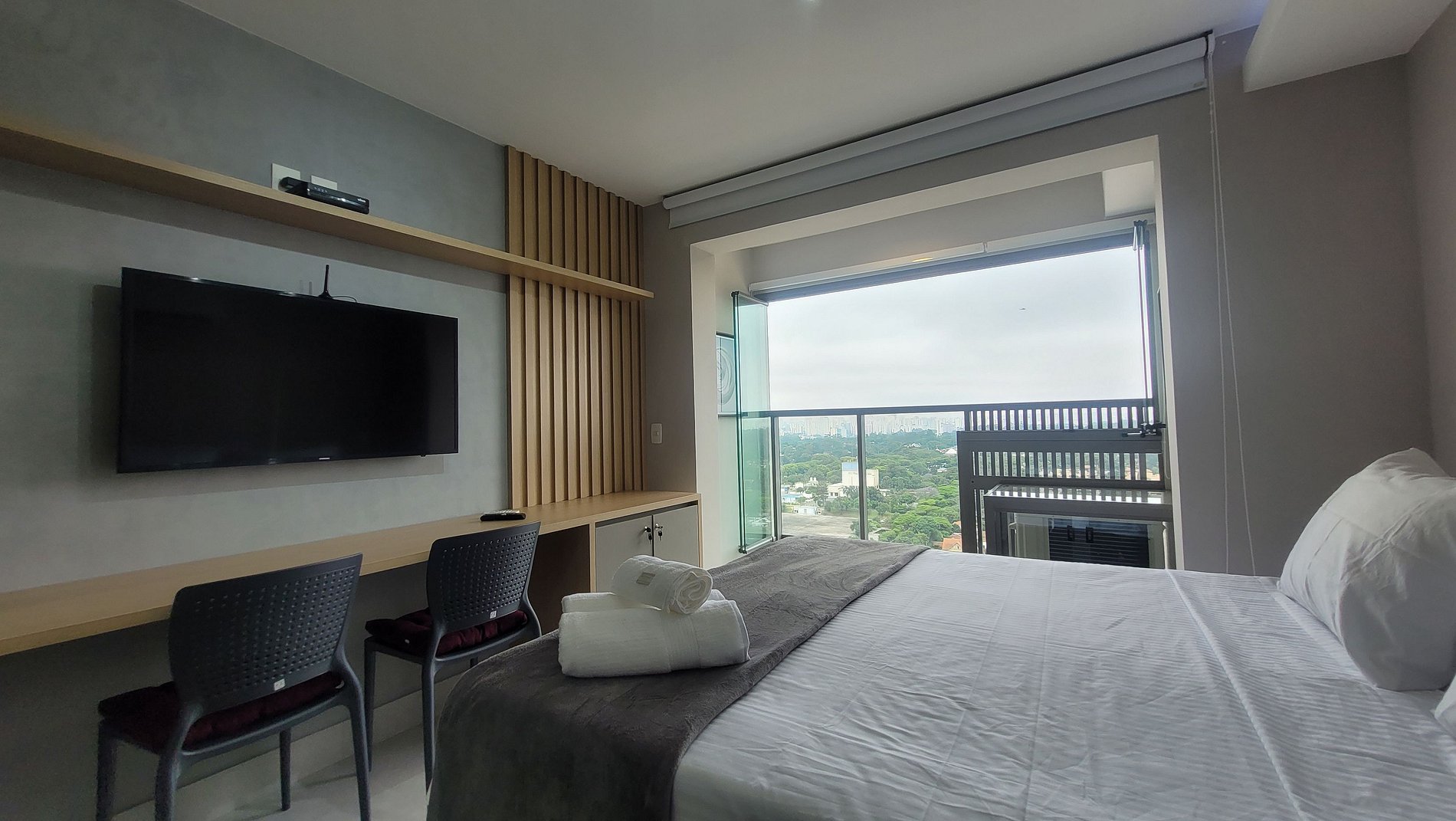 O apartamento decorado e ambientado para locações de curta temporada, Internet banda larga, mesinha para home office e ar condicionado. Uma vista incrível do 26º andar.