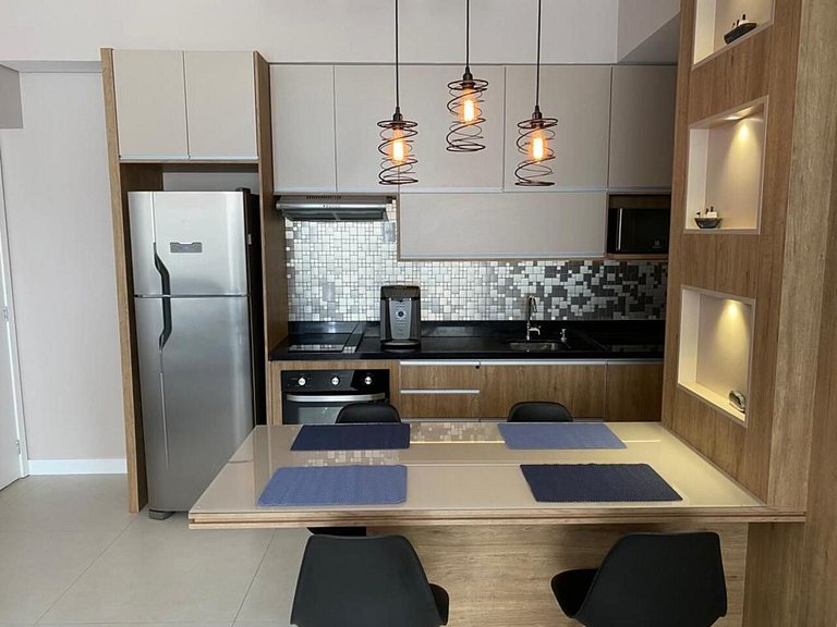 Apartamento conforme anúncio, confortável, agradável e moderno, e estava no geral limpo e organizado. O quarto é separado do restante do apartamento, o que deixa o local bem aconchegante. Os dois aparelhos de ar-condicionado gelam bem! Quem vai pra trabalhar encontra uma mesa de trabalho bem preparada e com tomadas bem posicionadas.