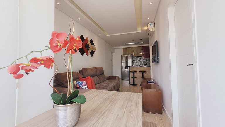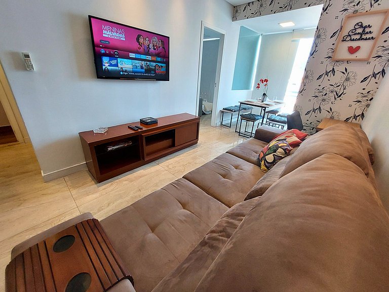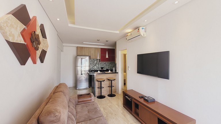 Conheça o apartamento 1312. Exclusividade, luxo e estilo em um moderno Studio convertido em 2 quartos, ideal para famílias ou pequenos grupos. Acomoda até 4 pessoas em um ambiente decorado com sofisticação. Os quartos possuem camas de molas ensacadas e um confortável sofá-cama, todos com roupa de cama 200 fios, garantindo uma noite de sono perfeita. O espaço foi planejado para uma estadia agradável e aconchegante. Aceita cães de até 15kg, com taxa adicional de R$ 120,00. Gatos não são aceitos.