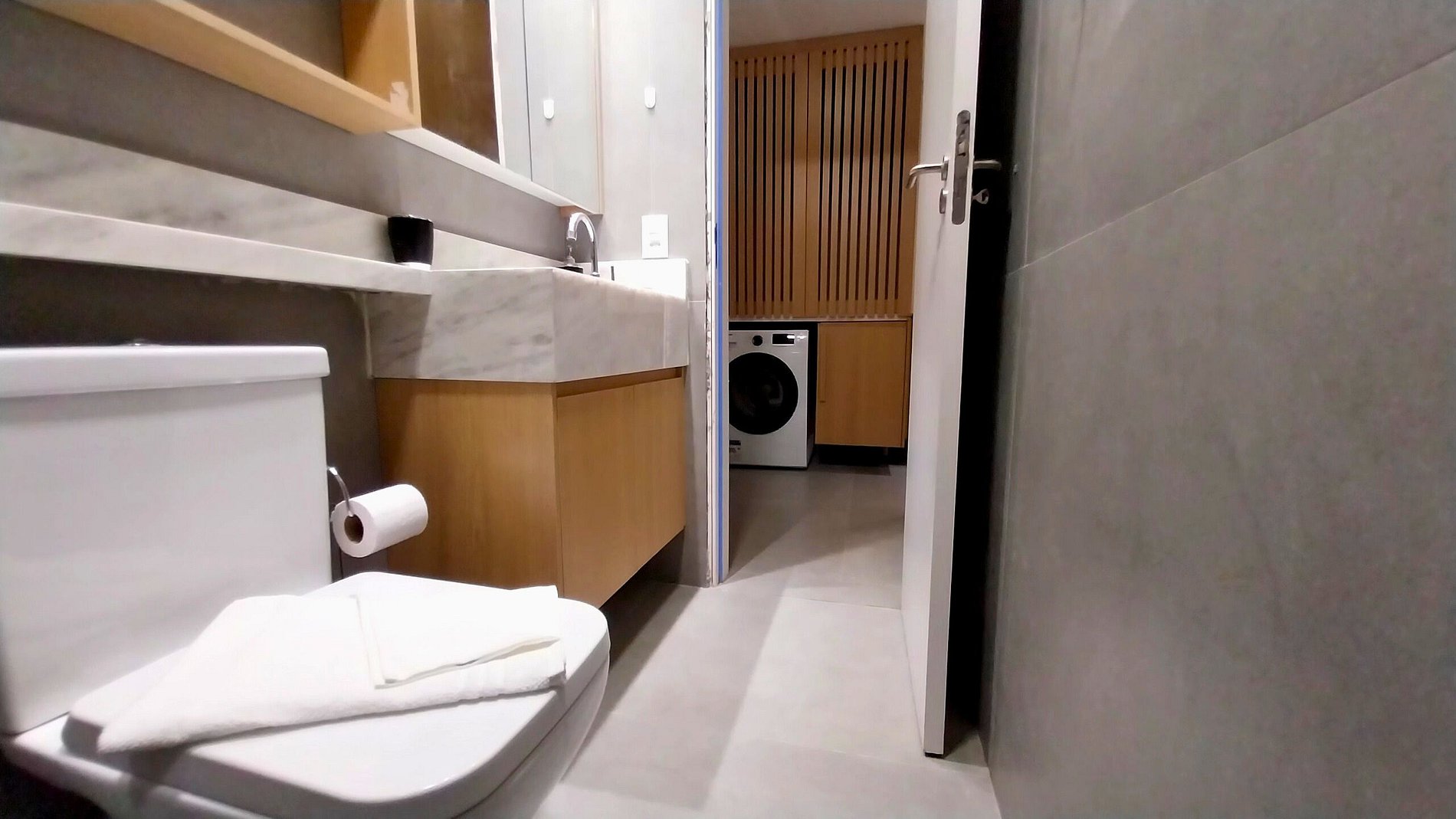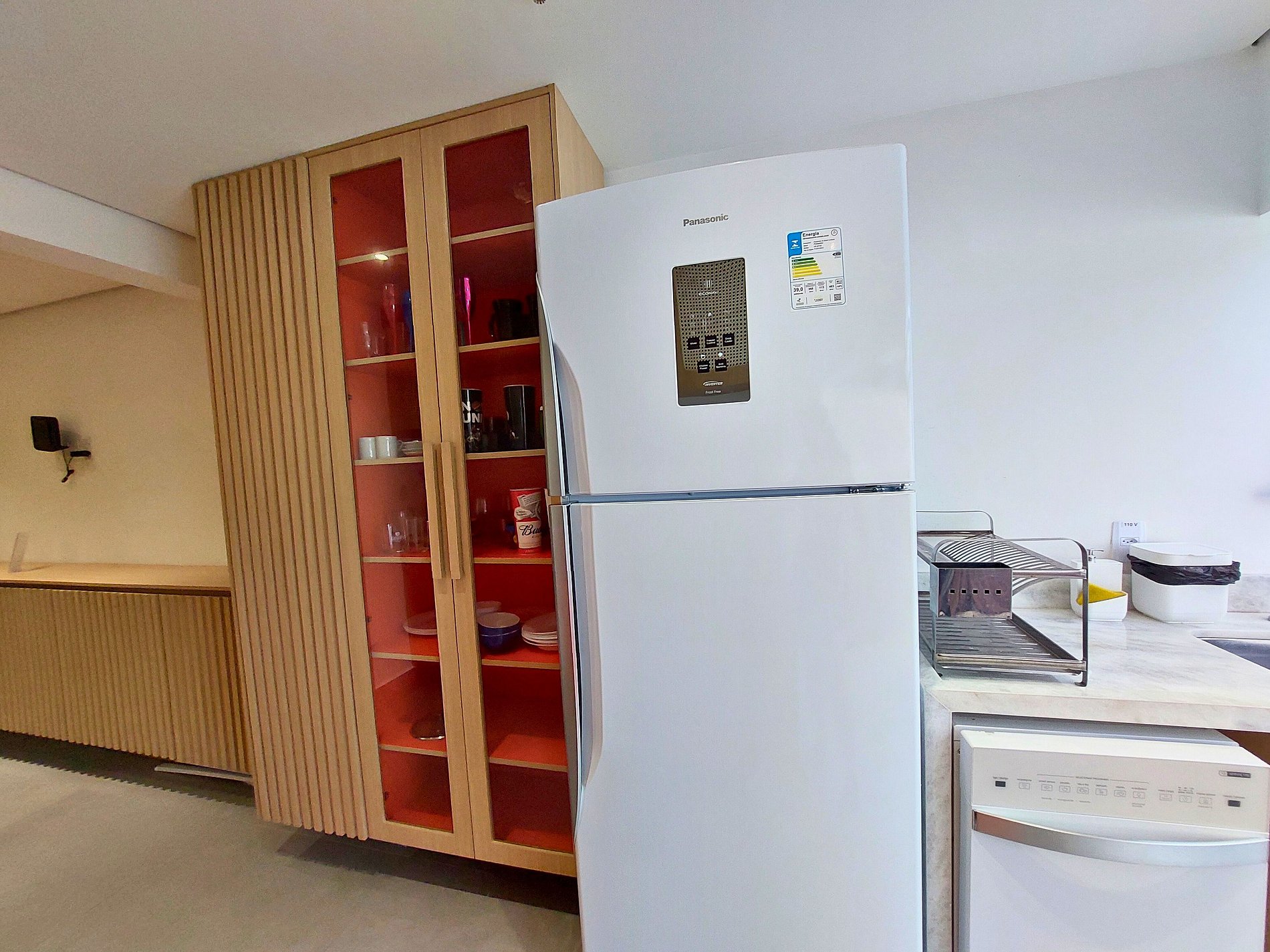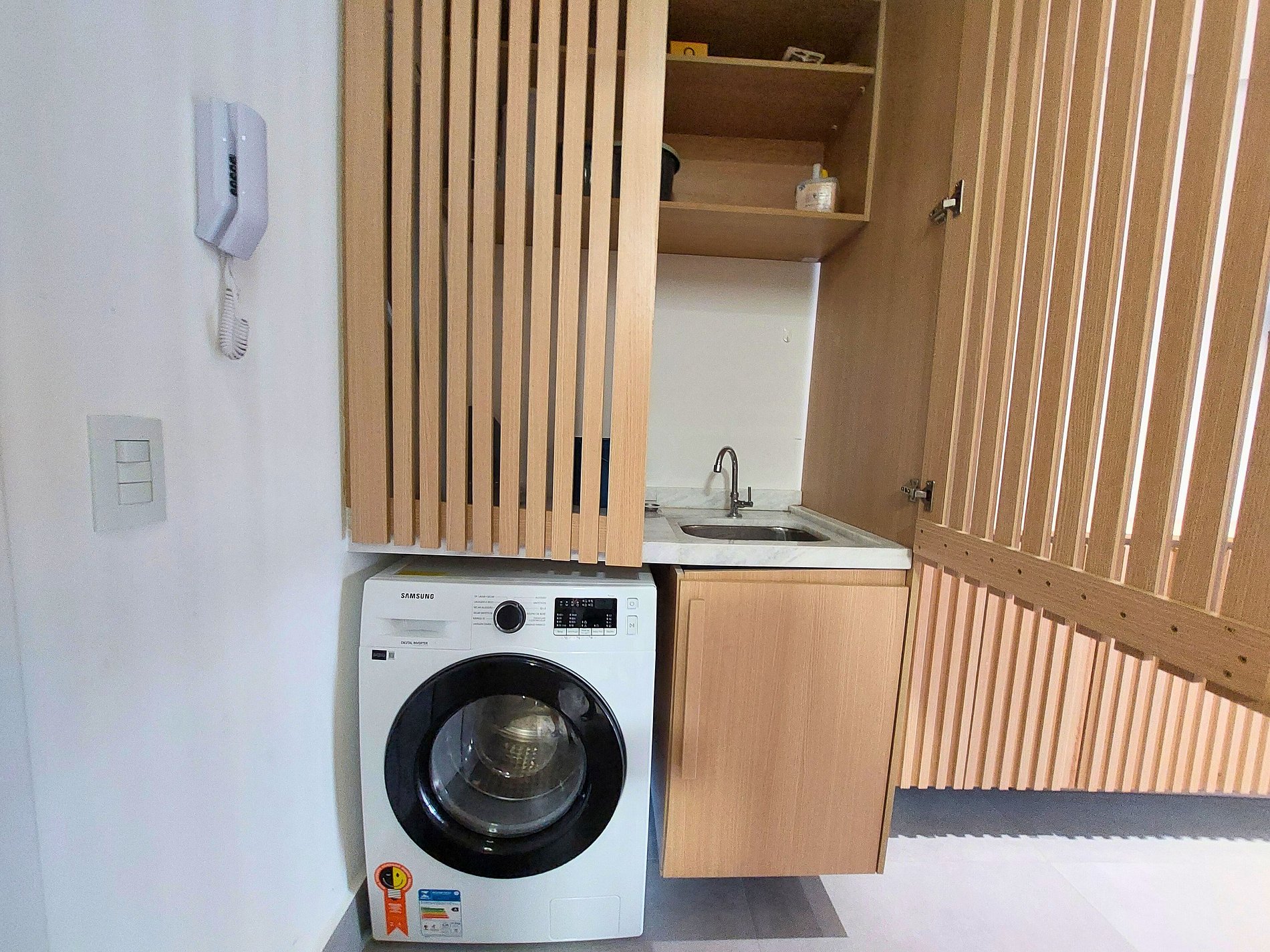 Cozinha de MasterChef! Nossa cozinha integrada e planejada é um masterchef's dream, com enorme balcão em mármore branco é equipada com aparelhos de última geração e todos os utensílios necessários para preparar suas refeições favoritas, tais como; cooktop 4 bocas de indução com jogo completo de panelas, forno elétrico grande e embutido(44lts), micro-ondas dupla refeição, Geladeira Frost Free, Lava-Louças, Air Fryer, cafeteira, sanduicheira, liquidificador, panela elétrica de arroz, louças de qualidade (copos e pratos de modelos diversos) e todos os utensílios domésticos possíveis, que garantem sua experiência culinária. Para sua comodidade contamos também com Lava e Seca Samsung 11KG (Sabão não incluso) para lavagem e secagem de suas roupas no próprio apartamento.