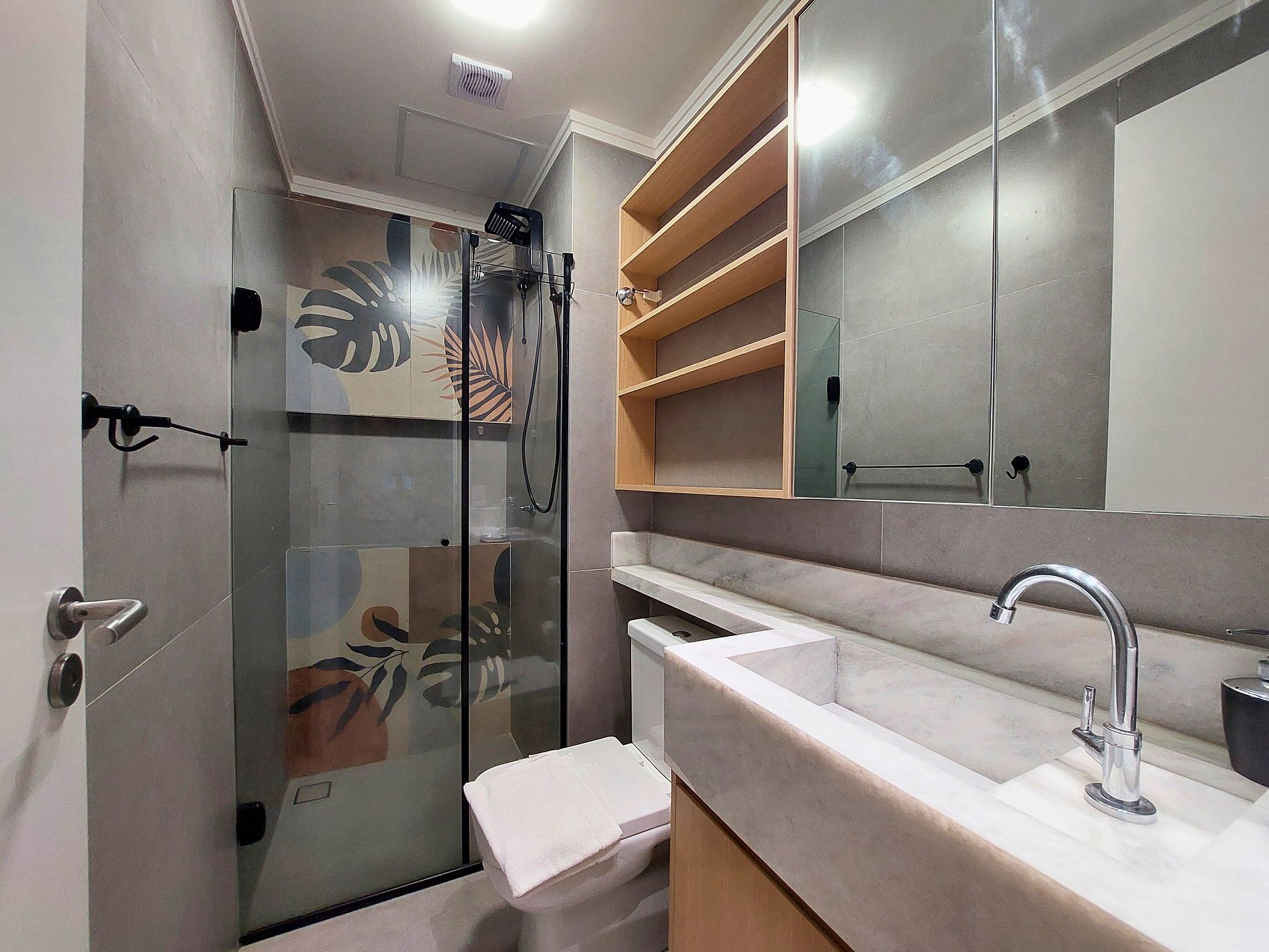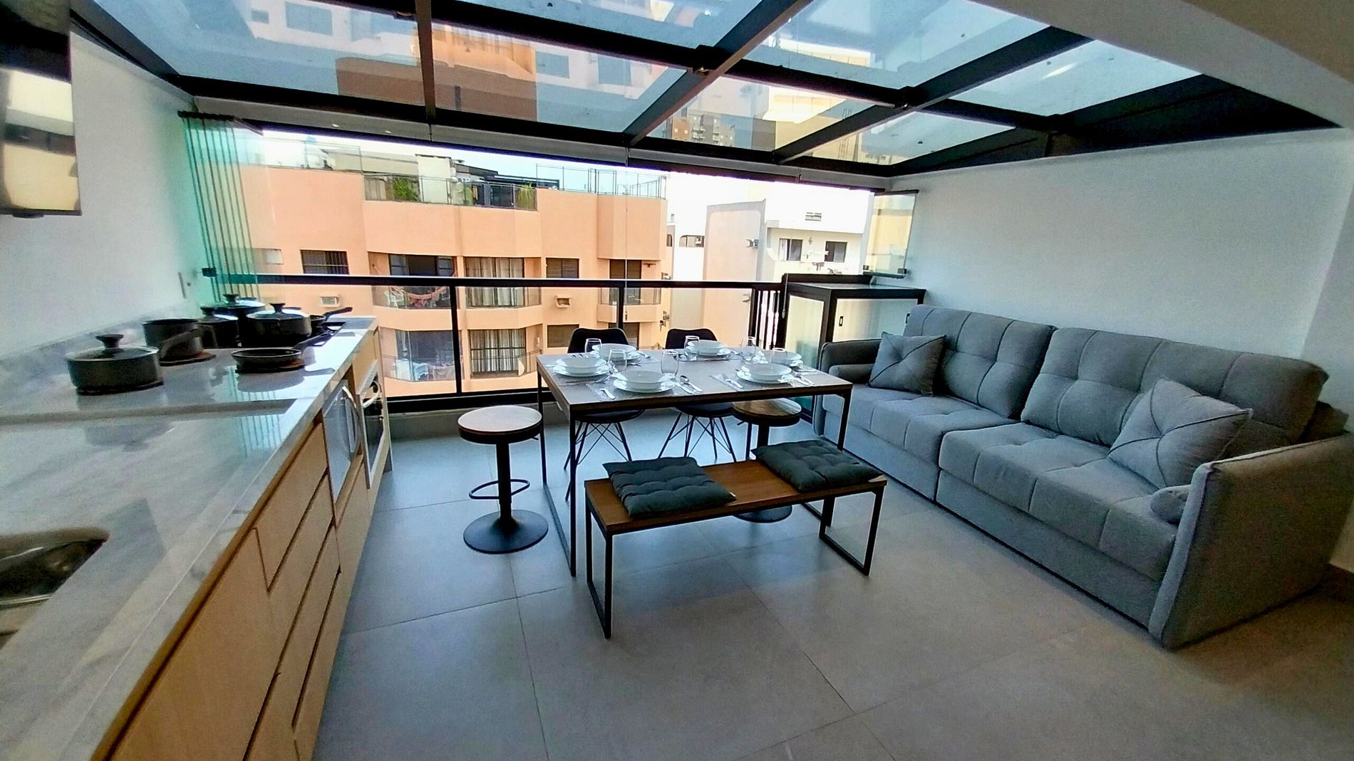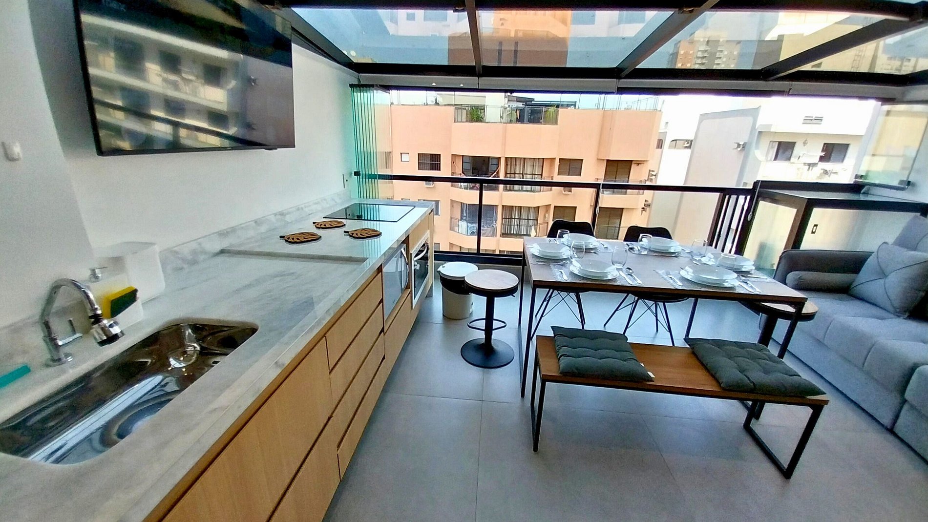 Cozinha de MasterChef! Nossa cozinha integrada e planejada é um masterchef's dream, com enorme balcão em mármore branco é equipada com aparelhos de última geração e todos os utensílios necessários para preparar suas refeições favoritas, tais como; cooktop 4 bocas de indução com jogo completo de panelas, forno elétrico grande e embutido(44lts), micro-ondas dupla refeição, Geladeira Frost Free, Lava-Louças, Air Fryer, cafeteira, sanduicheira, liquidificador, panela elétrica de arroz, louças de qualidade (copos e pratos de modelos diversos) e todos os utensílios domésticos possíveis, que garantem sua experiência culinária. Para sua comodidade contamos também com Lava e Seca Samsung 11KG (Sabão não incluso) para lavagem e secagem de suas roupas no próprio apartamento.
