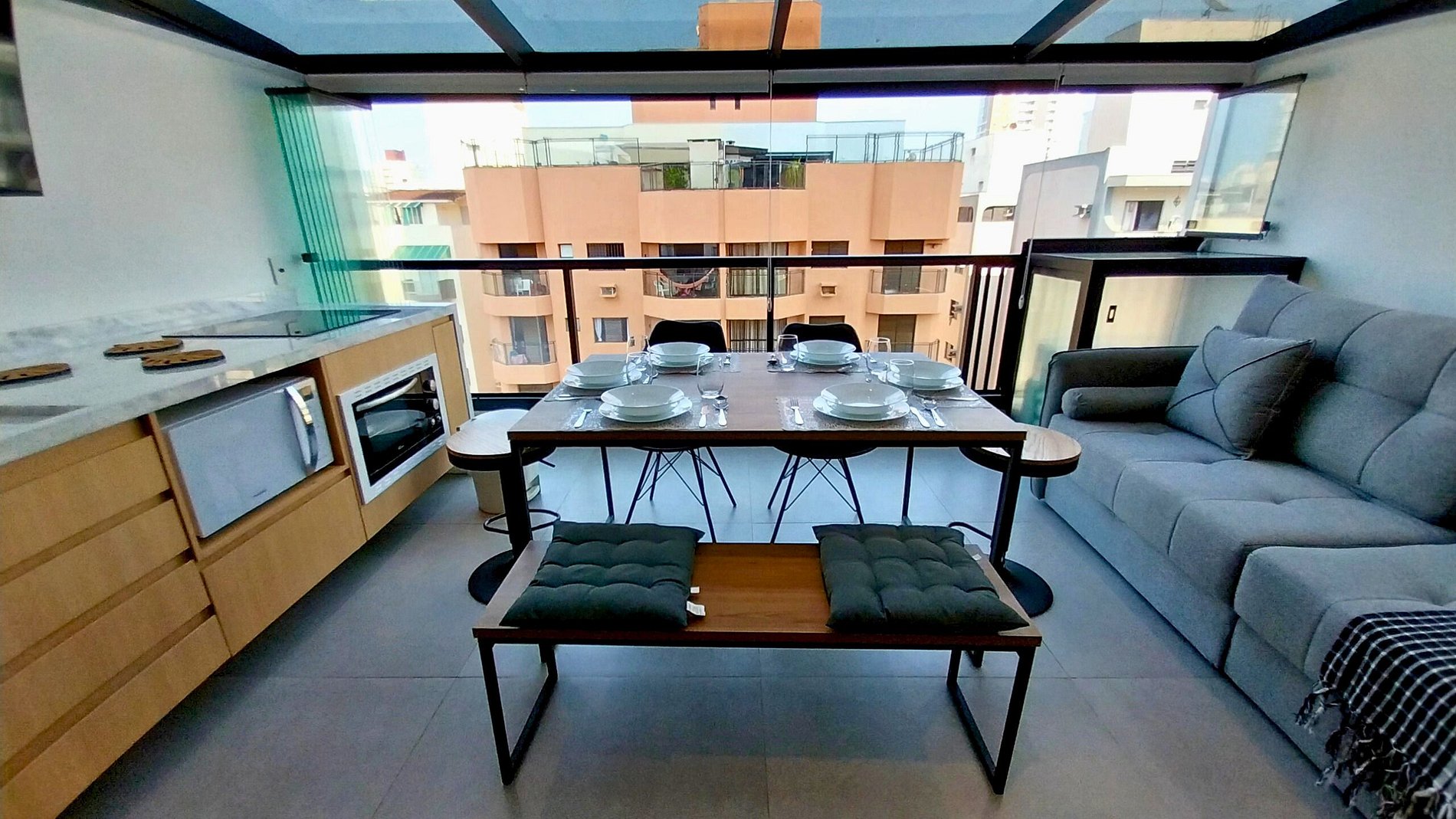 Cozinha de MasterChef! Nossa cozinha integrada e planejada é um masterchef's dream, com enorme balcão em mármore branco é equipada com aparelhos de última geração e todos os utensílios necessários para preparar suas refeições favoritas, tais como; cooktop 4 bocas de indução com jogo completo de panelas, forno elétrico grande e embutido(44lts), micro-ondas dupla refeição, Geladeira Frost Free, Lava-Louças, Air Fryer, cafeteira, sanduicheira, liquidificador, panela elétrica de arroz, louças de qualidade (copos e pratos de modelos diversos) e todos os utensílios domésticos possíveis, que garantem sua experiência culinária. Para sua comodidade contamos também com Lava e Seca Samsung 11KG (Sabão não incluso) para lavagem e secagem de suas roupas no próprio apartamento.