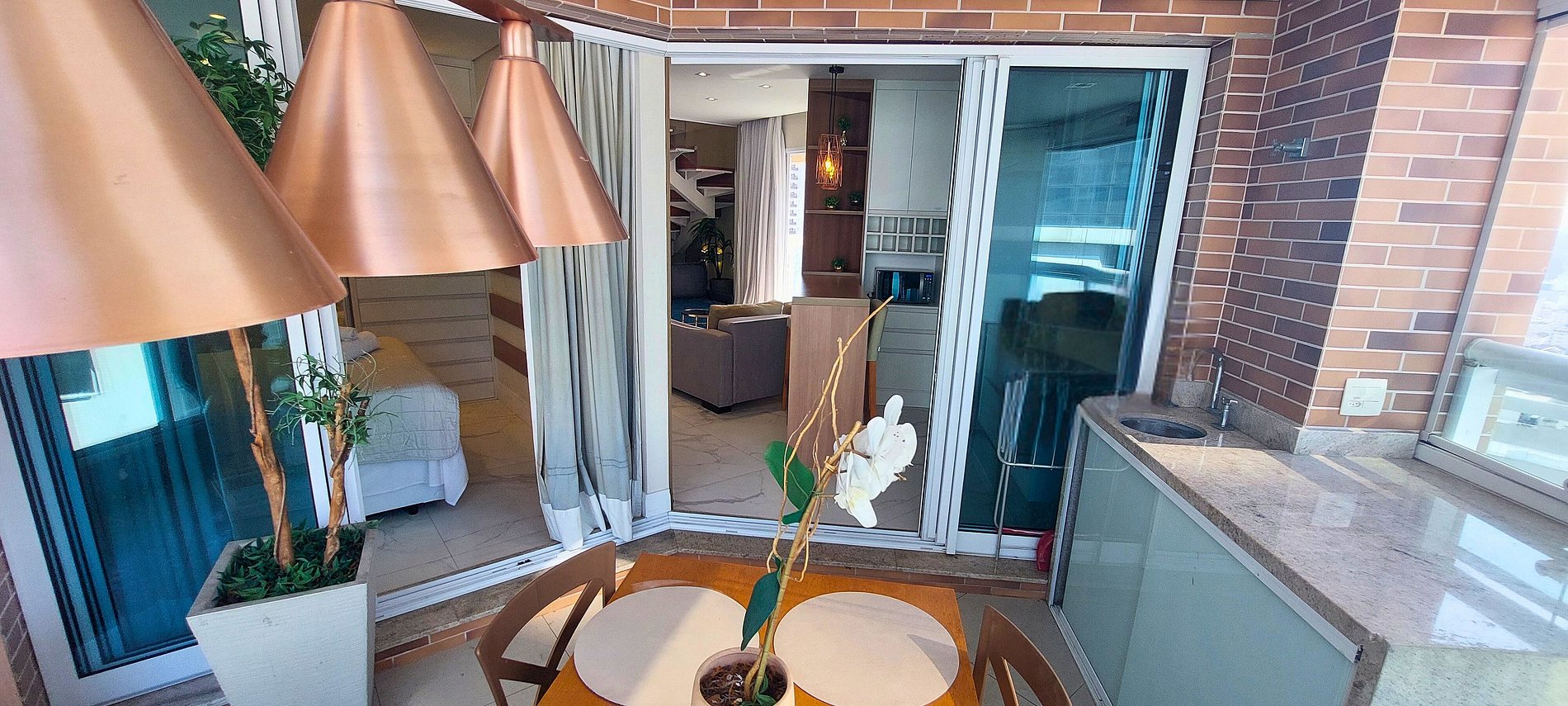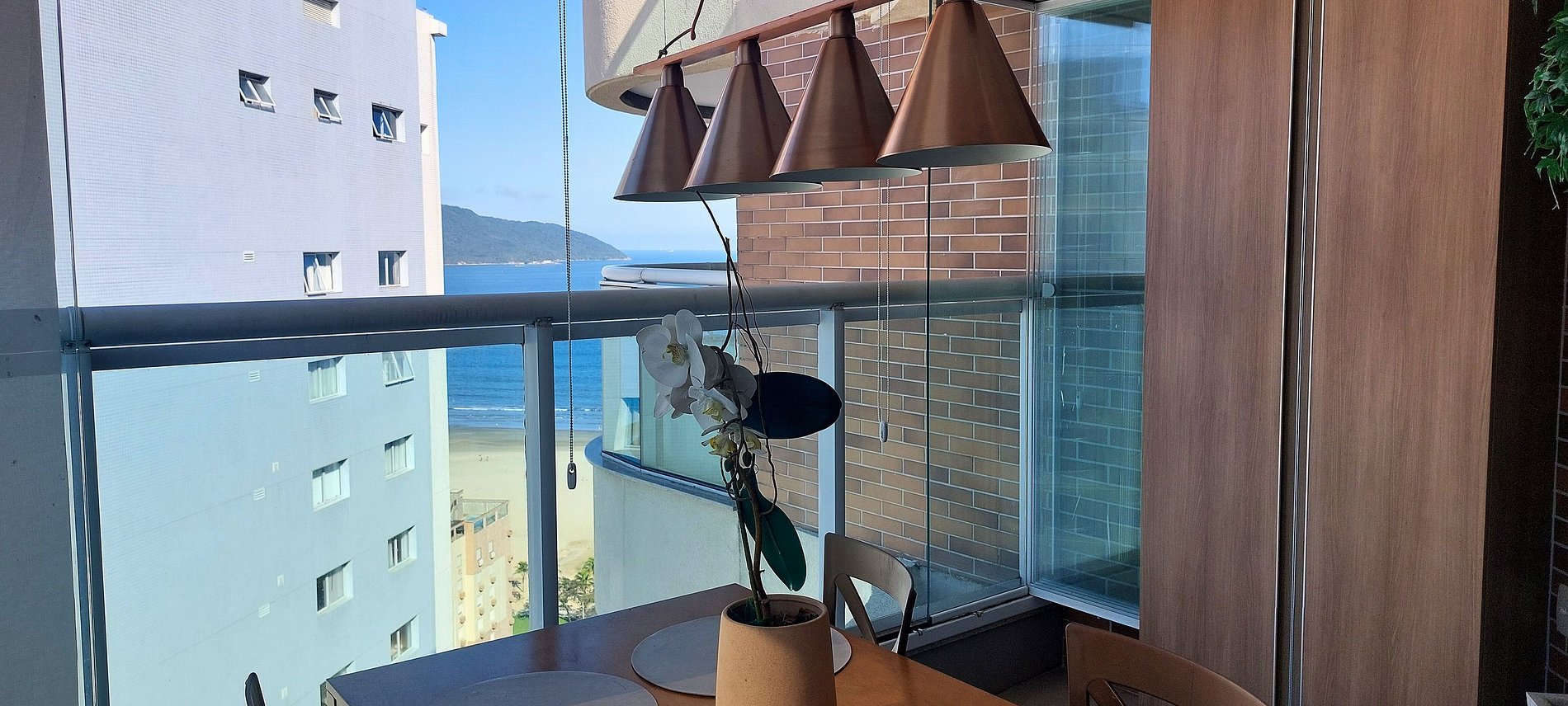 • Com 2 sacadas no 1º andar, sendo uma sacada envidraçada com vista lateral para o mar e outra sem envidraçamento atrás do sofá