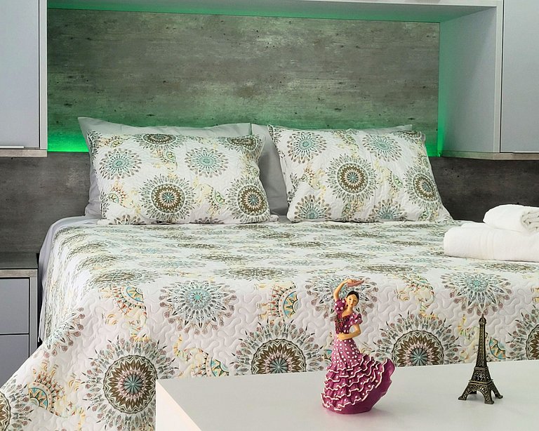 Moderno e aconchegante, com 50m², o estúdio é perfeito para até 4 pessoas.O espaço conta com uma cama queen, sofá com cama auxiliar e uma charmosa vista lateral para o mar. Ideal para relaxar ou explorar a cidade, o condomínio ainda oferece diversas comodidades para tornar sua estadia inesquecível.