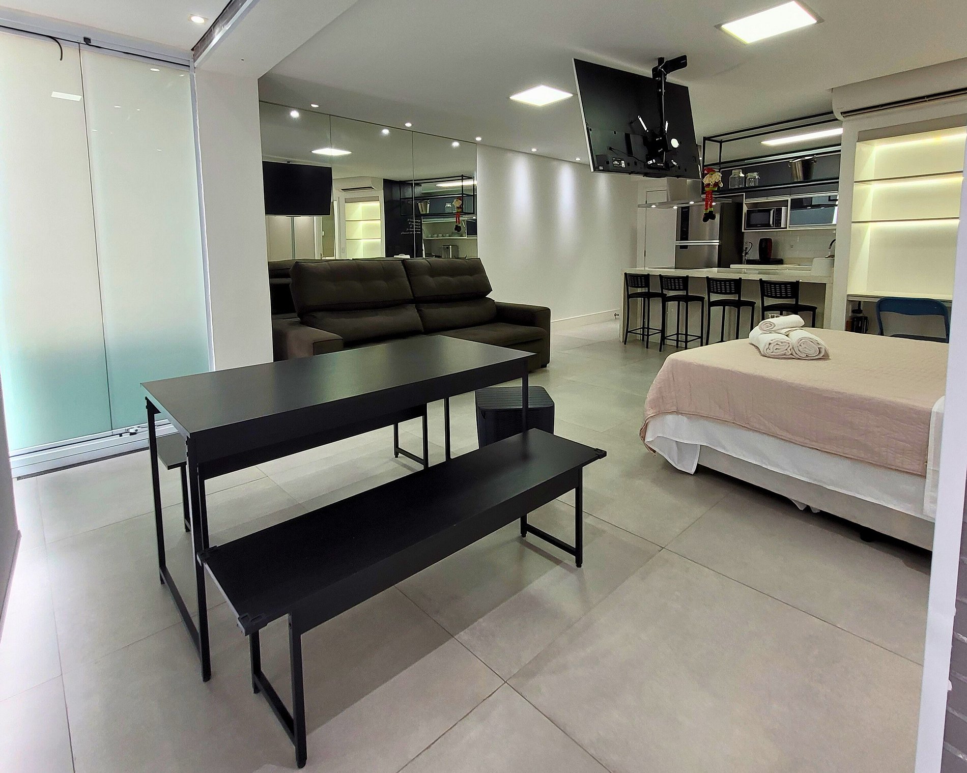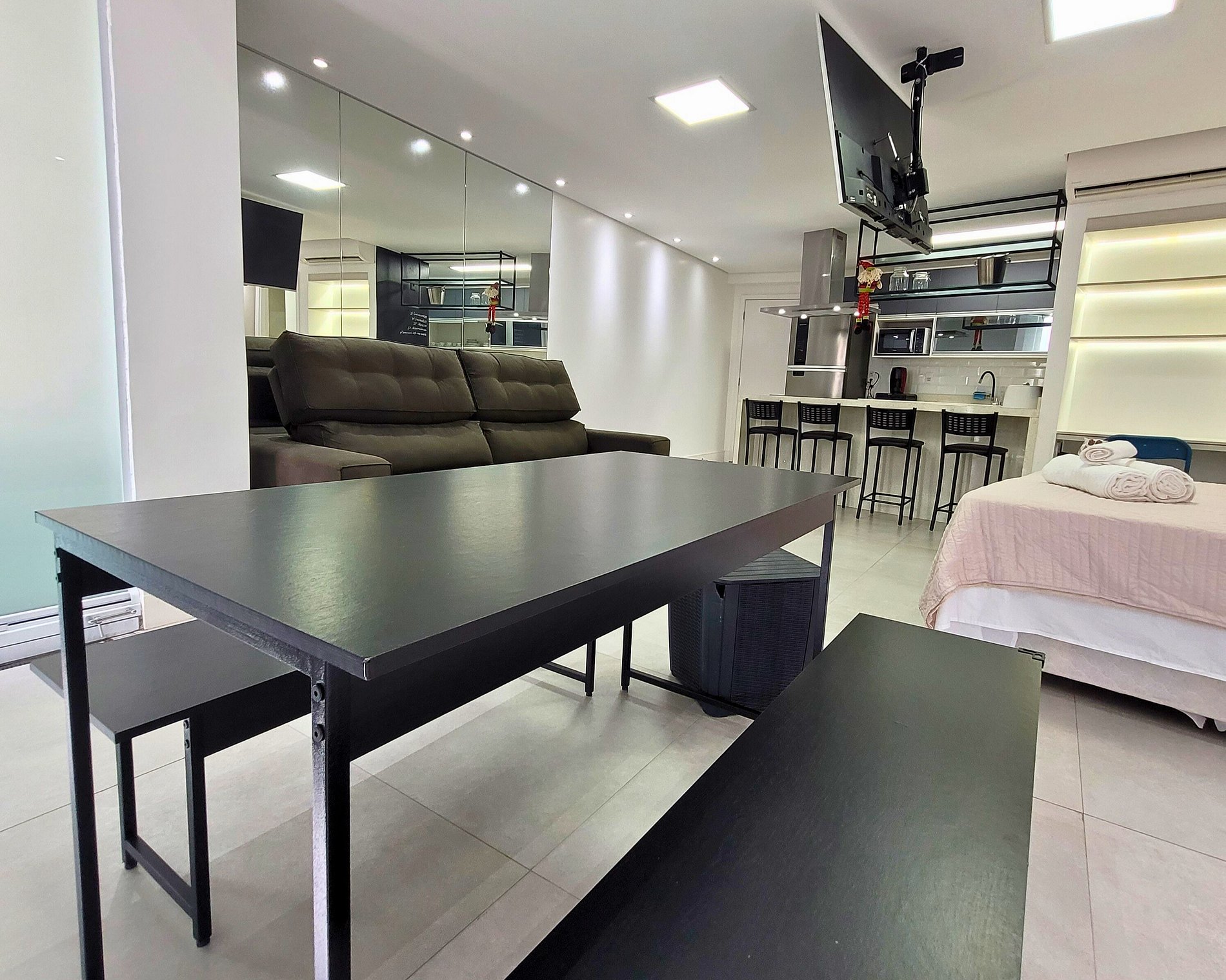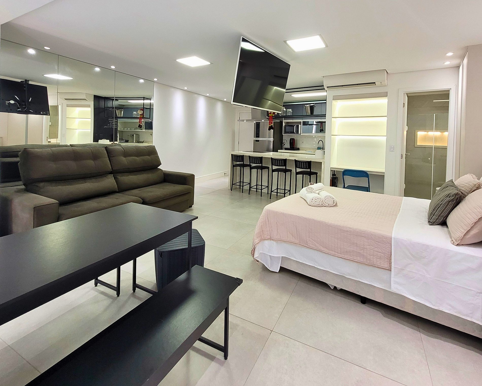 Com decoração clean, smart tv 65", Internet 600mb, Alexa, 1 vaga na garagem, 2 piscinas climatizadas em um ambiente moderno e bem equipado. Aproveite a paisagem única e uma estadia inesquecível no melhor condomínio!