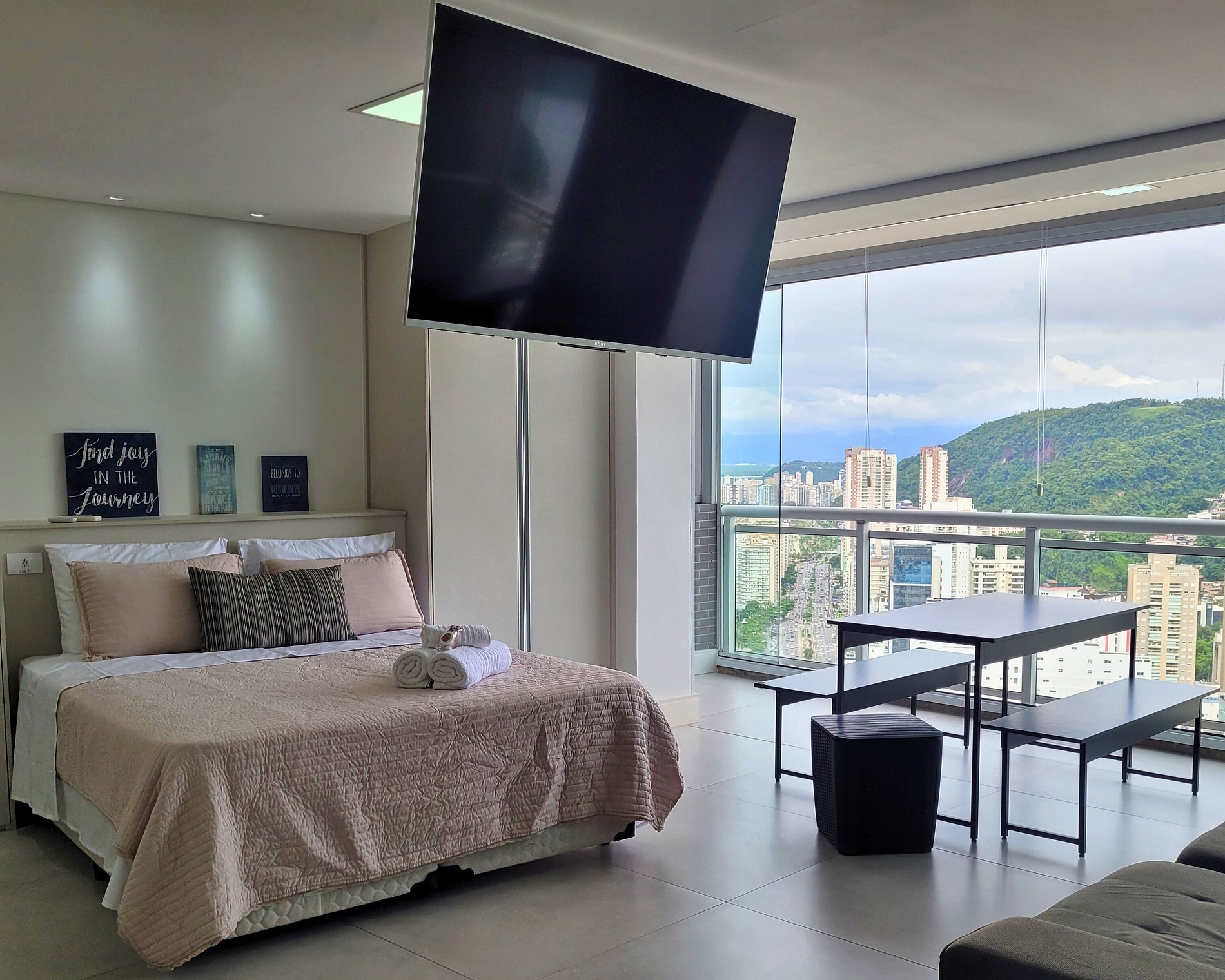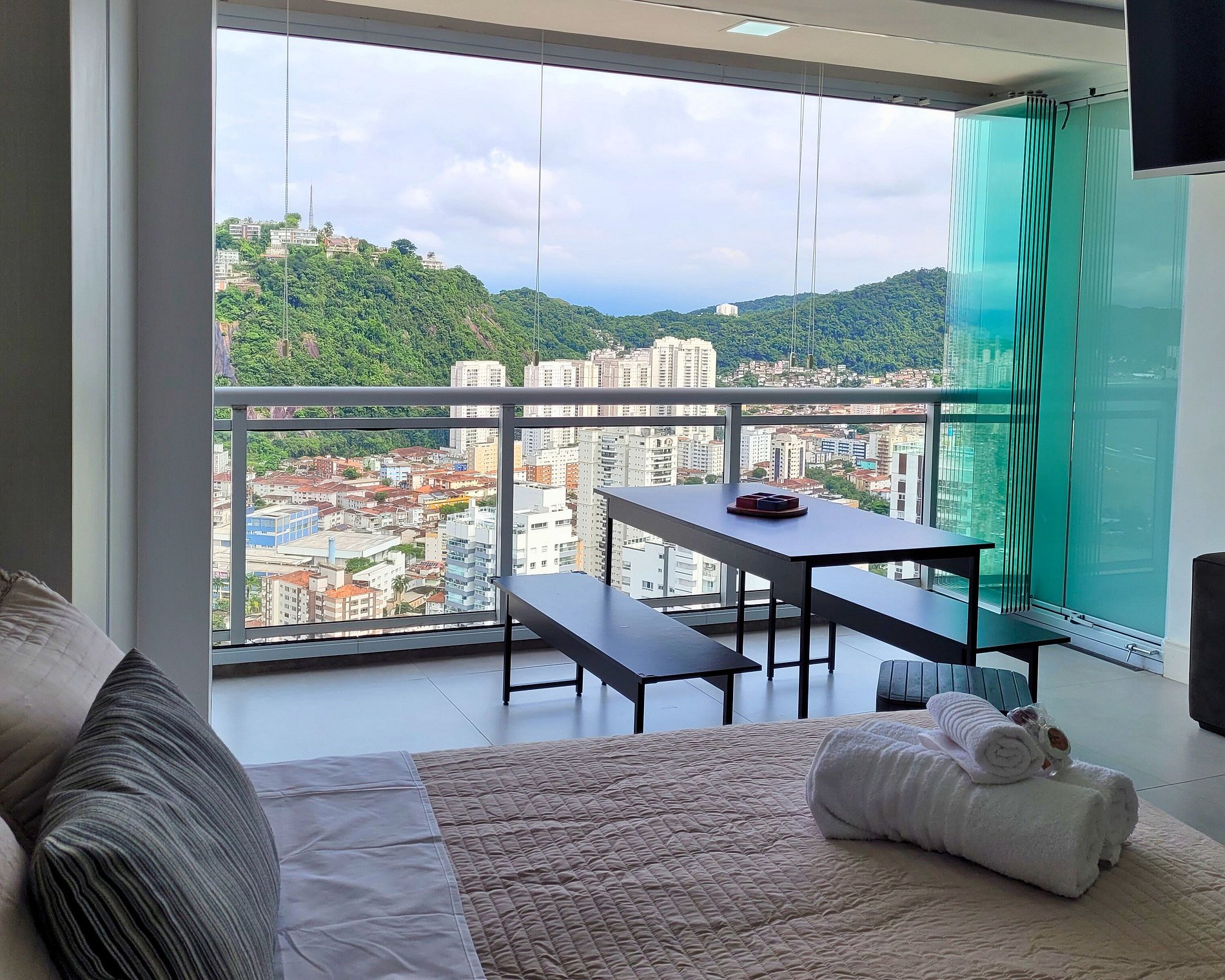 Estúdio com 55m² no 37º andar, último andar do Unlimited Ocean Front o prédio mais Alto de Santos, com uma vista deslumbrante para a cidade, o mar e montanha. Ideal para até 3 pessoas oferece 1 cama casal bipartida (2 camas de solteiro unidas) de 1,88m X 1,76m e 1 sofá retrátil.