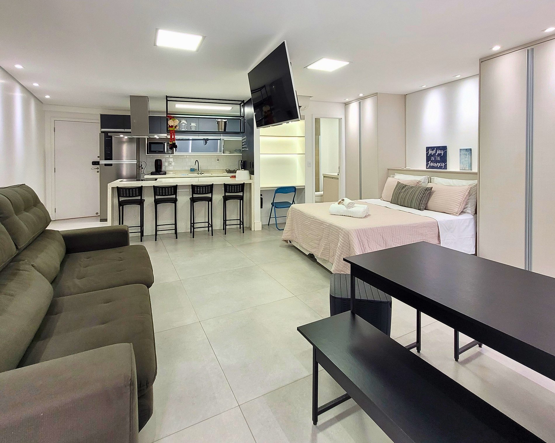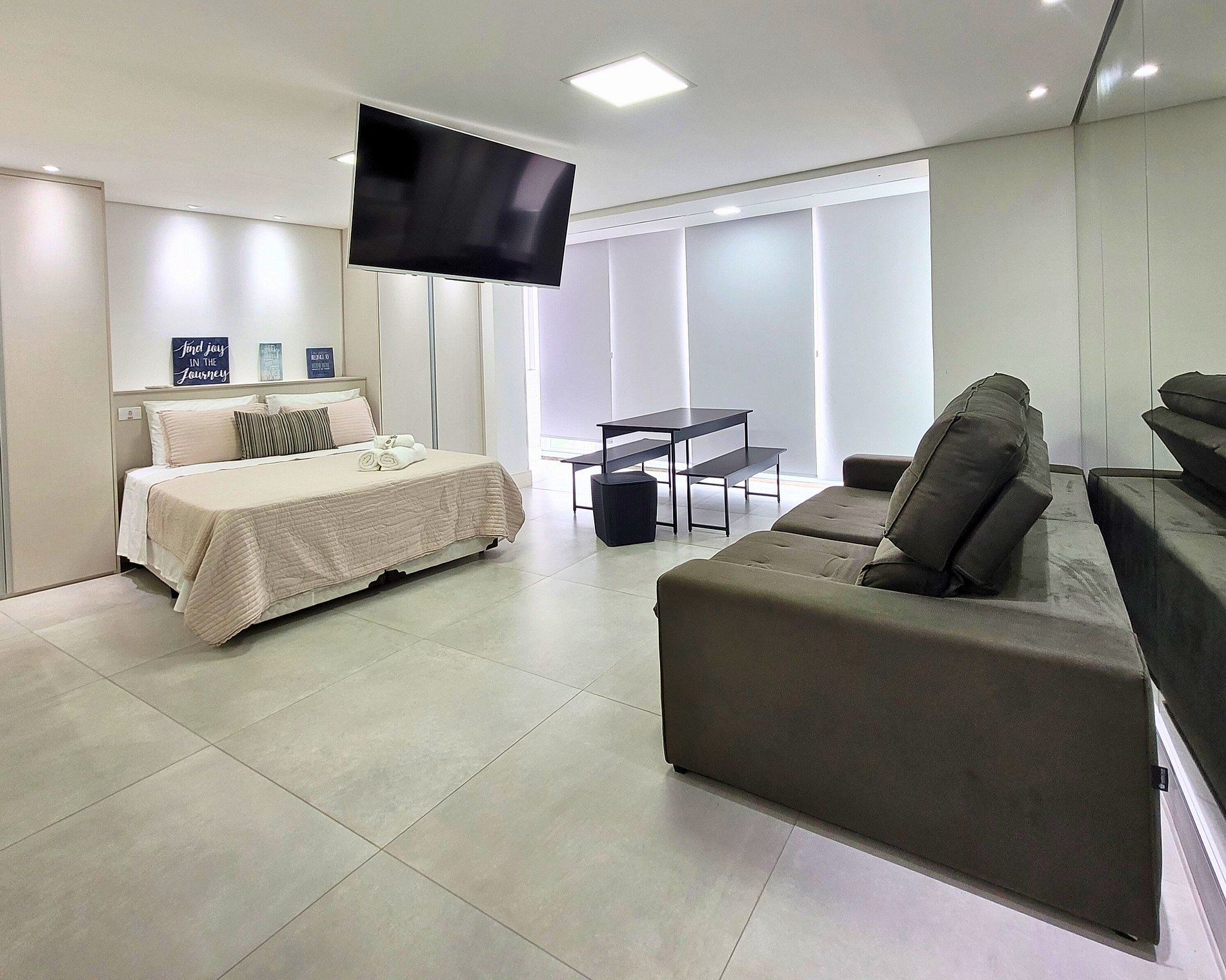 Com decoração clean, smart tv 65", Internet 600mb, Alexa, 1 vaga na garagem, 2 piscinas climatizadas em um ambiente moderno e bem equipado. Aproveite a paisagem única e uma estadia inesquecível no melhor condomínio!