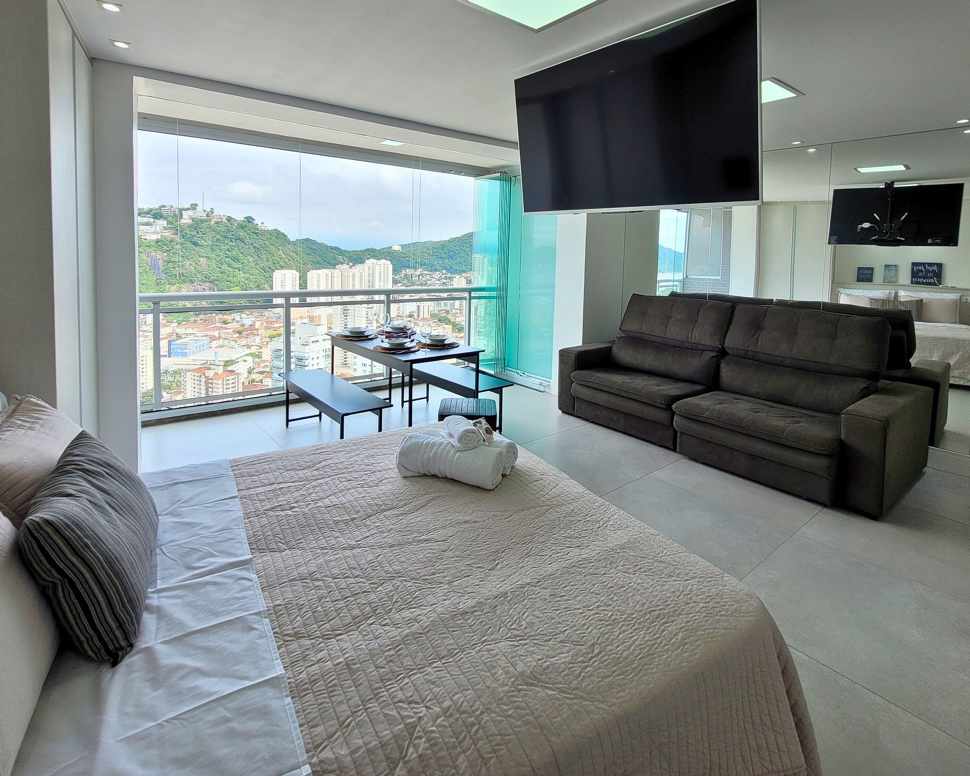 Estúdio com 55m² no 37º andar, último andar do Unlimited Ocean Front o prédio mais Alto de Santos, com uma vista deslumbrante para a cidade, o mar e montanha. Ideal para até 3 pessoas oferece 1 cama casal bipartida (2 camas de solteiro unidas) de 1,88m X 1,76m e 1 sofá retrátil.