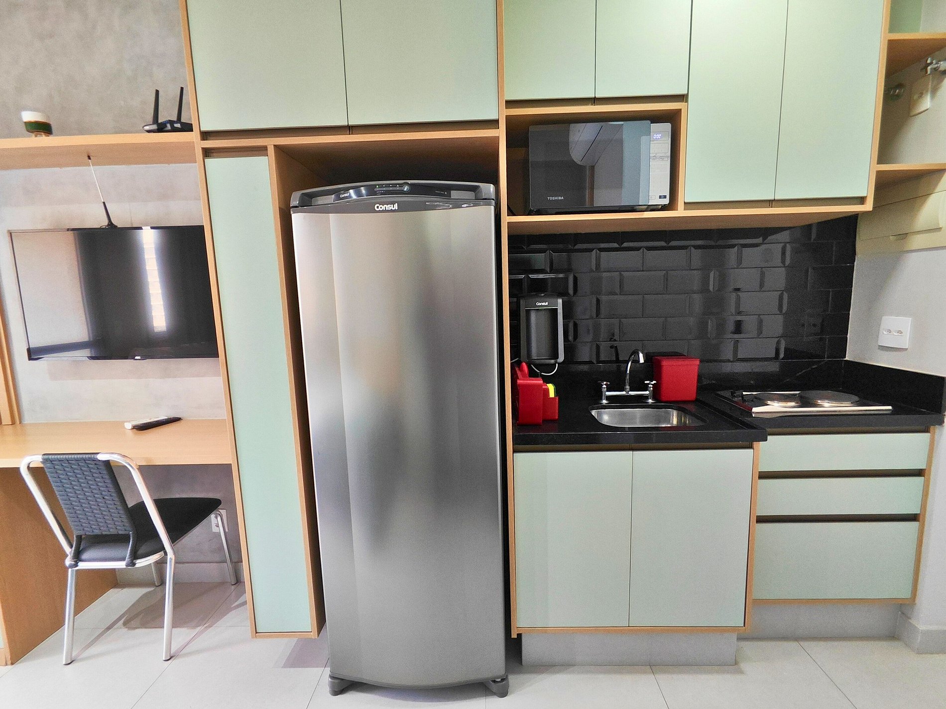 A cozinha compacta possui um cooktop de duas bocas, geladeira e micro-ondas, bem como utensílios básicos de cozinha, pratos e talheres, perfeitos para preparar refeições rápidas.