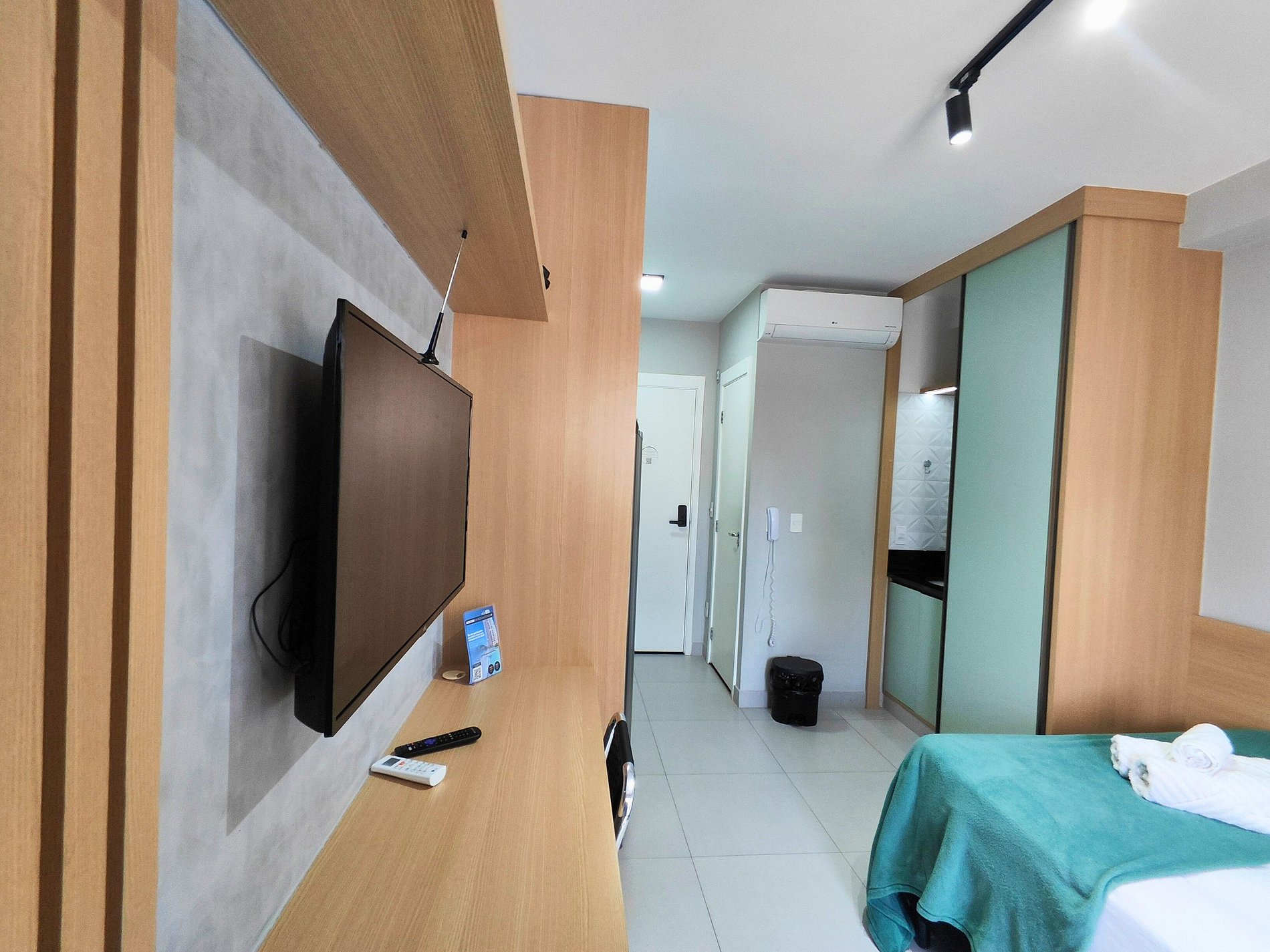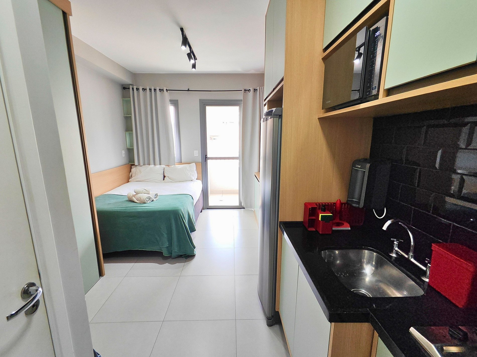 Além do estúdio, os hóspedes têm acesso a todas as comodidades do condomínio, incluindo piscina, academia, salão de jogos, lavanderia compartilhada e segurança 24 horas.