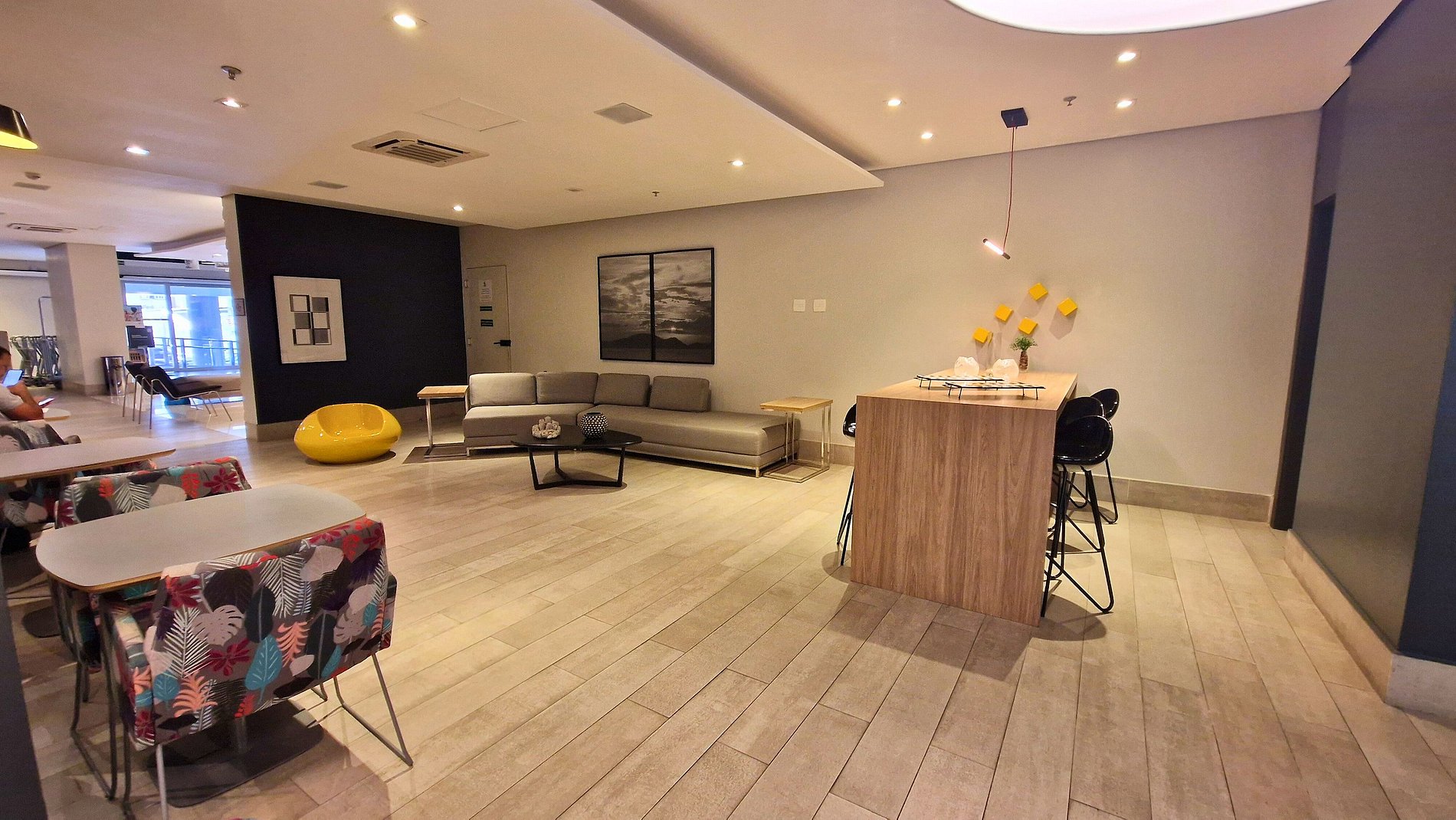 O condomínio Helbor Stay possui recepção 24h, estacionamento pago à parte com manobrista, piscina, academia, sauna para você relaxar após a praia ou após um dia de muito trabalho, além de contar com uma geladeira com bebidas e outros produtos para consumo imediato.