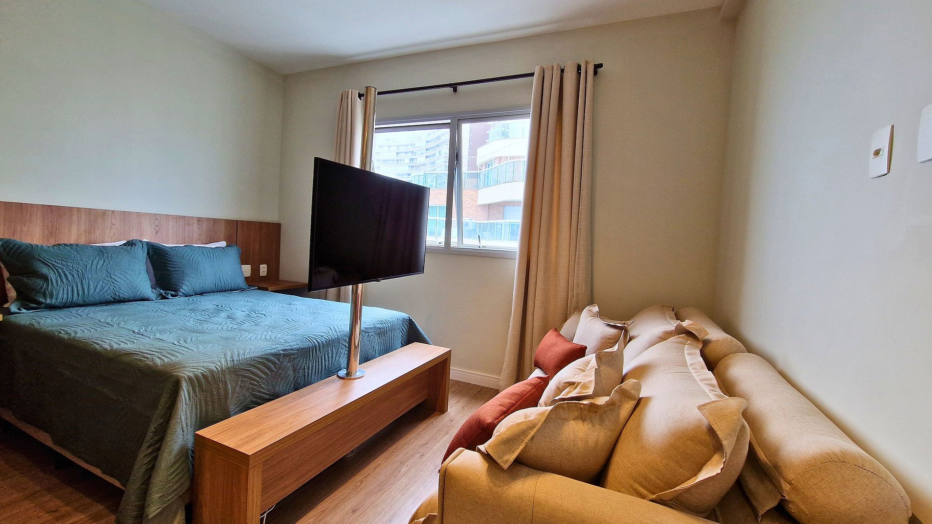 Ideal para casais ou famílias com uma criança pequena. Conta com cama de casal, sofá-cama 1,80x 1,05m, copa equipada (fogão, micro-ondas, frigobar, cafeteira), TV giratória e balcão para refeições.