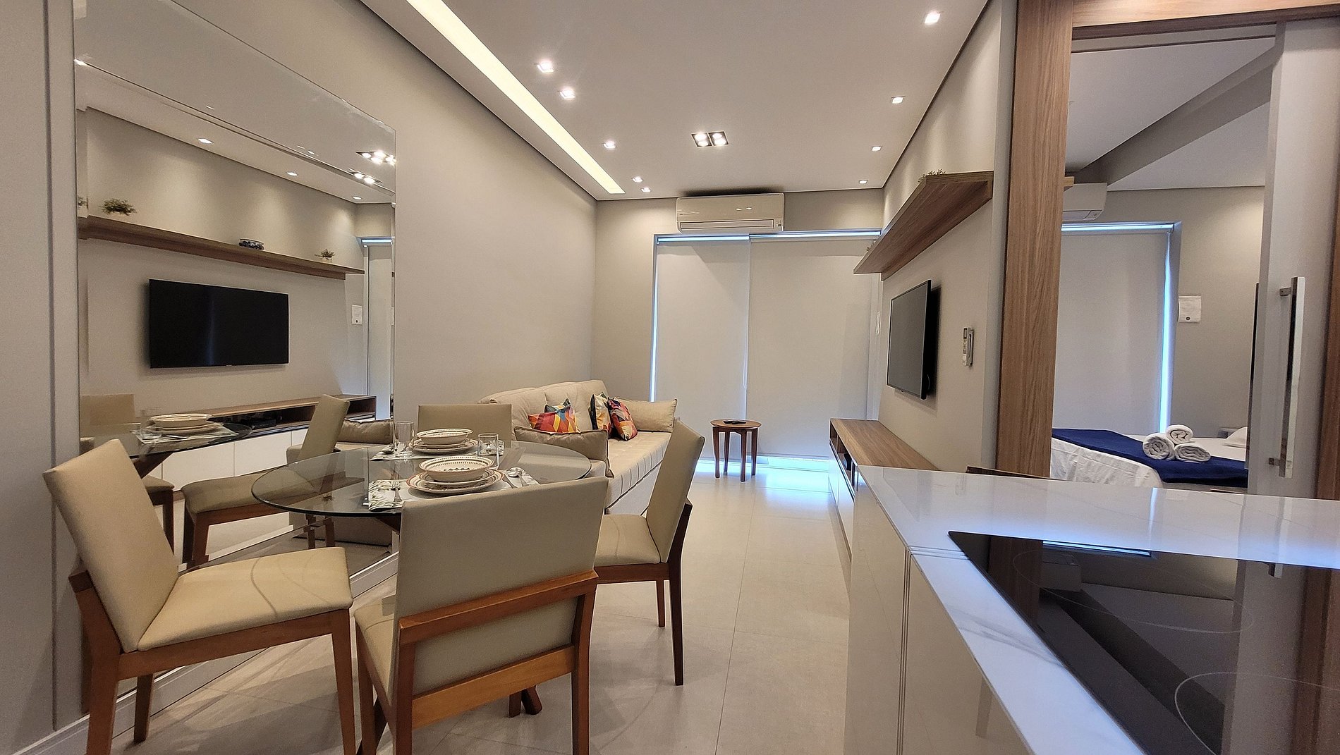 Tudo nos conforme. Ótimo condomínio, bom espaço. Recomendo! Como sugestão de melhoria, seria interessante instalar tomadas próximo da cama.