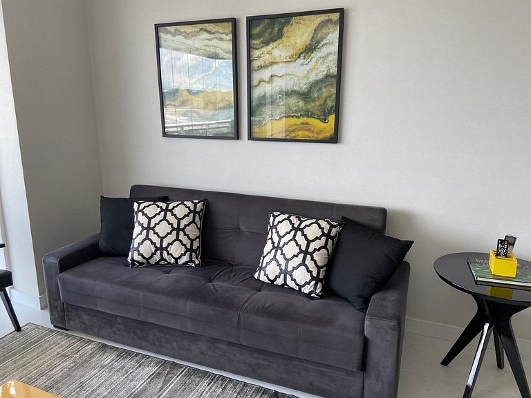 Com vista para o mar/Emissário e envidraçamento na sacada, o apartamento é amplo e perfeito para hospedagens de viagem ou para curtir a praia com a familia, acomodando até 4 pessoas em seus 54m².