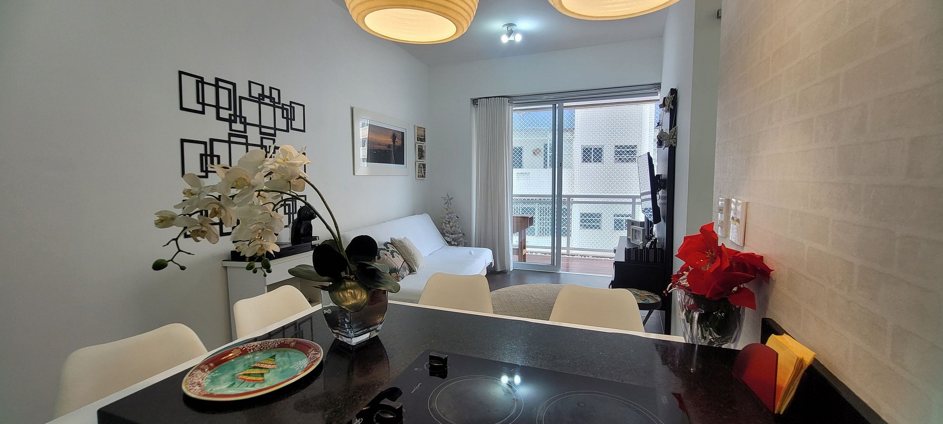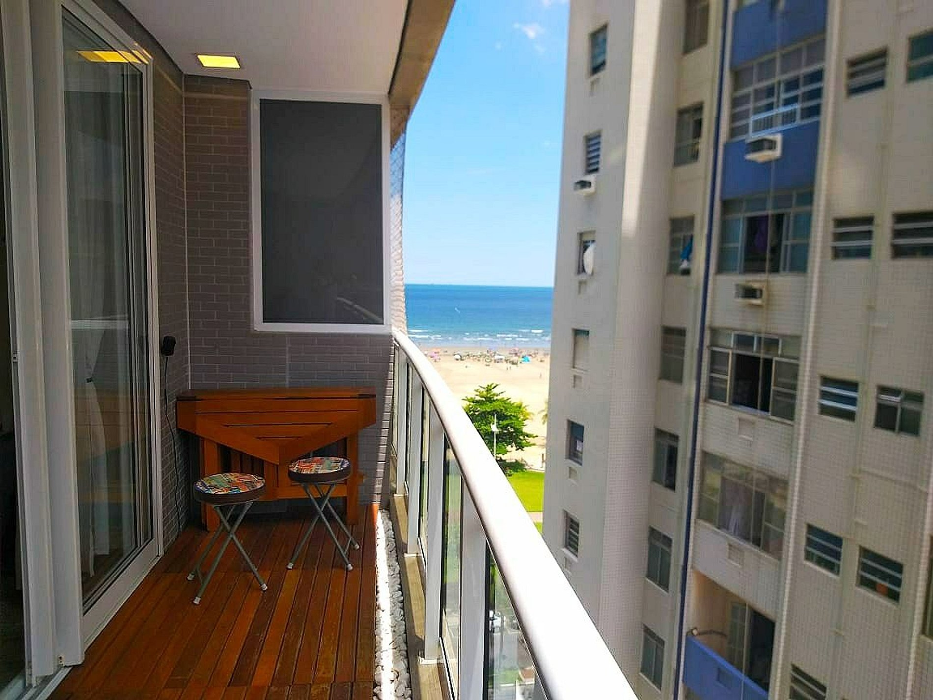 O apartamento possui tela de proteção na sacada, perfeito também para hóspedes com crianças