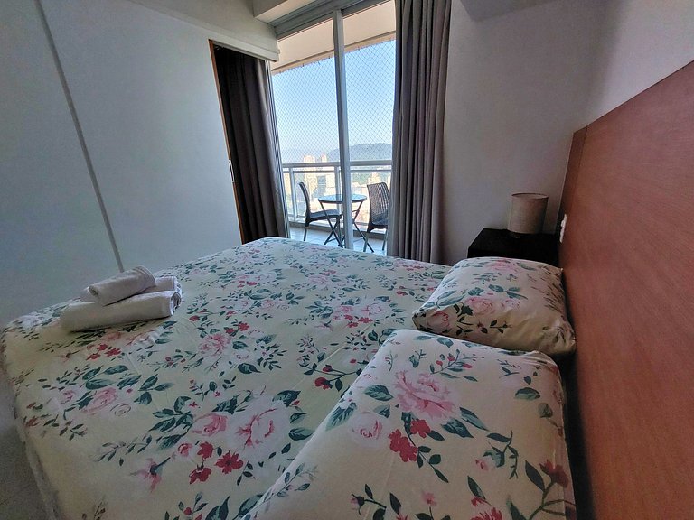 O apartamento 3411 possui vista para o mar/ Emissário e acomoda até 4 pessoas pois há: 1 cama de casal, 1 sofá cama de 1,27x2,00m e uma poltrona que se transforma em colchão com 1,88x0,88m, além de ser perfeito para hospedagens com crianças pois há tela de proteção na sacada.