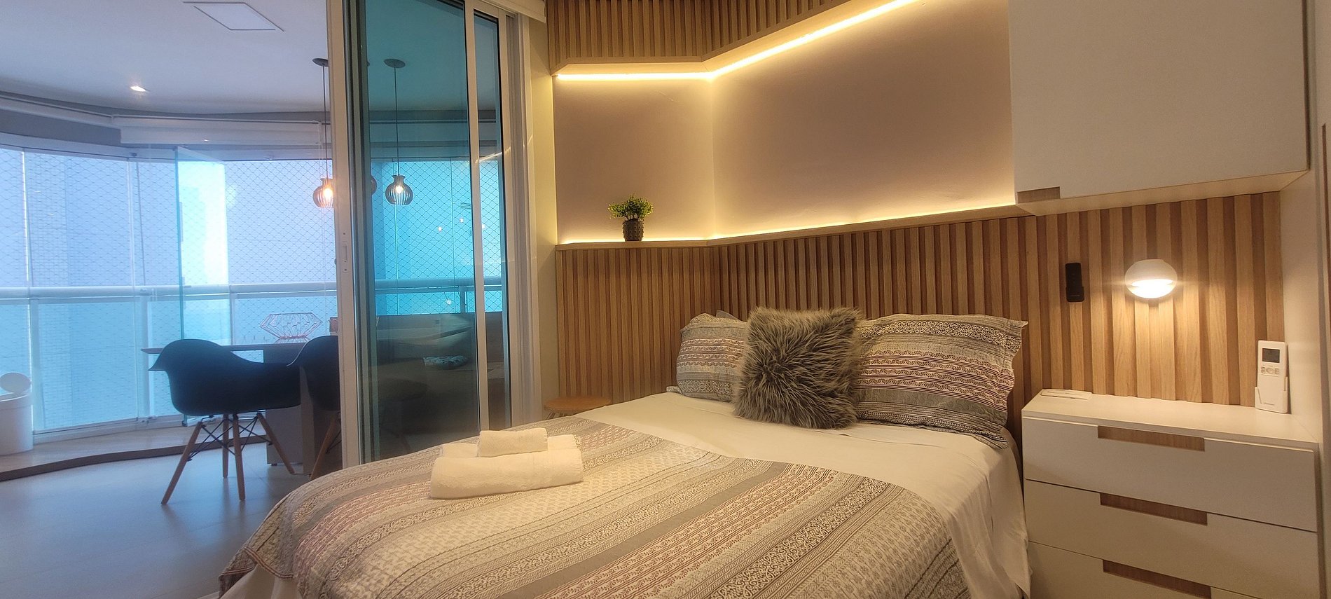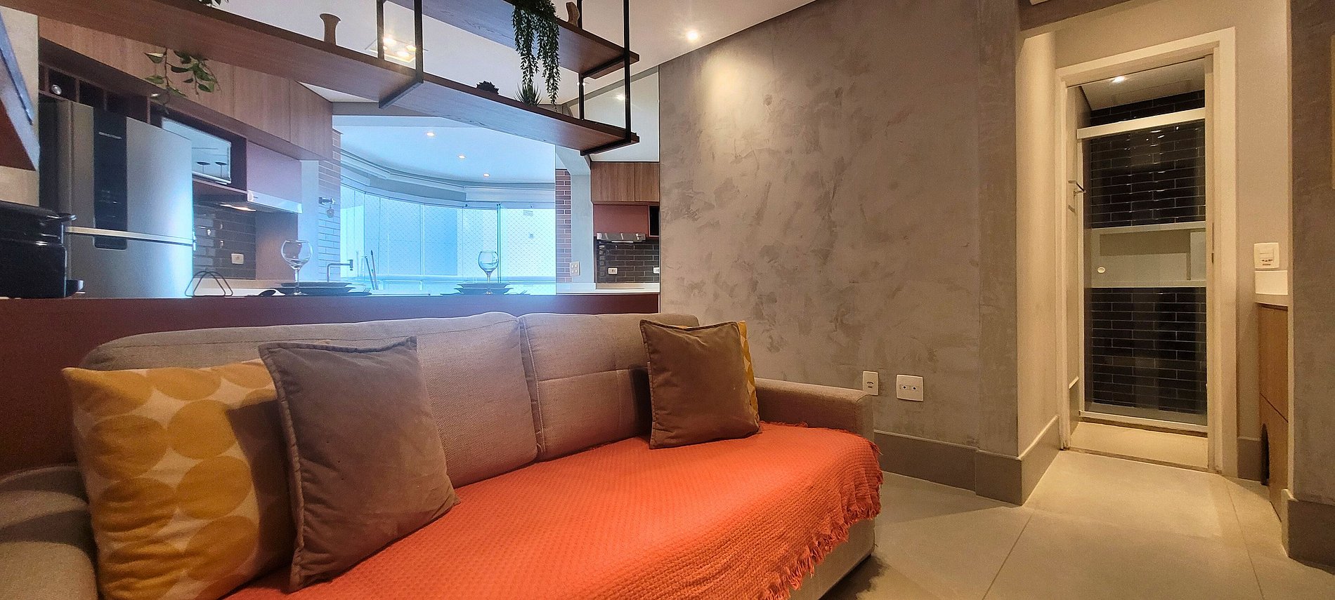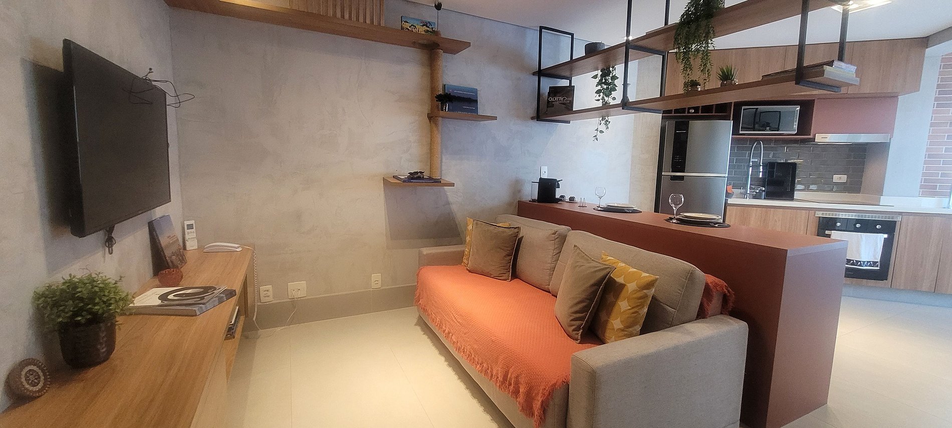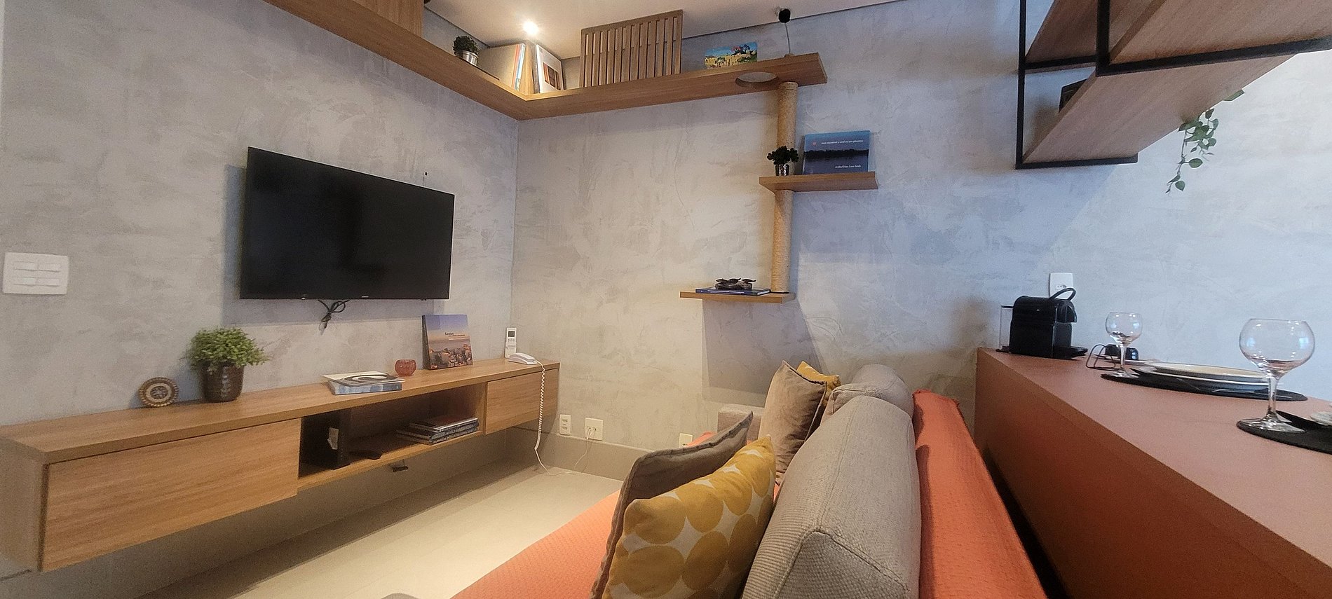 O apartamento possui 45 m² e foi todo reformado pelo arquiteto Felipe Torelli o que confere exclusividade, charme e funcionalidades únicas. Equipado com cooktop por indução, forno elétrico, persiana elétrica no quarto, envidraçamento na varanda e vista parcial do mar, o espaço é indicado para casais e viajantes de negócios, comporta um terceiro adulto ou até 2 crianças.