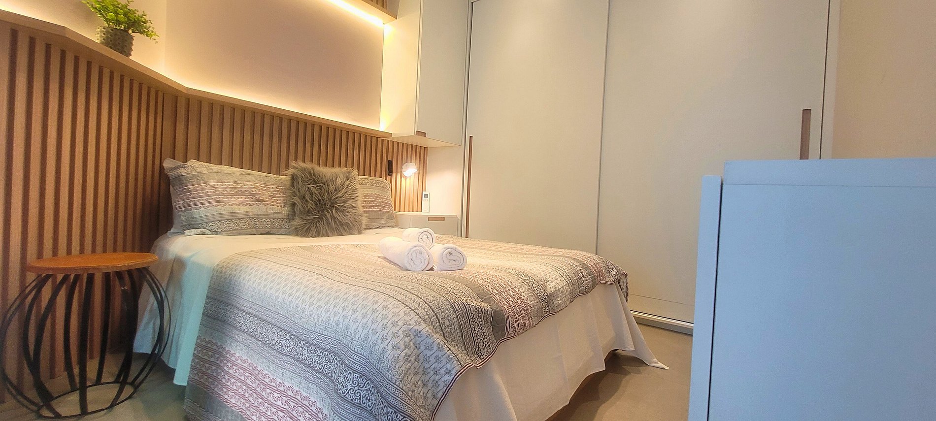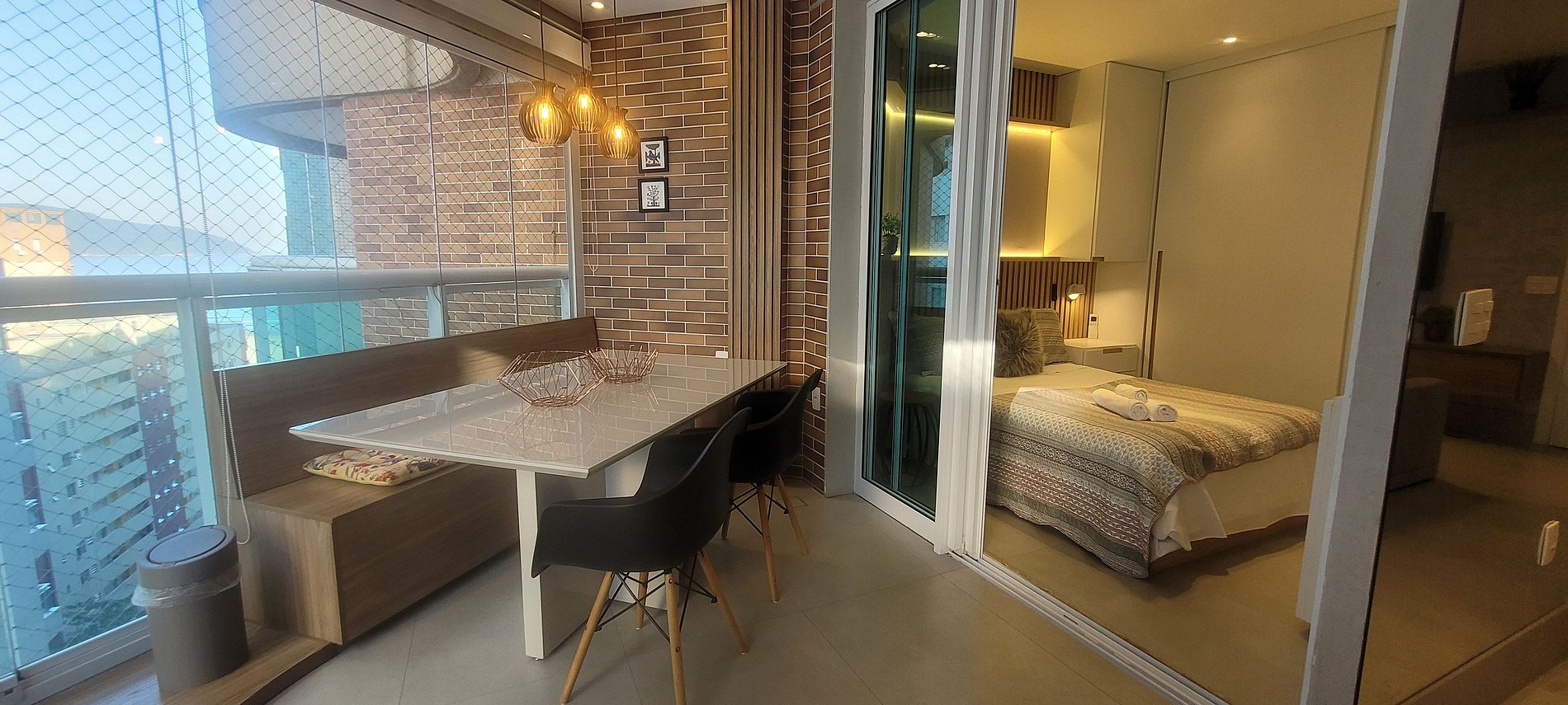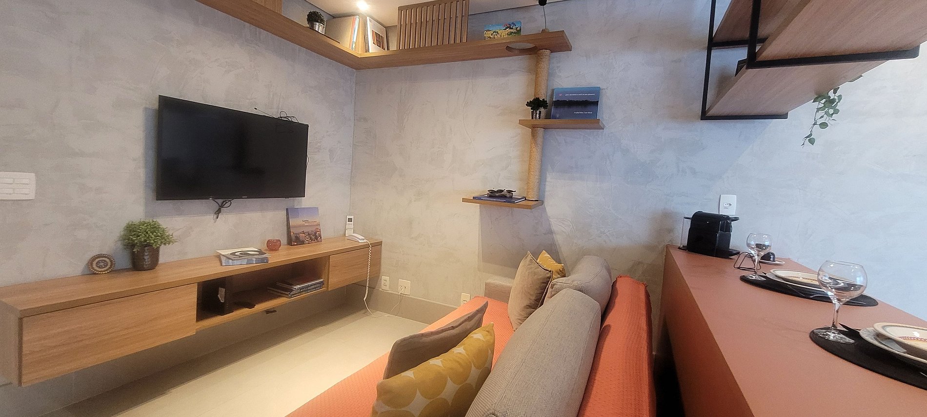 O apartamento possui 45 m² e foi todo reformado pelo arquiteto Felipe Torelli o que confere exclusividade, charme e funcionalidades únicas. Equipado com cooktop por indução, forno elétrico, persiana elétrica no quarto, envidraçamento na varanda e vista parcial do mar, o espaço é indicado para casais e viajantes de negócios, comporta um terceiro adulto ou até 2 crianças.