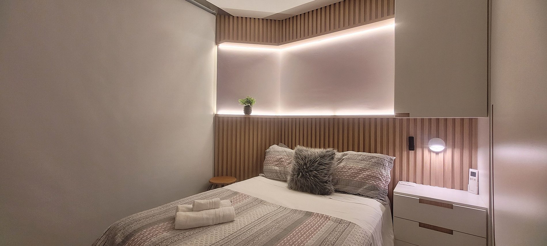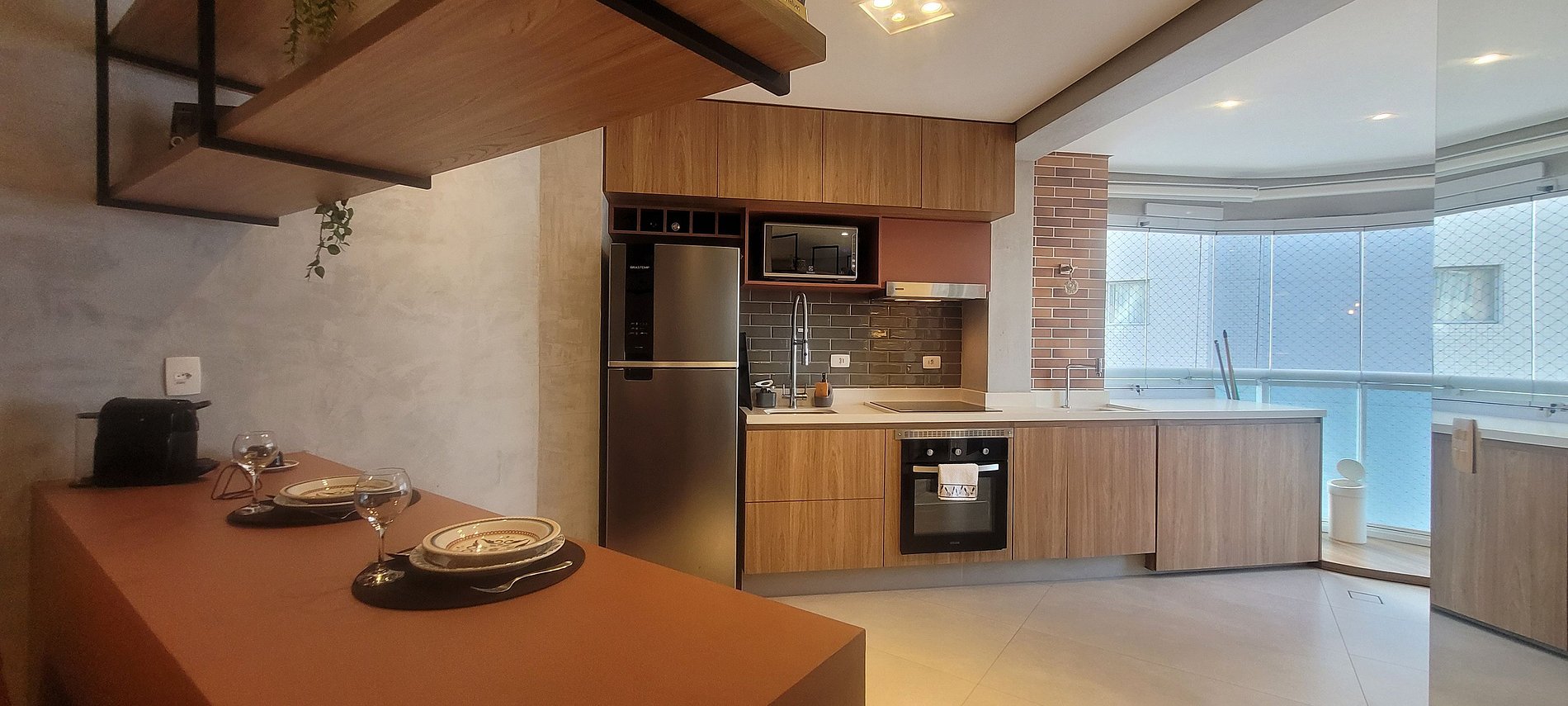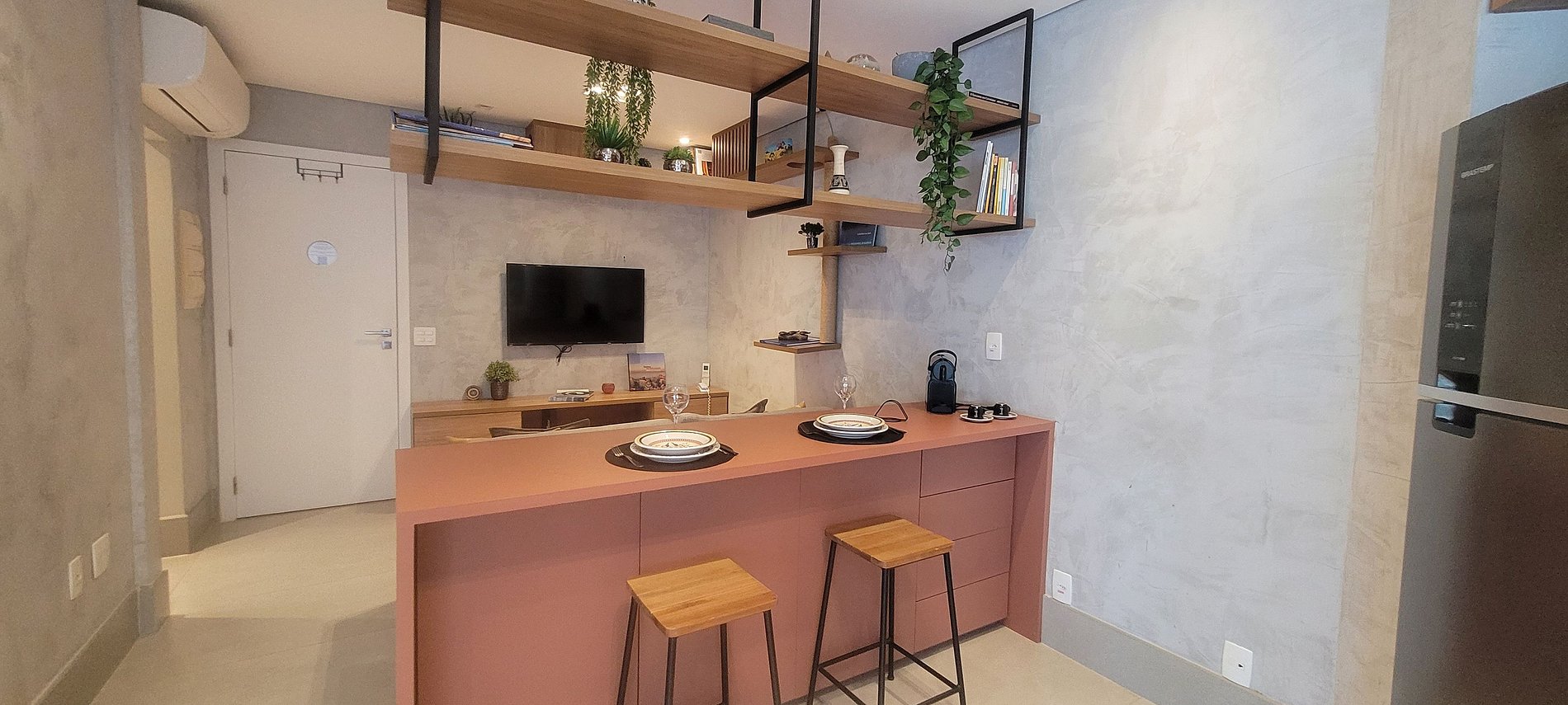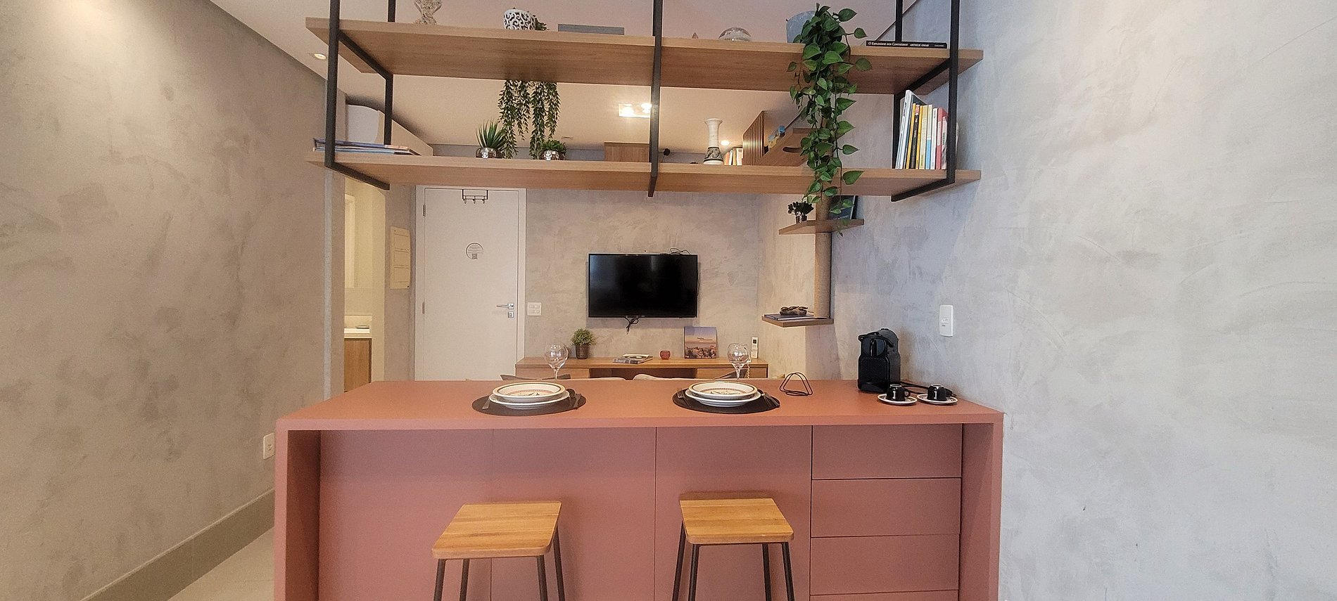 O apartamento possui 45 m² e foi todo reformado pelo arquiteto Felipe Torelli o que confere exclusividade, charme e funcionalidades únicas. Equipado com cooktop por indução, forno elétrico, persiana elétrica no quarto, envidraçamento na varanda e vista parcial do mar, o espaço é indicado para casais e viajantes de negócios, comporta um terceiro adulto ou até 2 crianças.