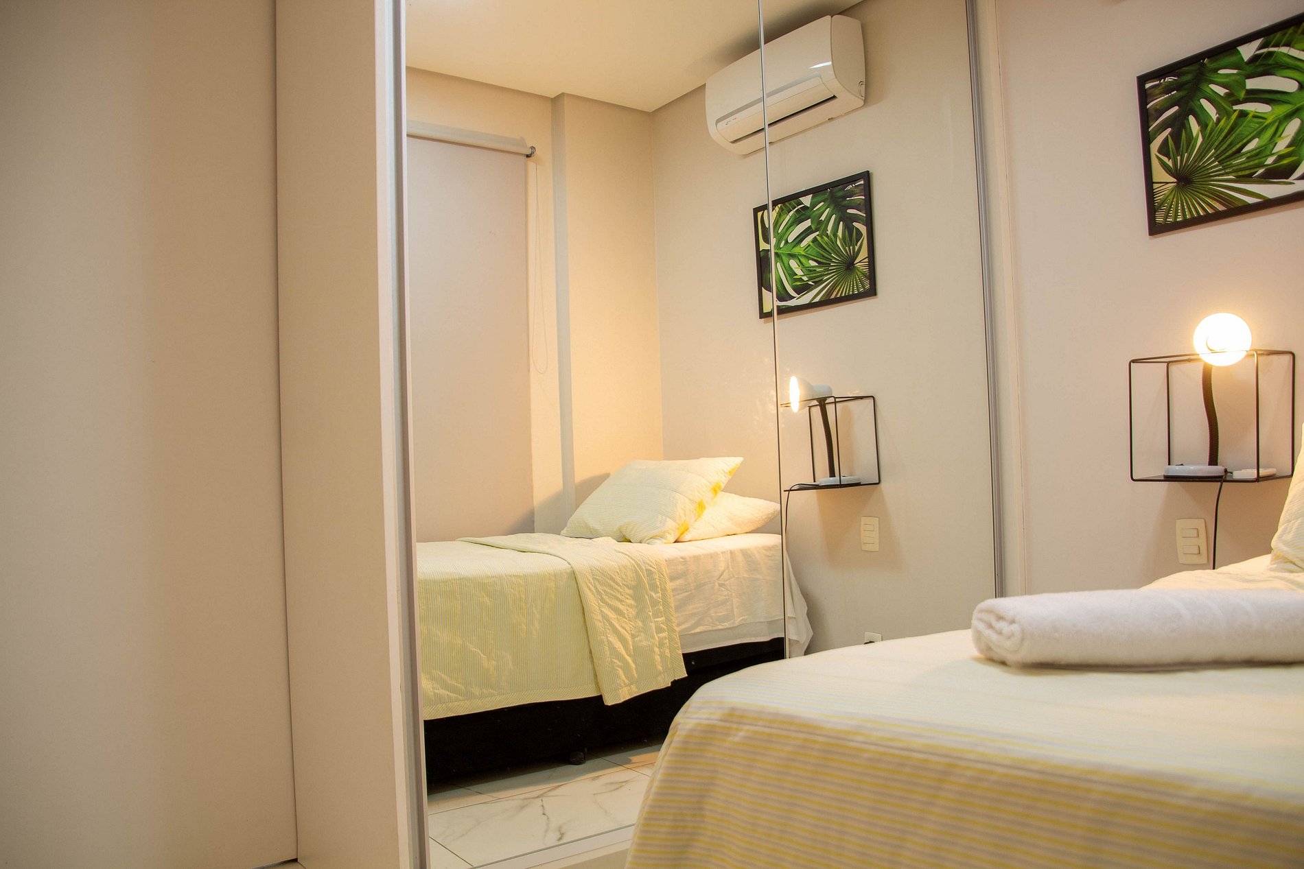 • com uma área total de 69 m², possui 2 quartos, na suíte será possível acordar com essa vista graças a uma pequena sacada privativa, no outro quarto há uma cama de solteiro com auxiliar.