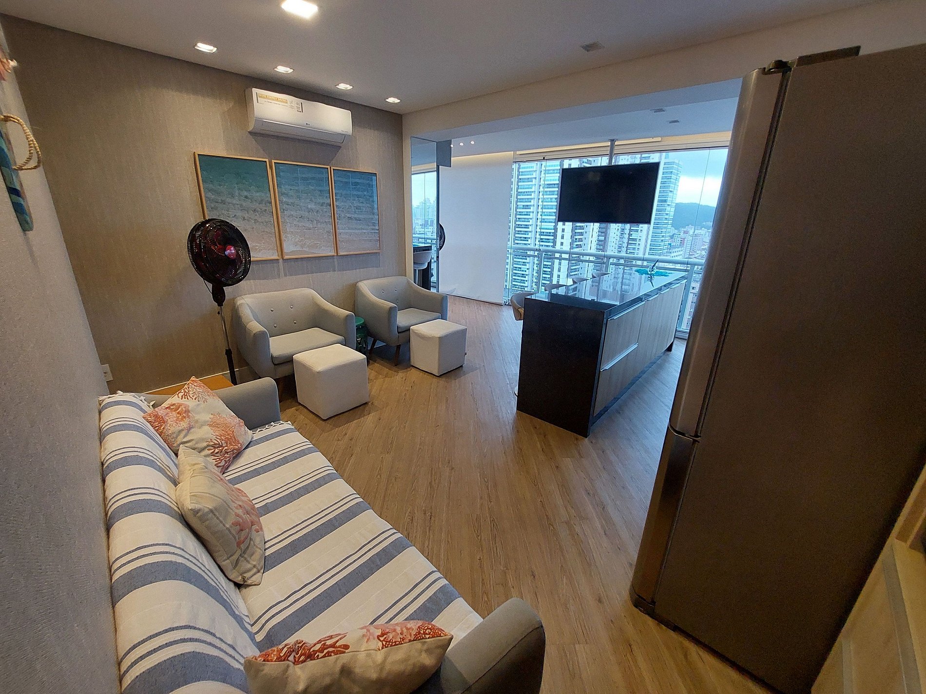 Apto mto bem decorado, bem equipado e tudo funcionando...Tem vistas bonitas, 2 Quartos com Ar condicionado e salas tbm...o quarto do meio somente com Ventilador. Televisão da Sala com imagem mto boa, Persianas automatizadas funcionando perfeitamente...e por ser último apto do corredor, vc tem um conforto acústico bem mais privilegiado comparativamente às outras unidades do prédio. Valeu a pena!