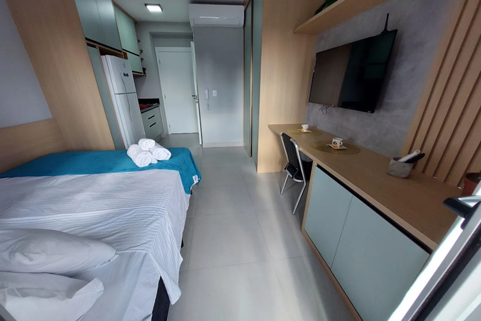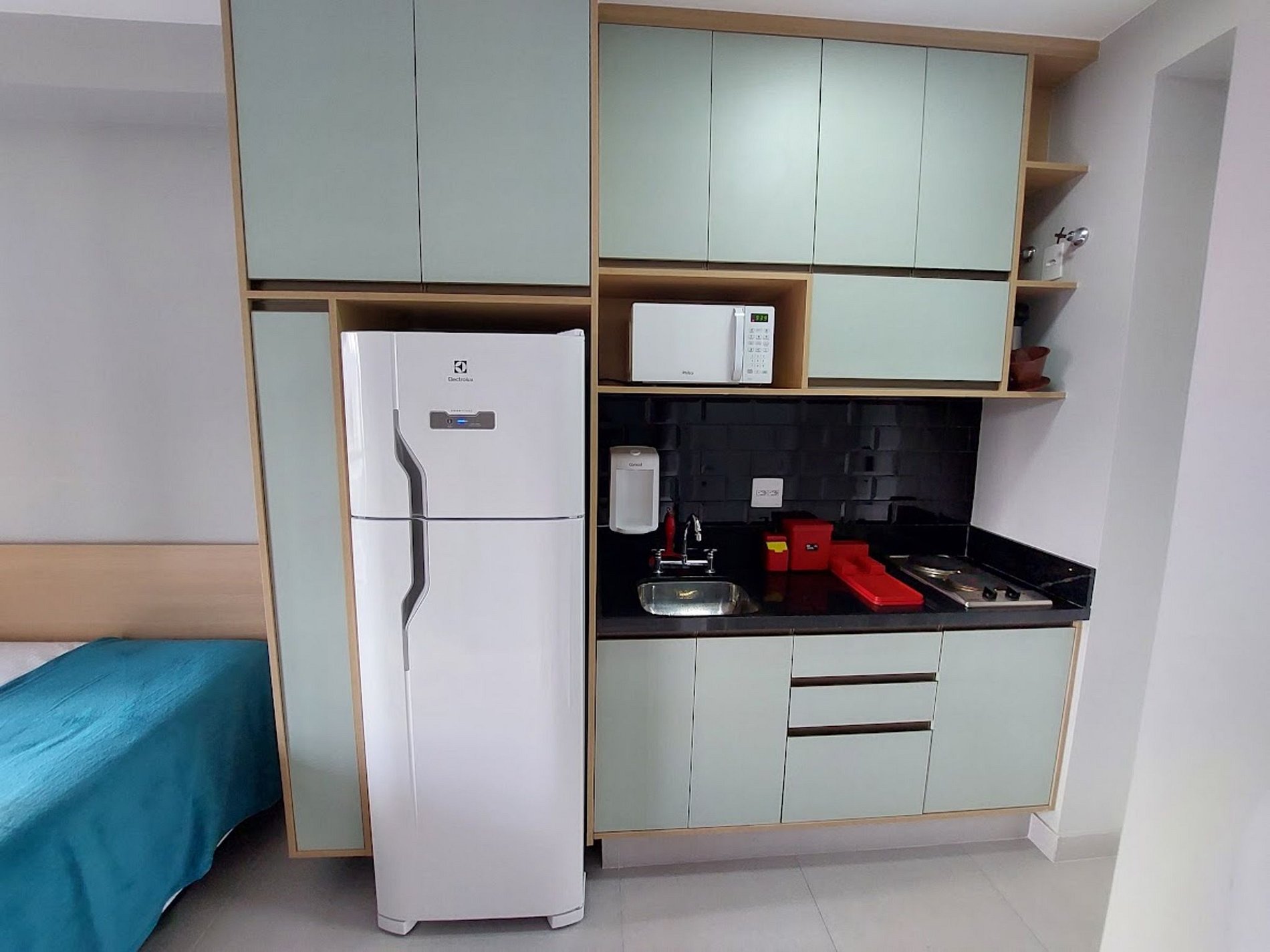 Além do estúdio, os hóspedes têm acesso a todas as comodidades do condomínio, incluindo piscina, academia, salão de jogos, lavanderia compartilhada e segurança 24 horas.
