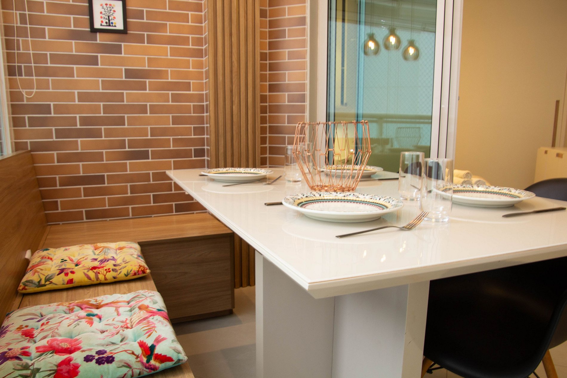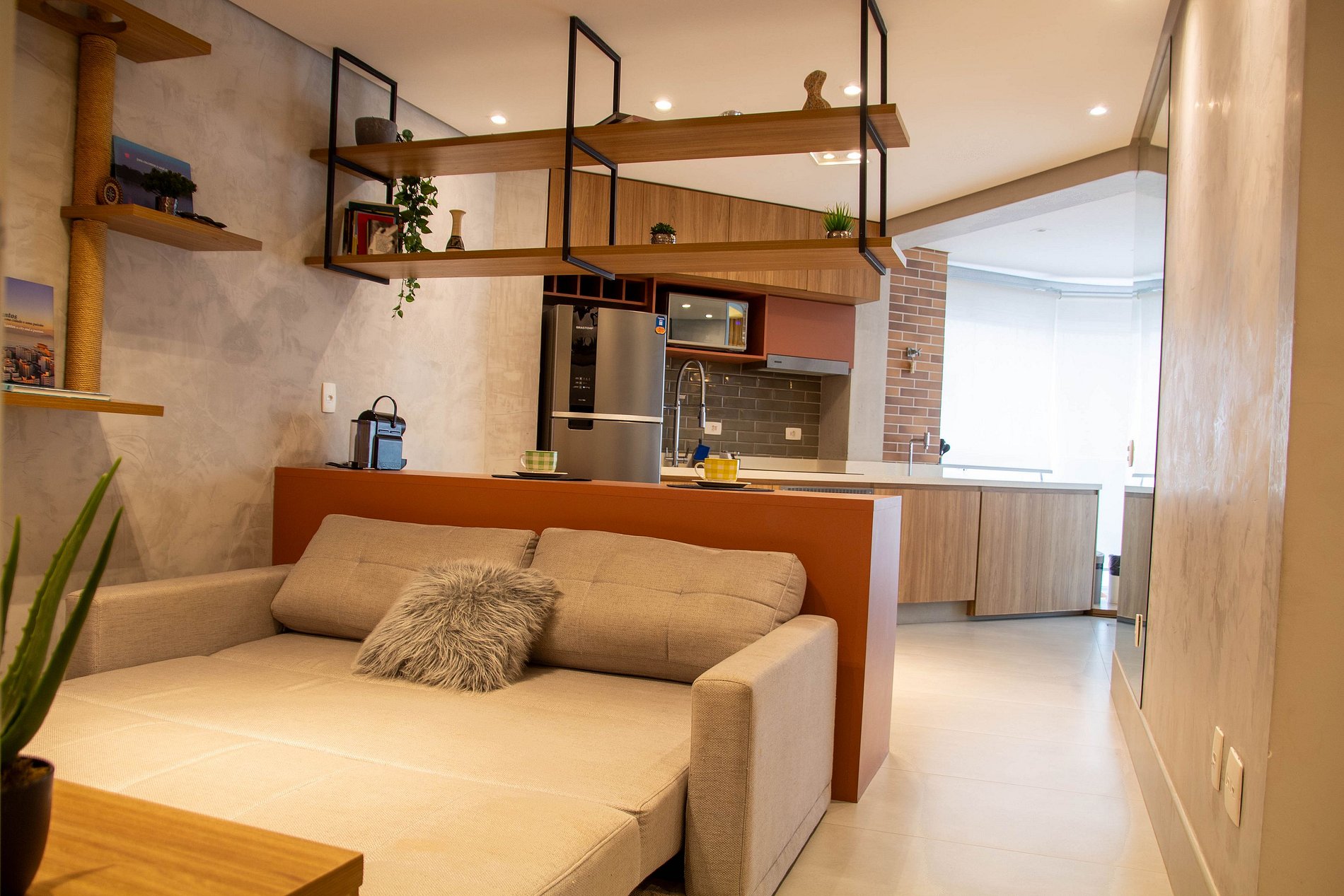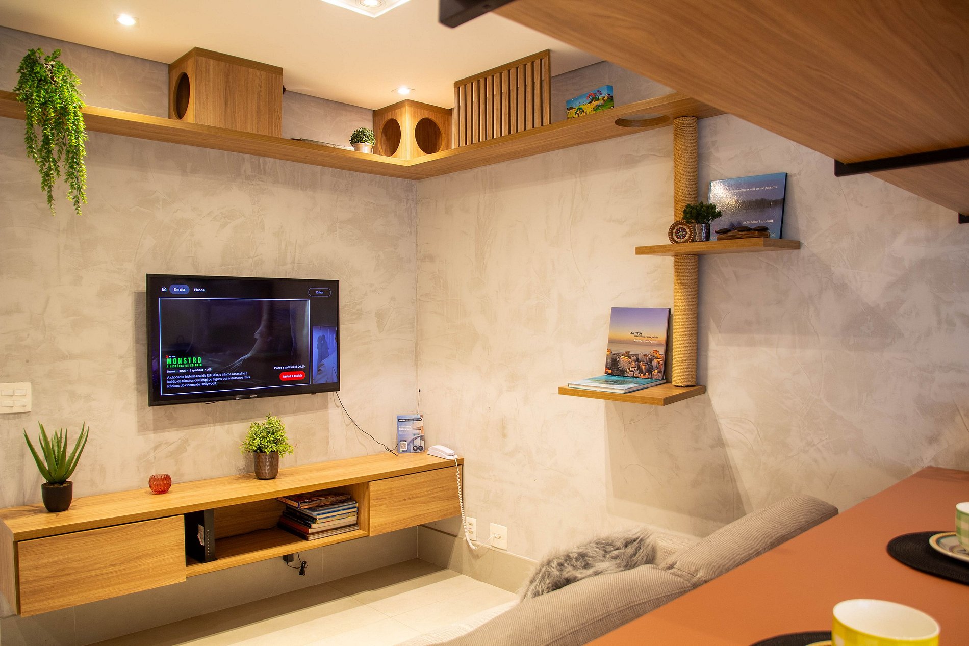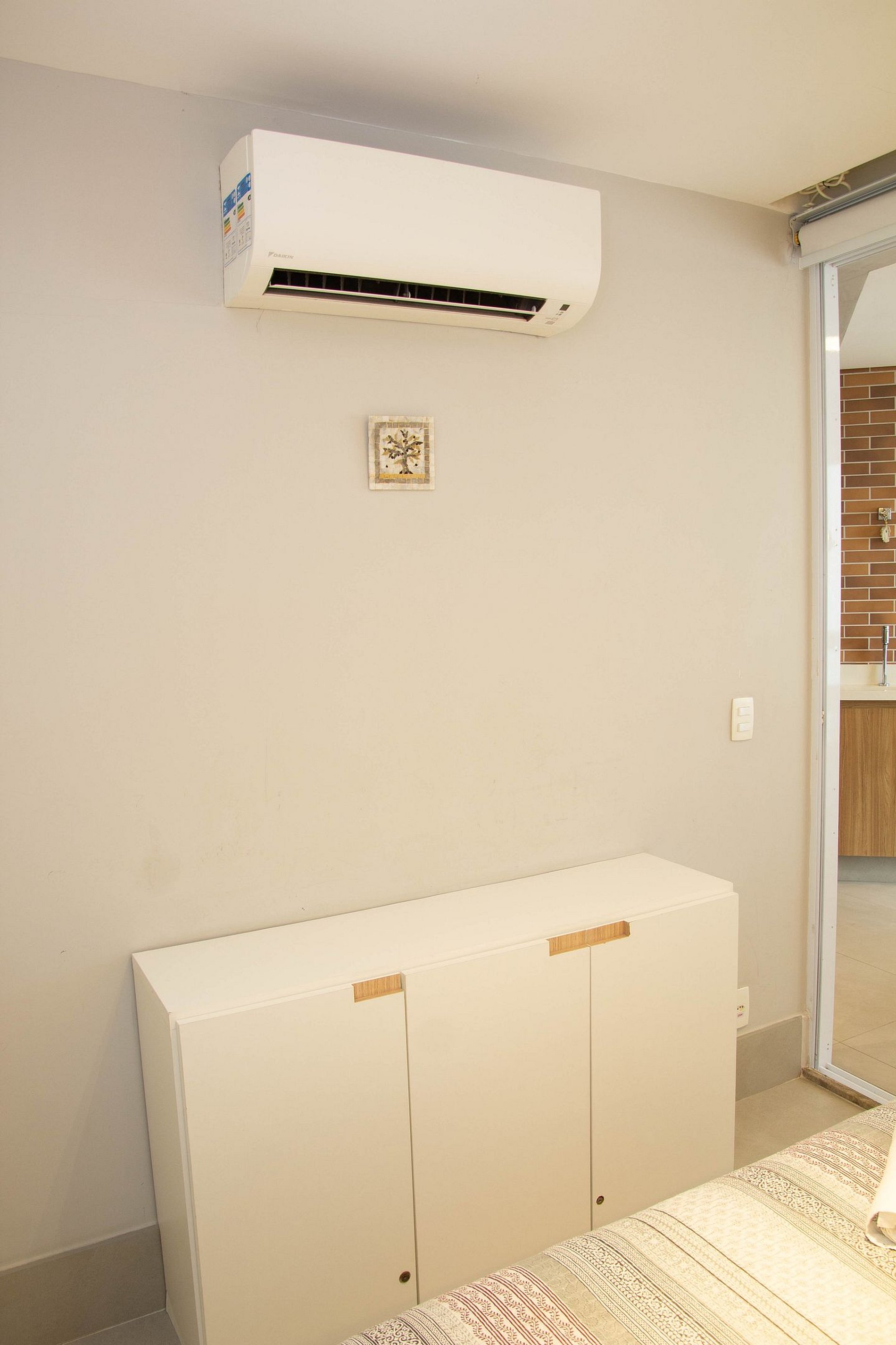O apartamento possui 45 m² e foi todo reformado pelo arquiteto Felipe Torelli o que confere exclusividade, charme e funcionalidades únicas. Equipado com cooktop por indução, forno elétrico, persiana elétrica no quarto, envidraçamento na varanda e vista parcial do mar, o espaço é indicado para casais e viajantes de negócios, comporta um terceiro adulto ou até 2 crianças.