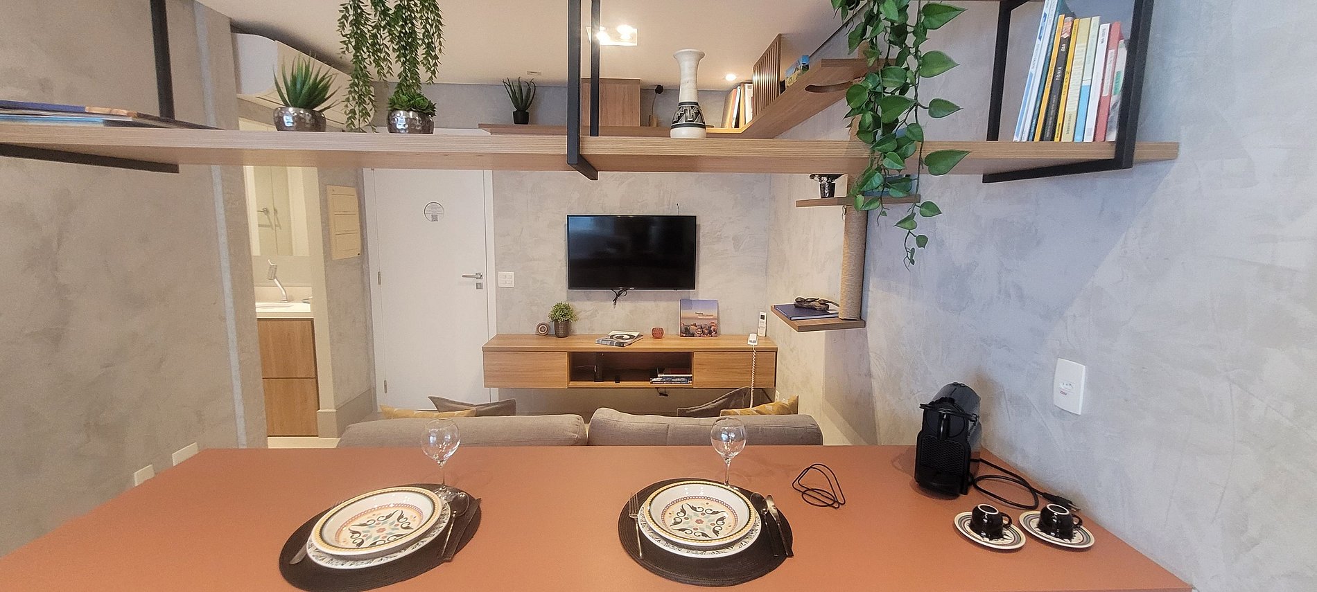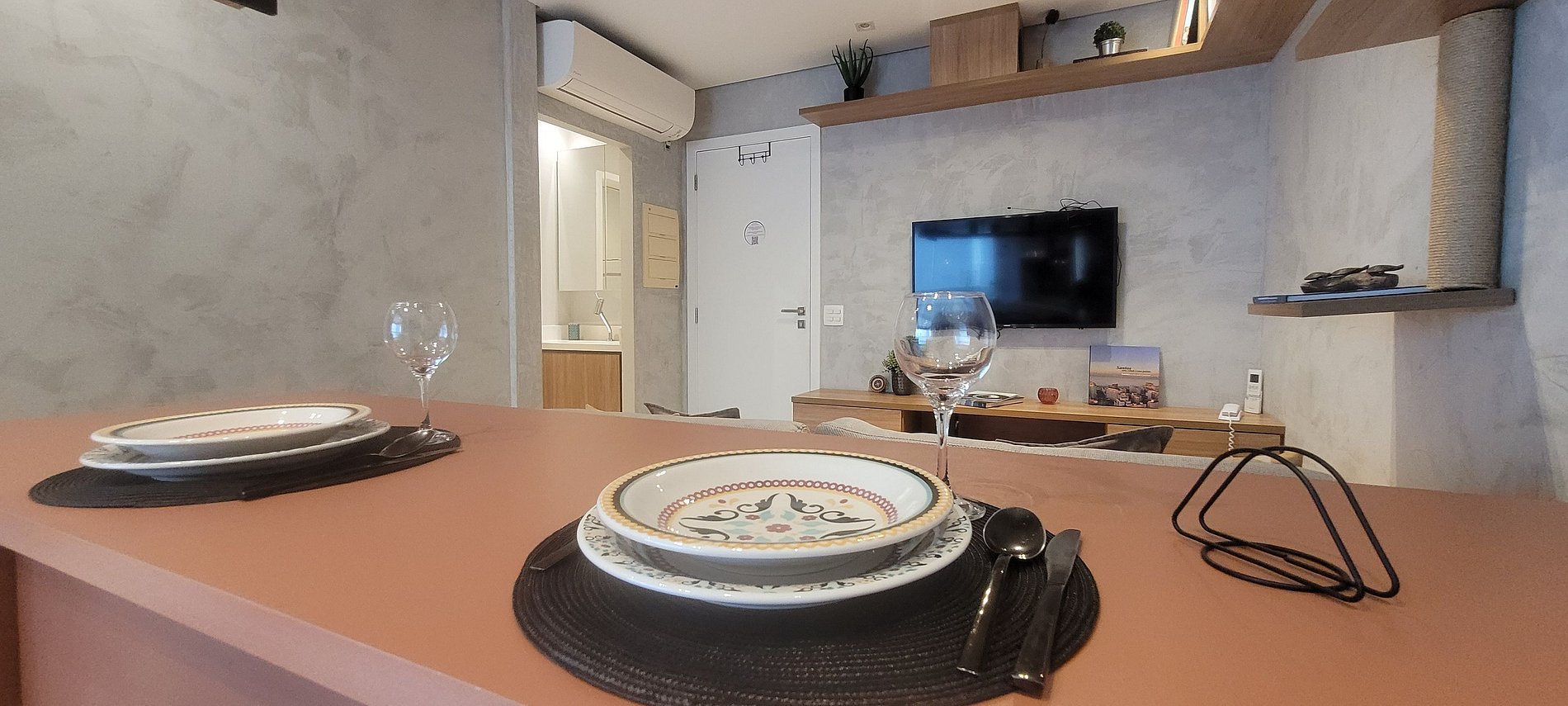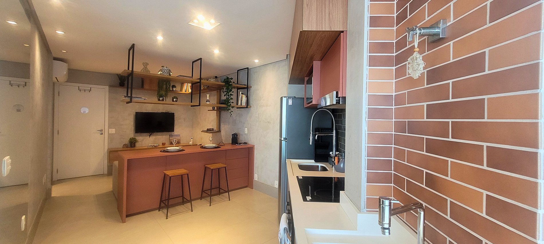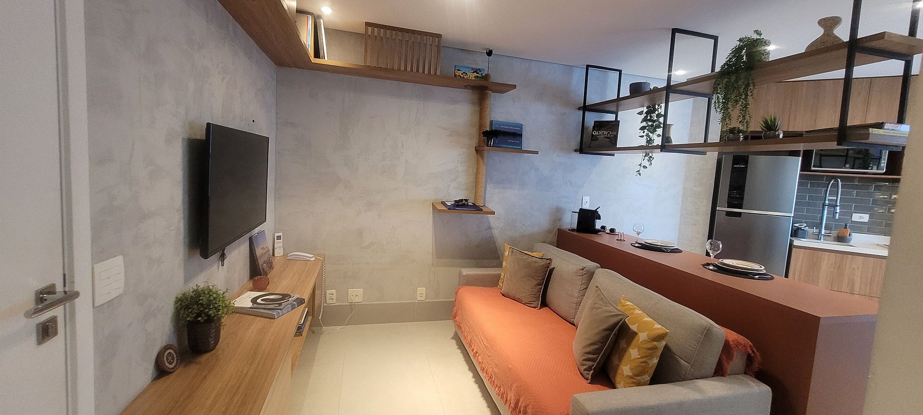 O apartamento possui 45 m² e foi todo reformado pelo arquiteto Felipe Torelli o que confere exclusividade, charme e funcionalidades únicas. Equipado com cooktop por indução, forno elétrico, persiana elétrica no quarto, envidraçamento na varanda e vista parcial do mar, o espaço é indicado para casais e viajantes de negócios, comporta um terceiro adulto ou até 2 crianças.