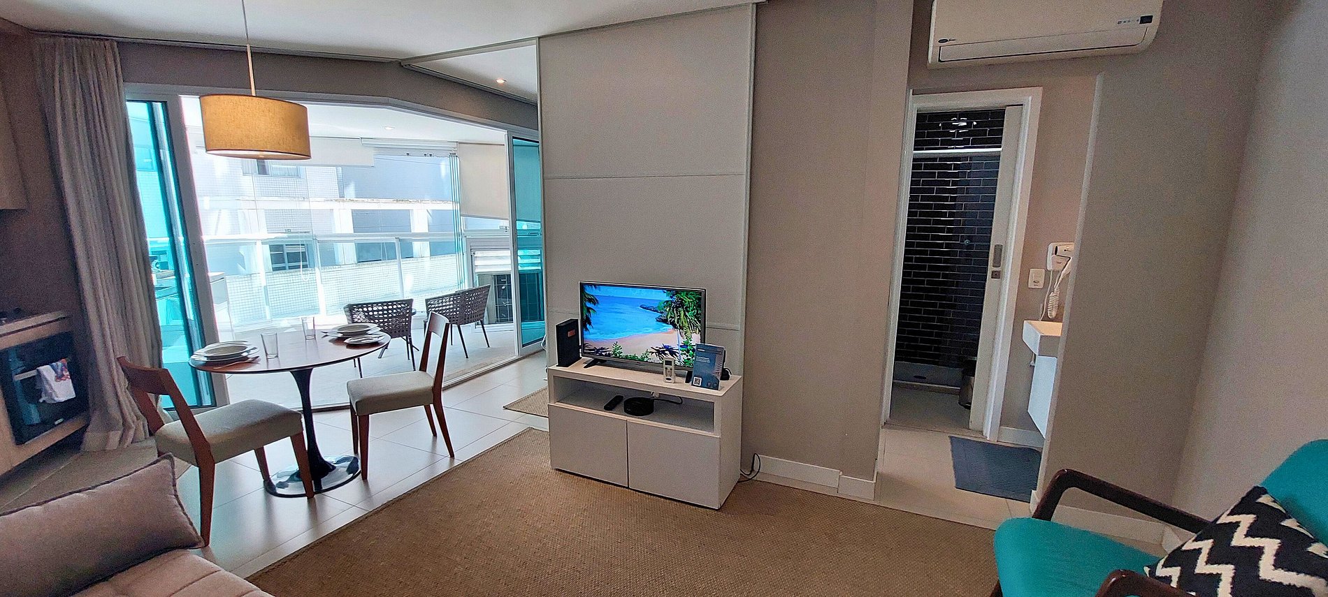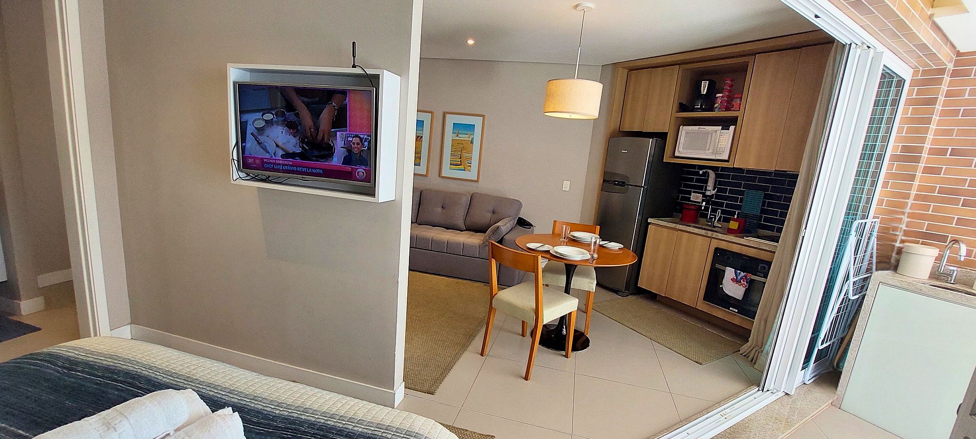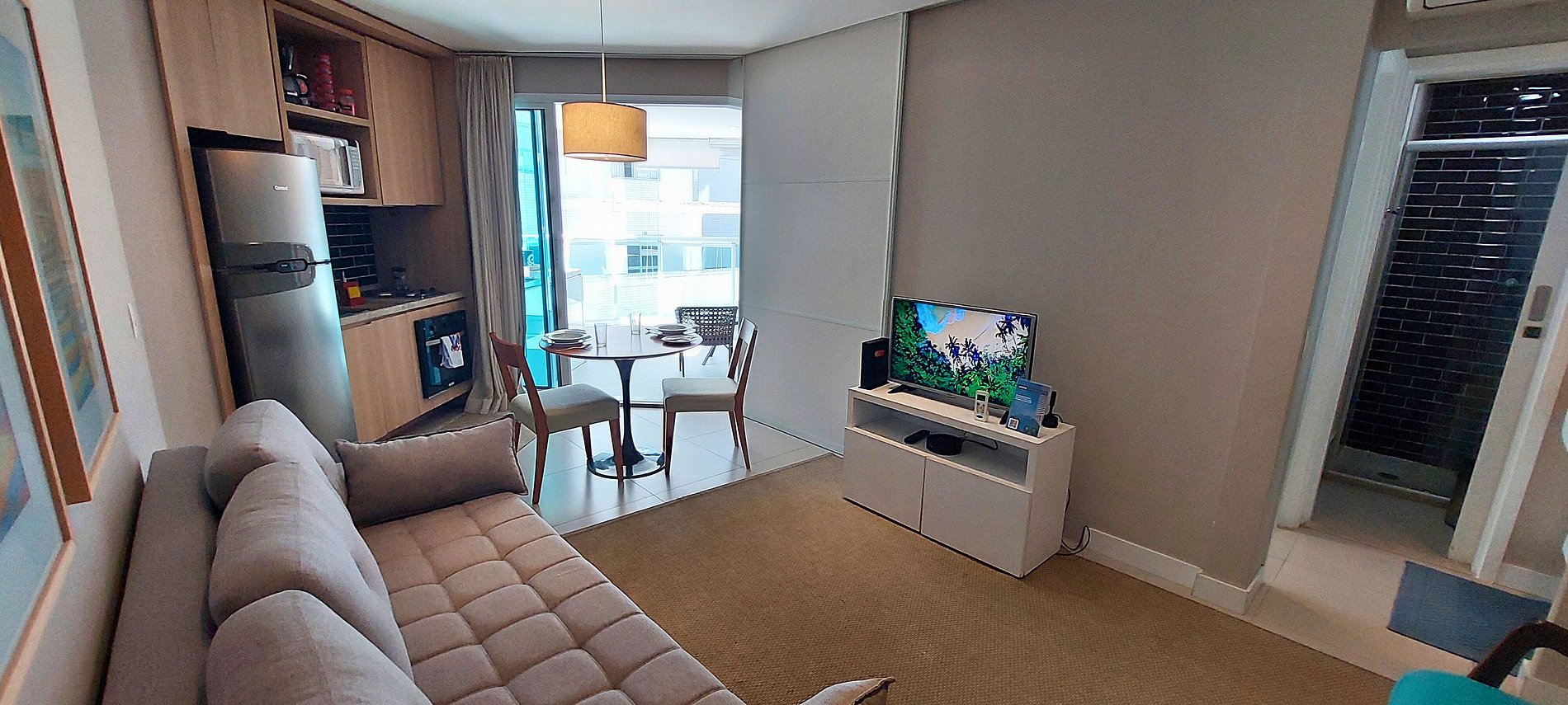 Muito bem avaliado por quem já se hospedou, ele é ideal para quem busca um espaço moderno de 45m², com sacada fechada com envidraçamento — perfeita para relaxar ou curtir o home office.