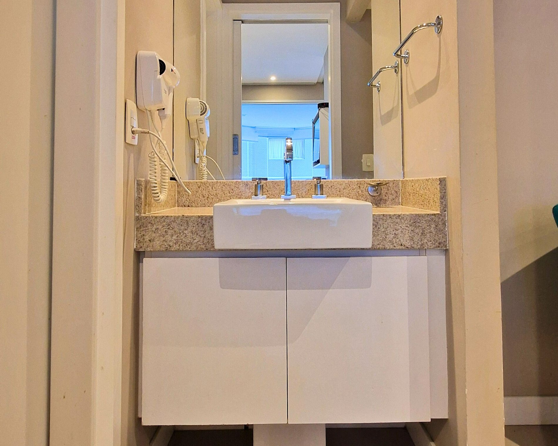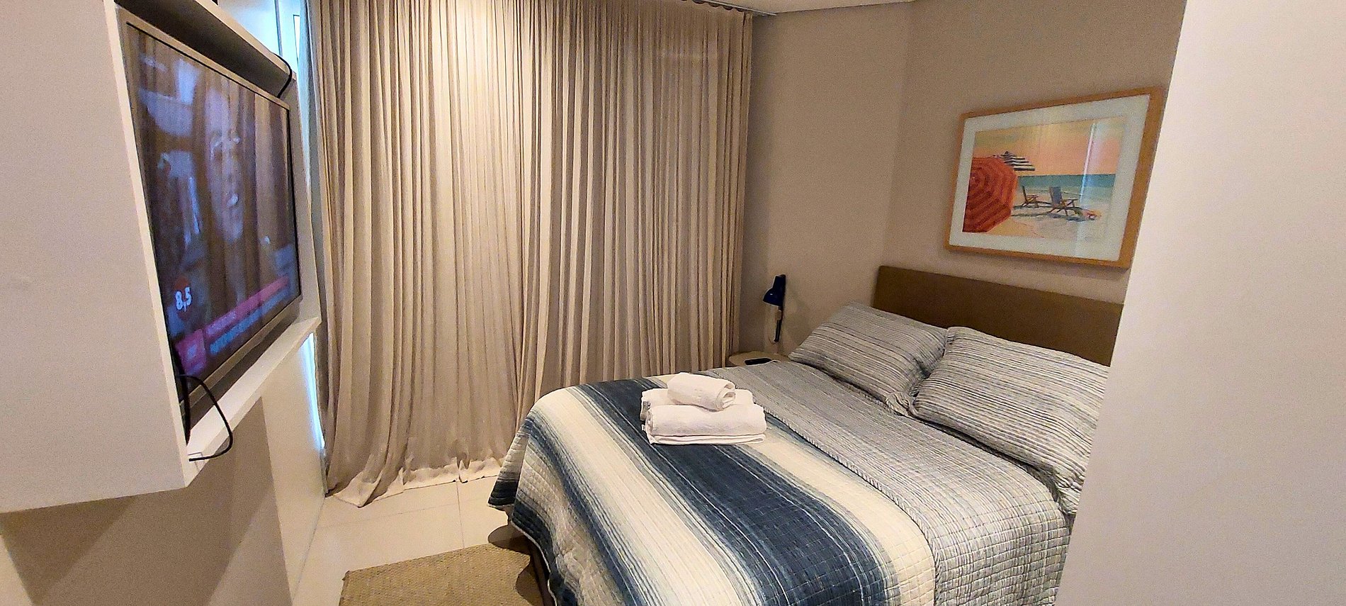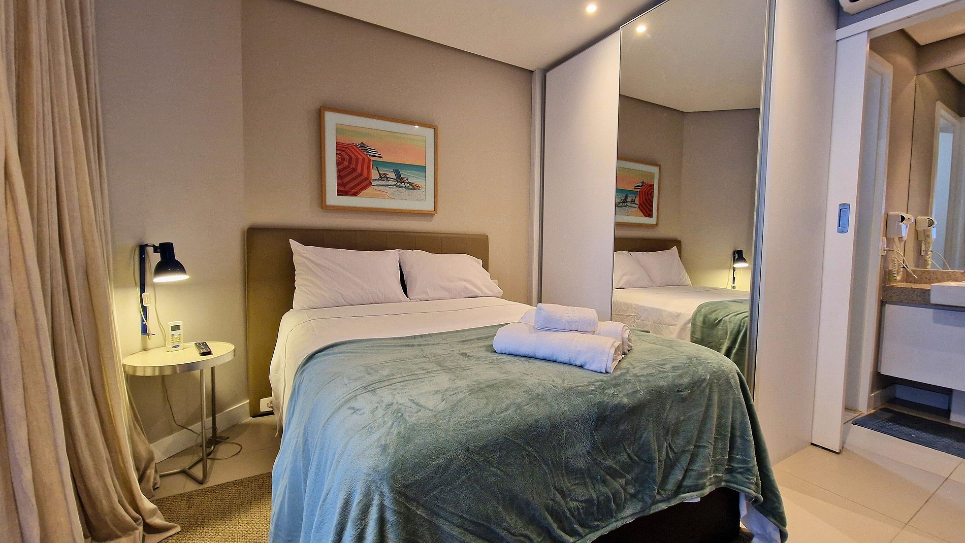Muito bem avaliado por quem já se hospedou, ele é ideal para quem busca um espaço moderno de 45m², com sacada fechada com envidraçamento — perfeita para relaxar ou curtir o home office.