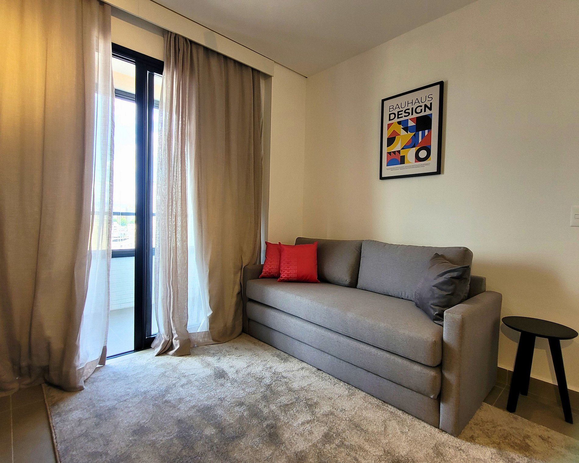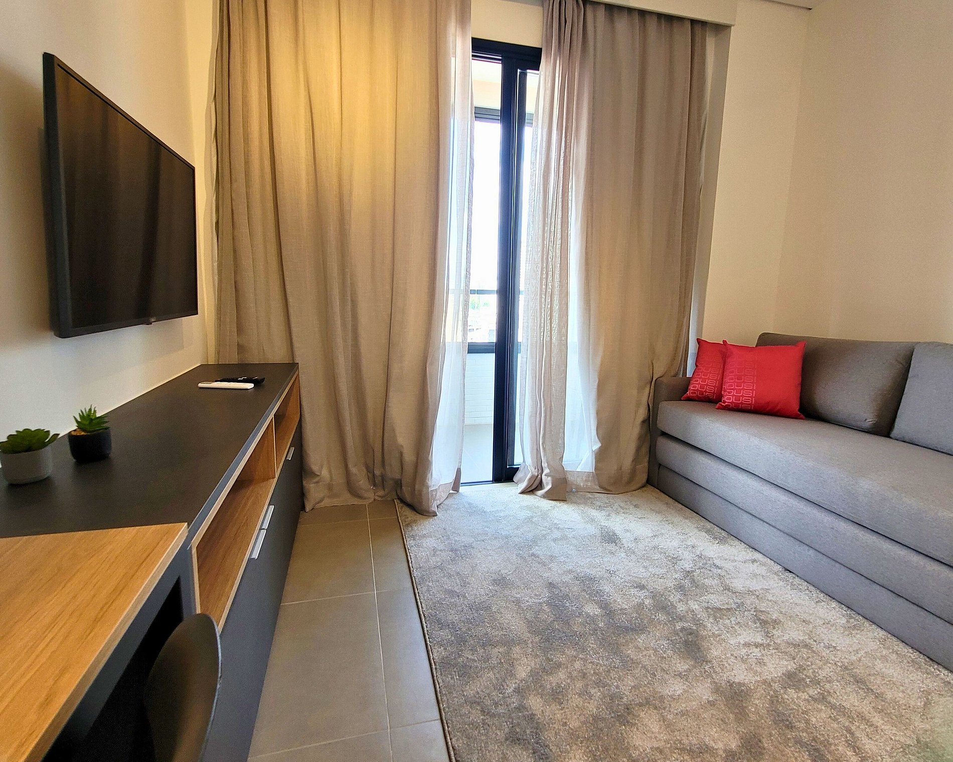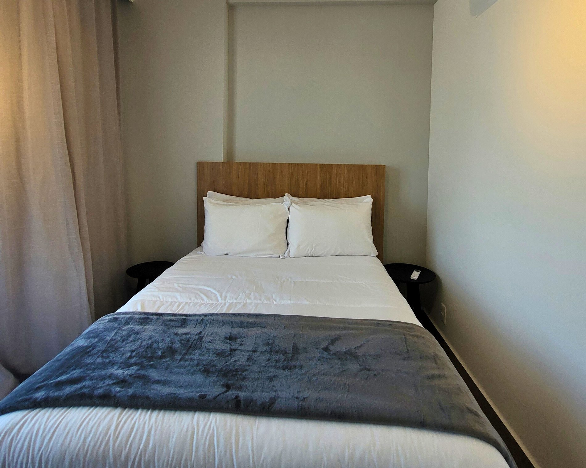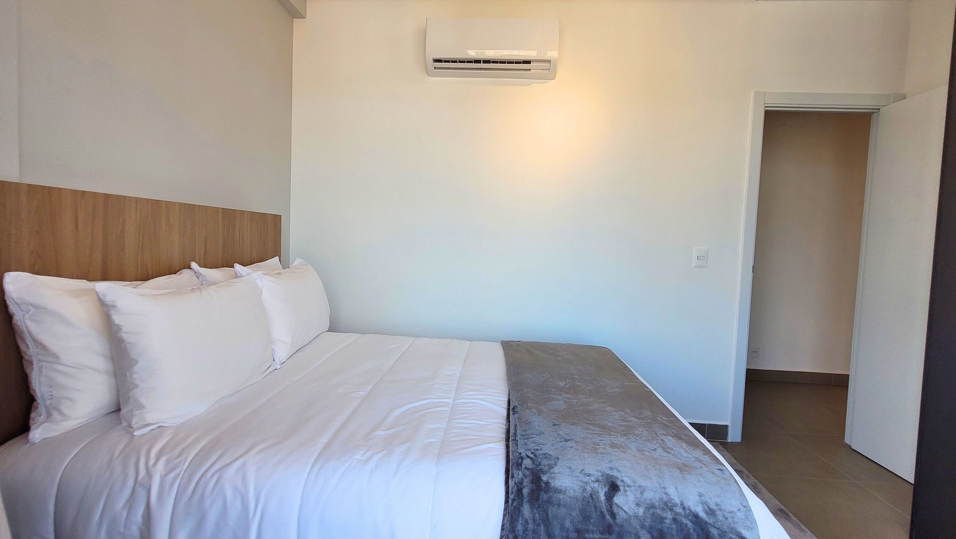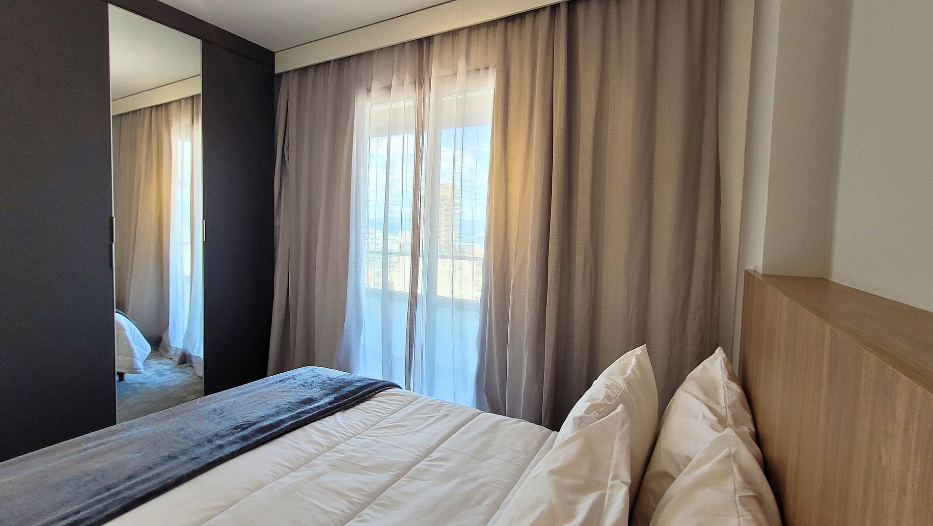 O apartamento conta com uma cama casal tamanho padrão superconfortável, que te trará ótimas noite de sono depois de um longo dia na praia ou passeando pela cidade, além de ter vista lateral para o mar.