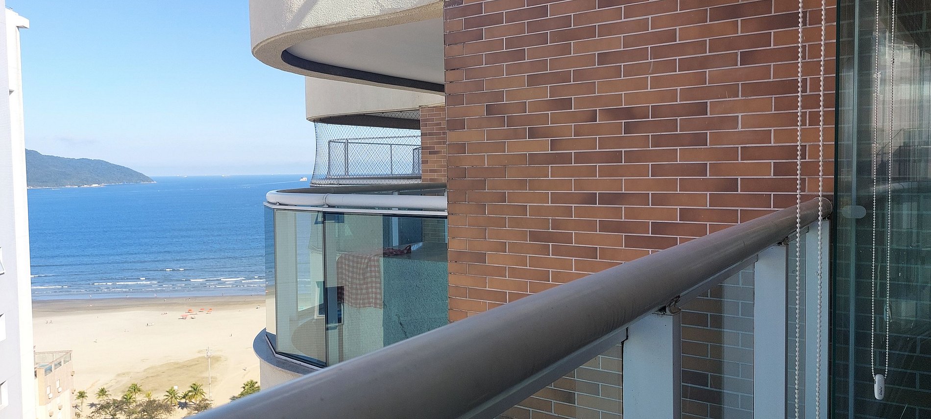 • Com 2 sacadas no 1º andar, sendo uma sacada envidraçada com vista lateral para o mar e outra sem envidraçamento atrás do sofá