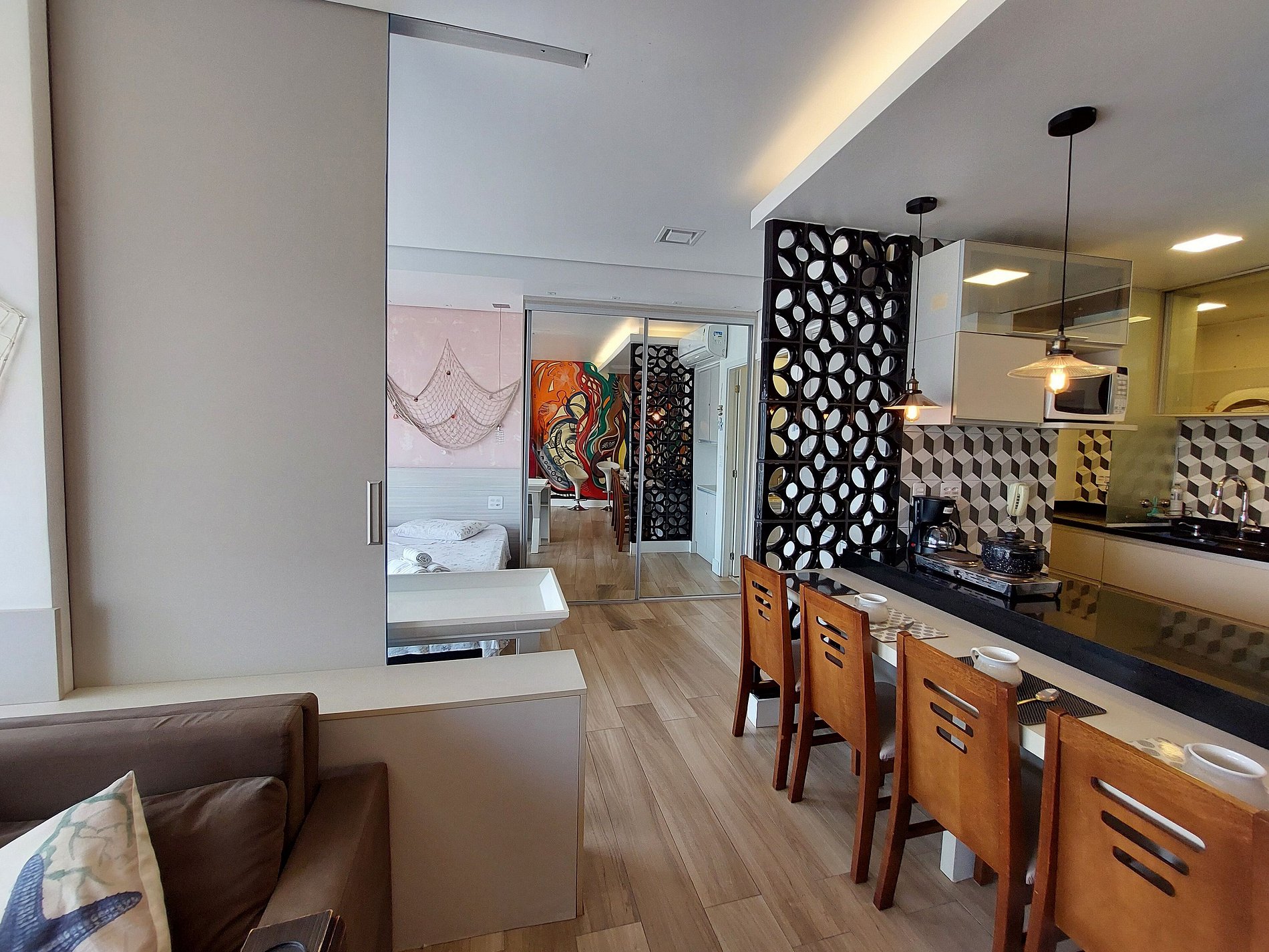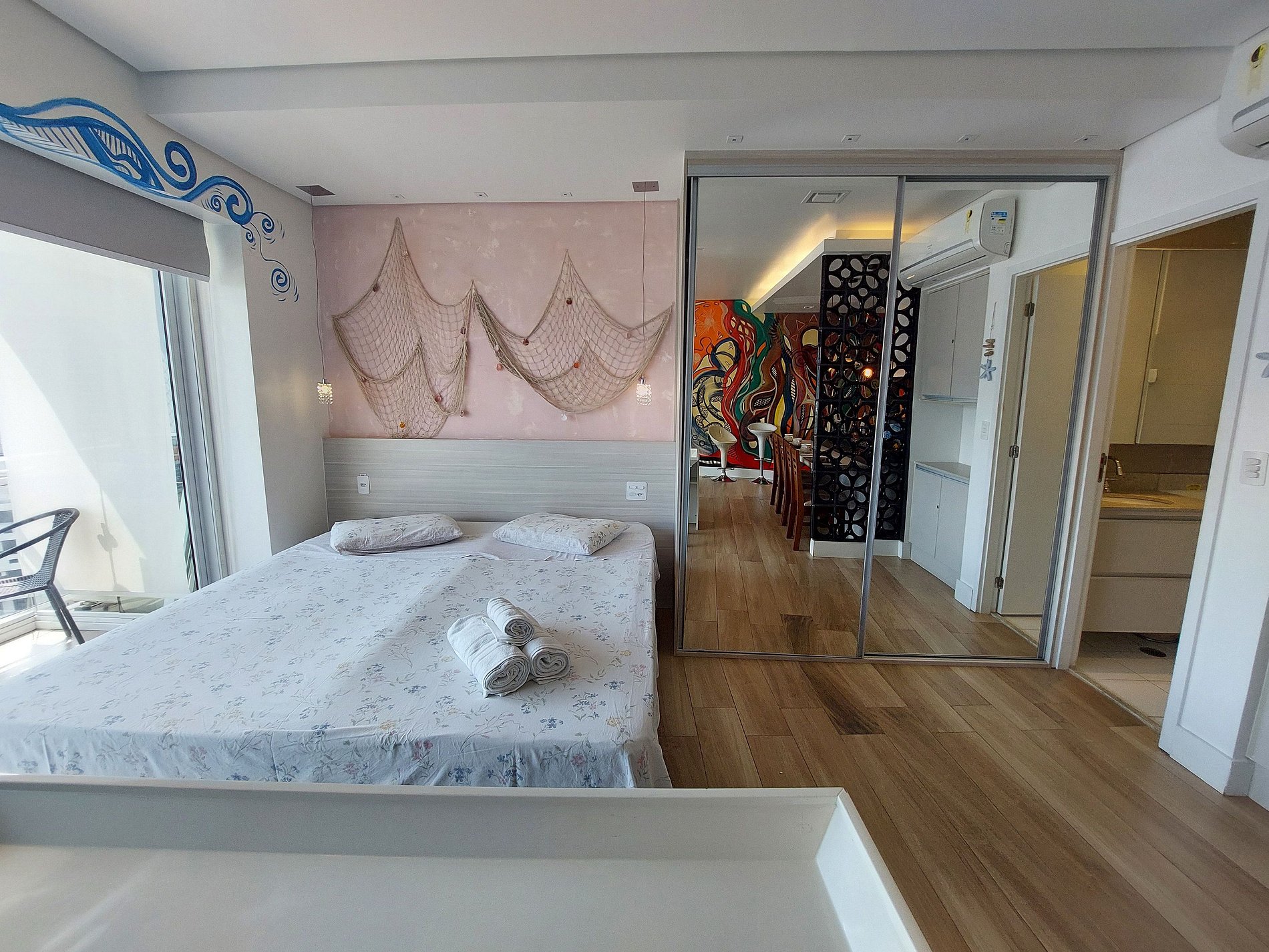 O apartamento 1413 possui vista para a piscina, tem sacada envidraçada e é perfeito para hospedagens com crianças, acomoda uma familia de até 4 pessoas. Também aceita cães de pequeno e médio porte pesando até 15kg mediante taxa adicional de R$ 120,00). Gatos não são aceitos.