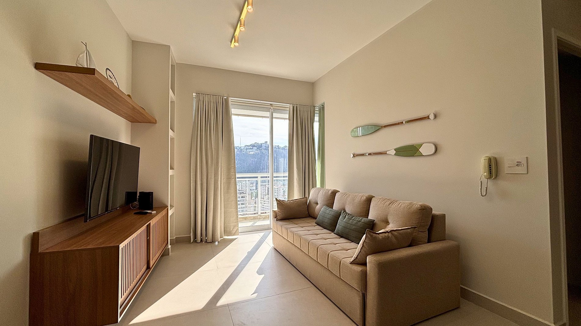 Comodidades: cozinha completa, máquina de lavar, 2 TVs Smart, Wi-Fi de alta velocidade e ar-condicionado na sala e no quarto.