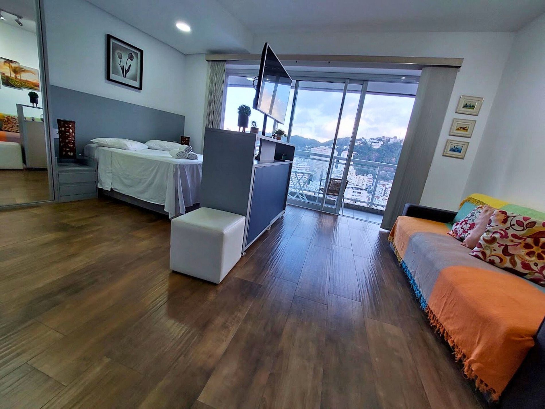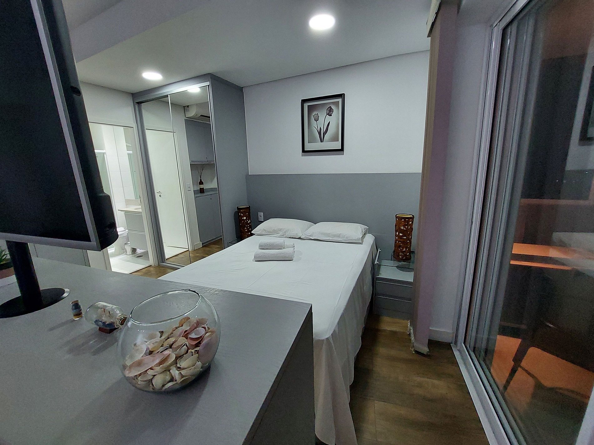 O apartamento 1910, com 50m² localizado no 19º andar, acomoda até 4 pessoas e está no melhor condomínio de Santos, o Unlimited Ocean Front! Oferece uma bela vista lateral para o mar. Aceita cães de pequeno e médio porte (até 15kg) mediante taxa adicional de R$ 120,00. Gatos não são aceitos.