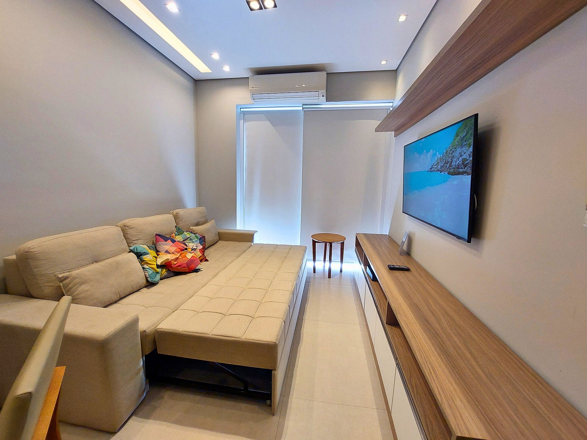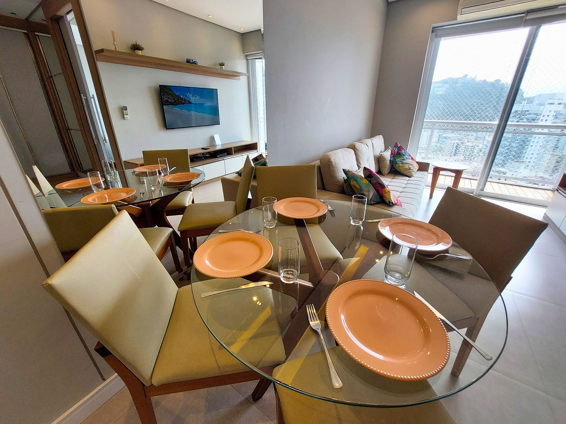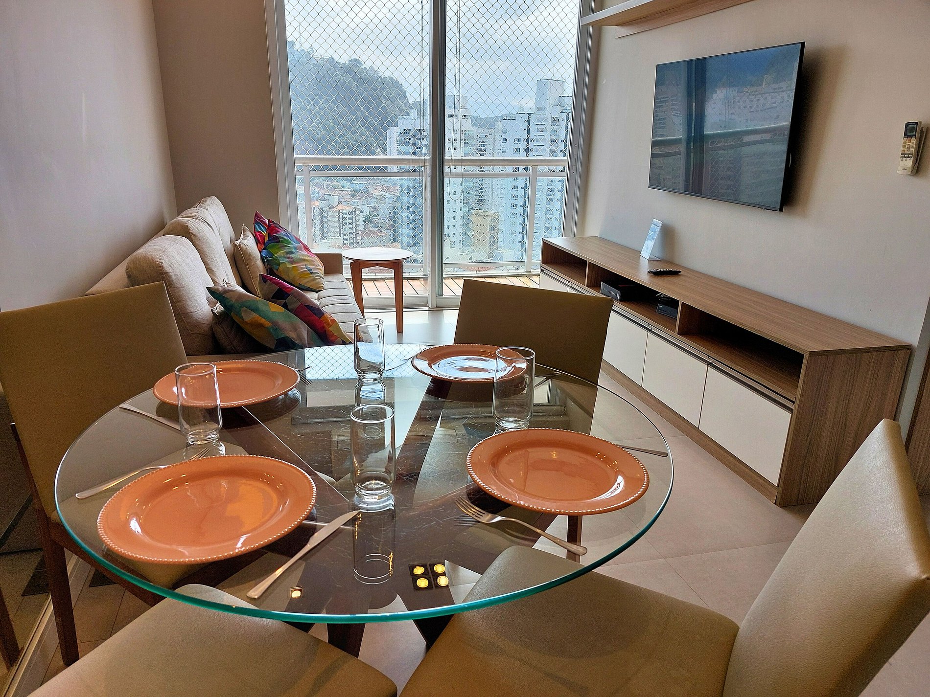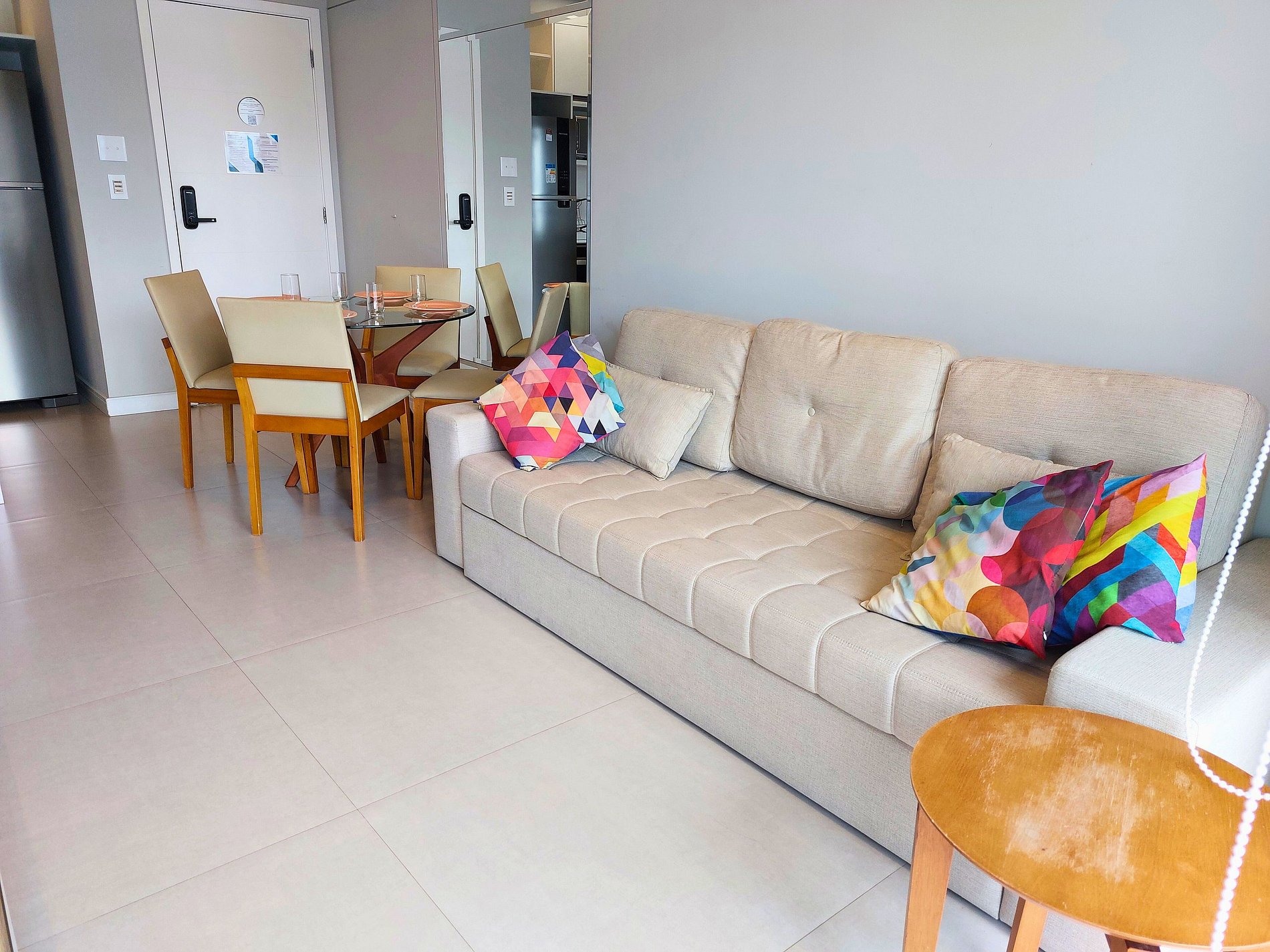 • Possui sacada telada com linda vista para o mar e o Emissário — perfeita para quem viaja com crianças.