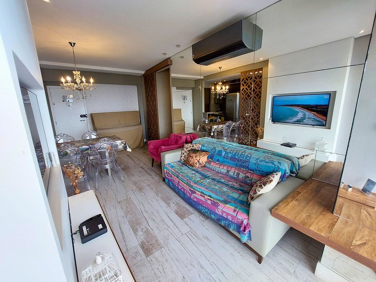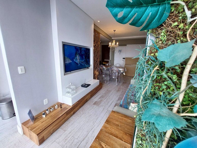 Acomoda 4 pessoas em 2 quartos: cama queen e cama de solteiro com auxiliar. Decoração charmosa e aconchegante no melhor condomínio de Santos.