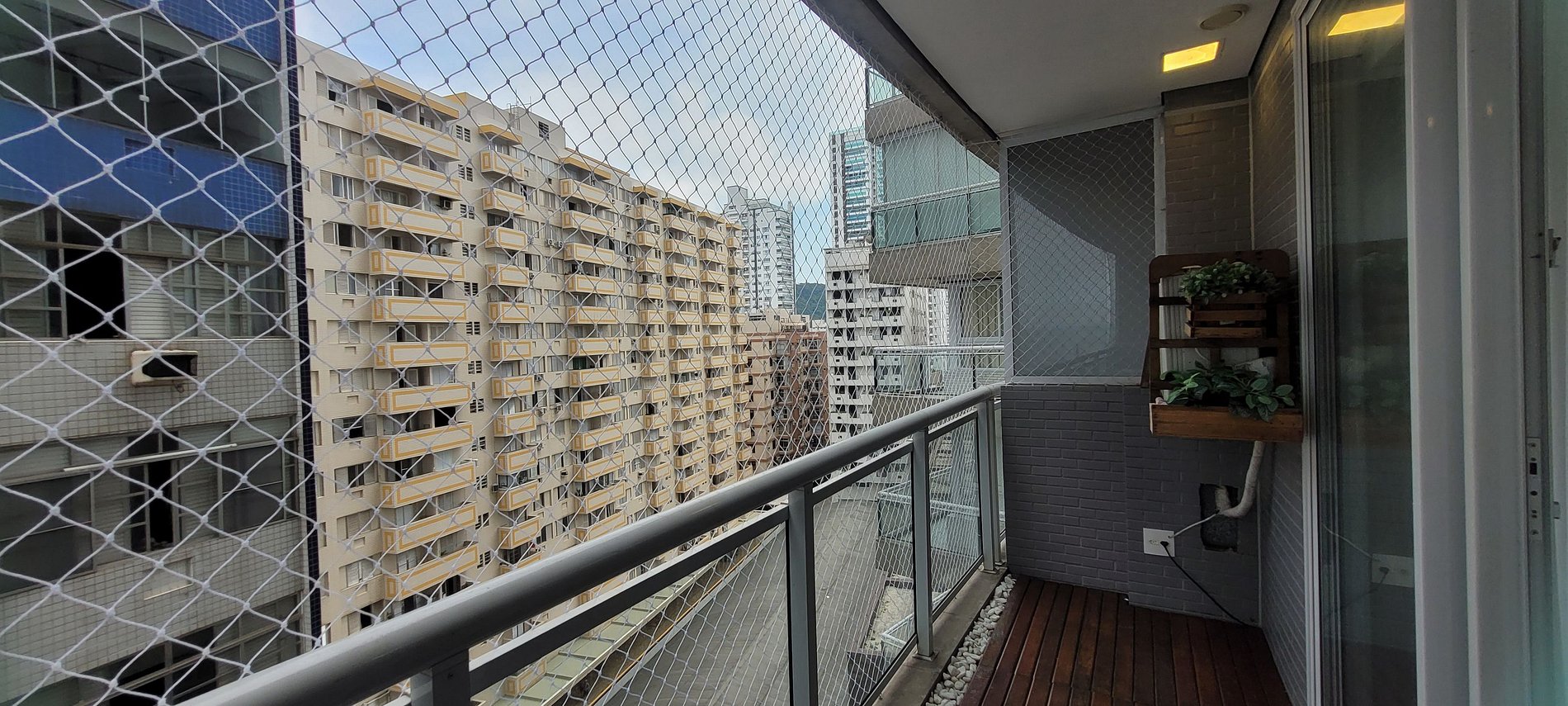 O apartamento possui tela de proteção na sacada, perfeito também para hóspedes com crianças