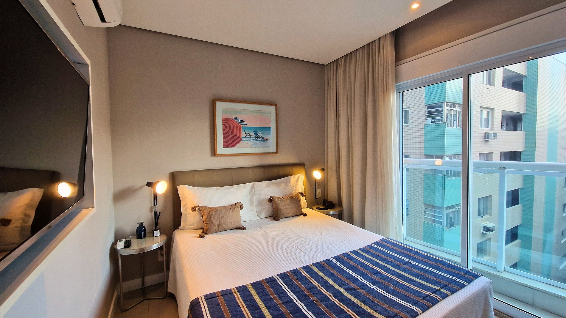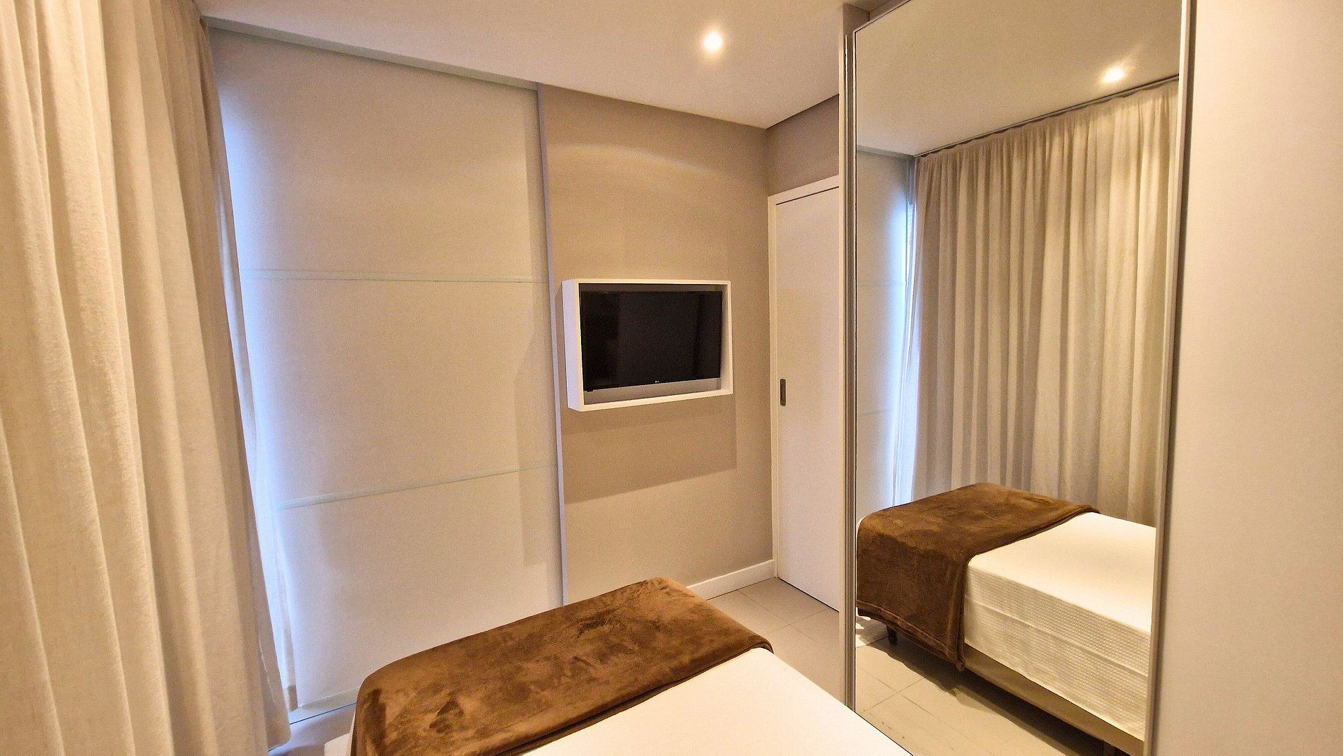 • Com 2 quartos, sendo 1 suíte com cama queen e 1 quarto com cama solteiro queen