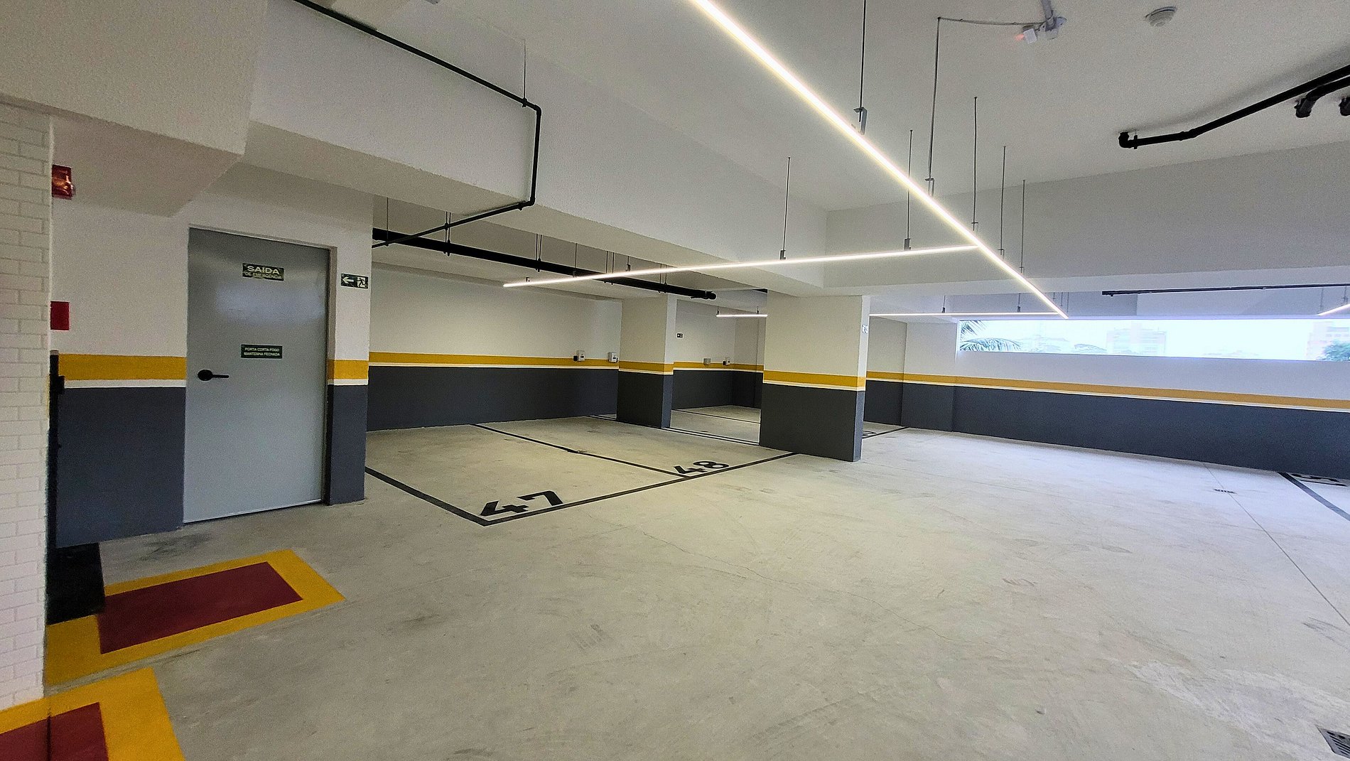 A vaga de garagem possui 2,40 m de largura por 4,80 m de comprimento, com demarcações individuais. Atenção: devido à altura limitada na rampa de acesso entre os andares, veículos do tipo SUV, pick-up ou modelos mais altos podem não ser compatíveis com o local.