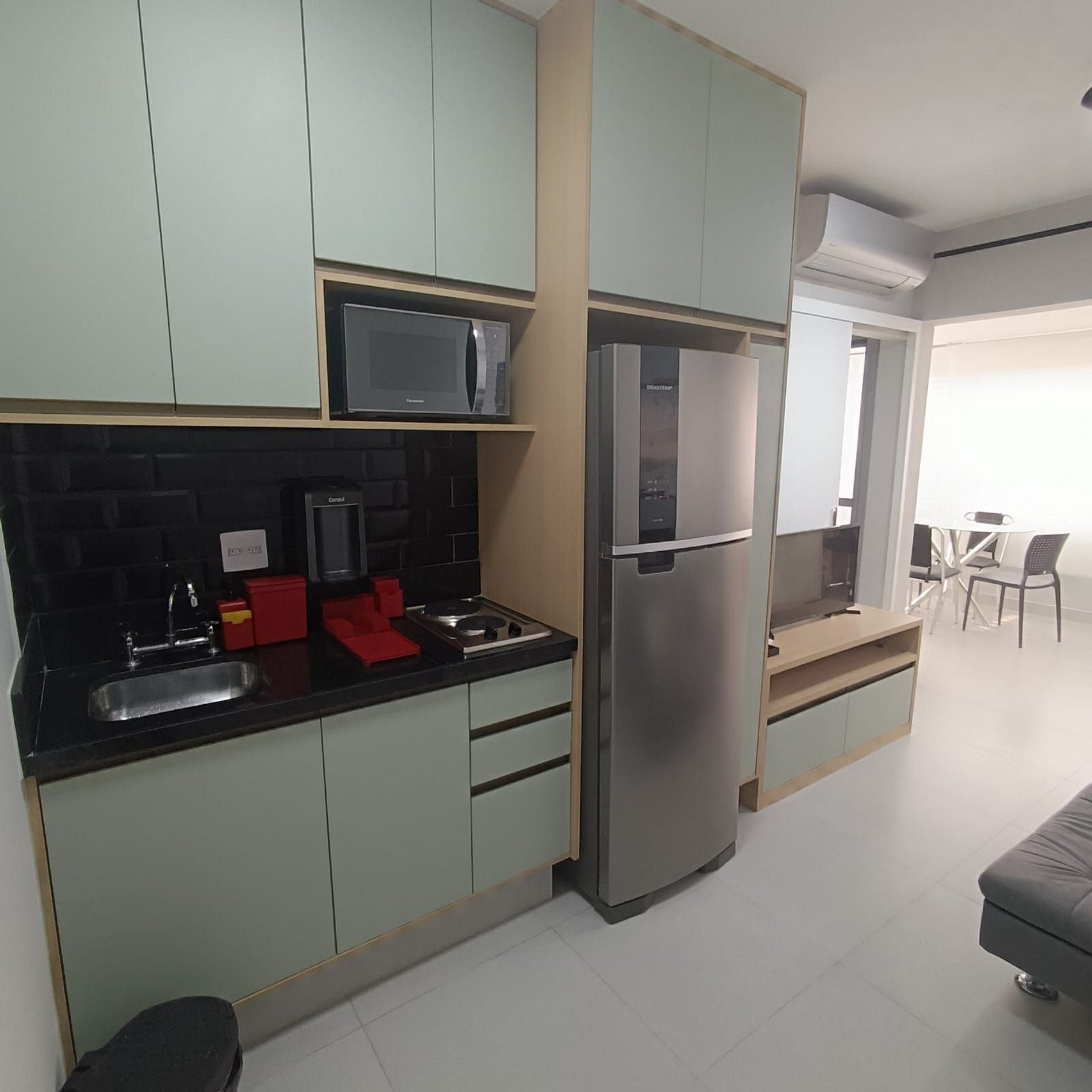 A cozinha compacta possui um cooktop de duas bocas, geladeira e micro-ondas, bem como utensílios básicos de cozinha, pratos e talheres, perfeitos para preparar refeições rápidas.