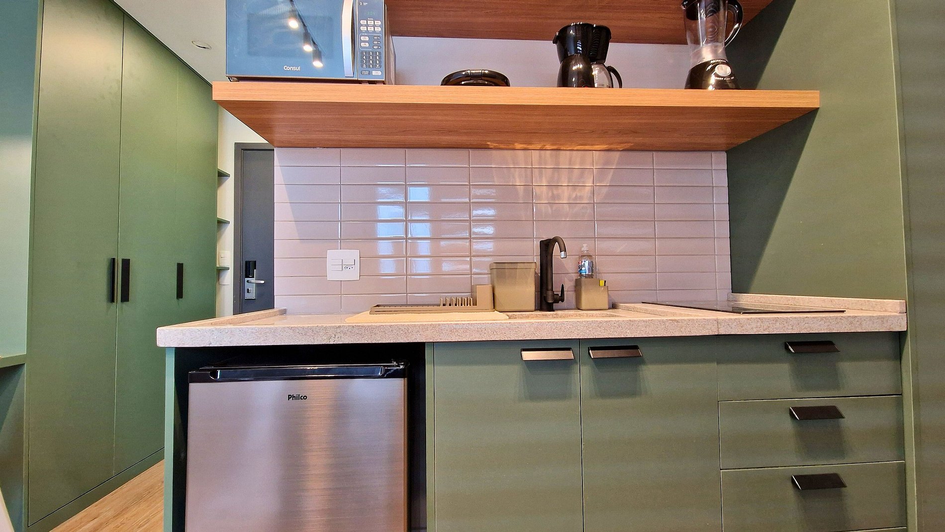 Estúdio 2304 – Helbor Stay: com 26m², novo, decorado em elegantes tons pastéis, confortável e a apenas 1 quadra da praia, com vista para o mar!