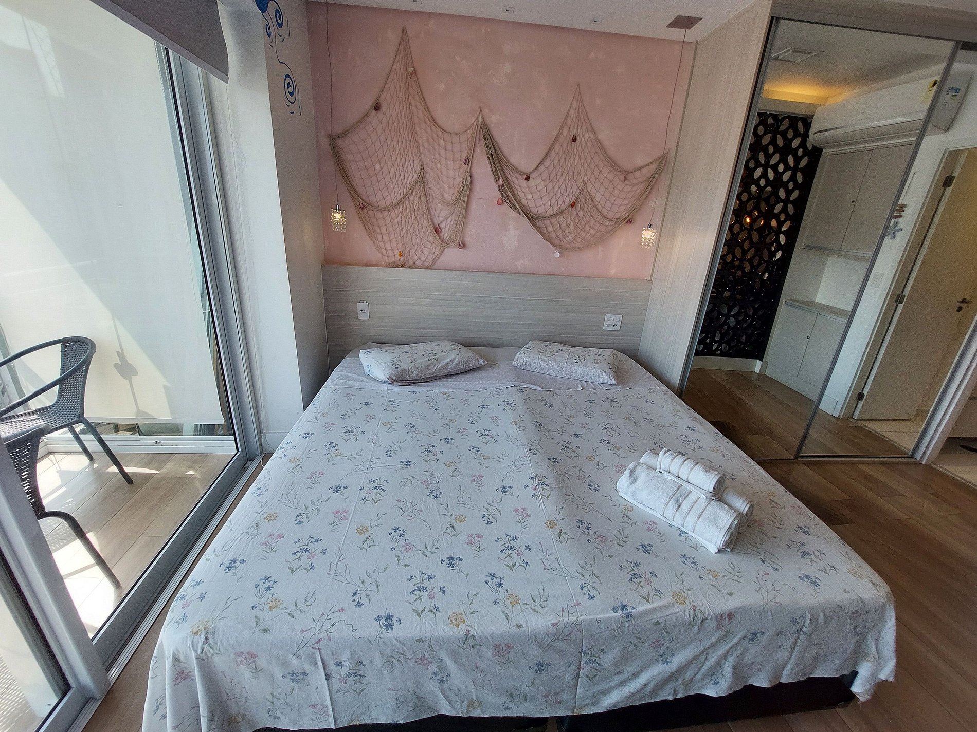 O apartamento 1413 possui vista para a piscina, tem sacada envidraçada e é perfeito para hospedagens com crianças, acomoda uma familia de até 4 pessoas. Também aceita cães de pequeno e médio porte pesando até 15kg mediante taxa adicional de R$ 120,00). Gatos não são aceitos.
