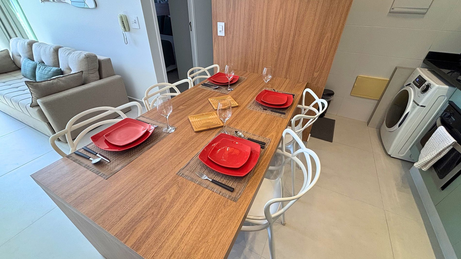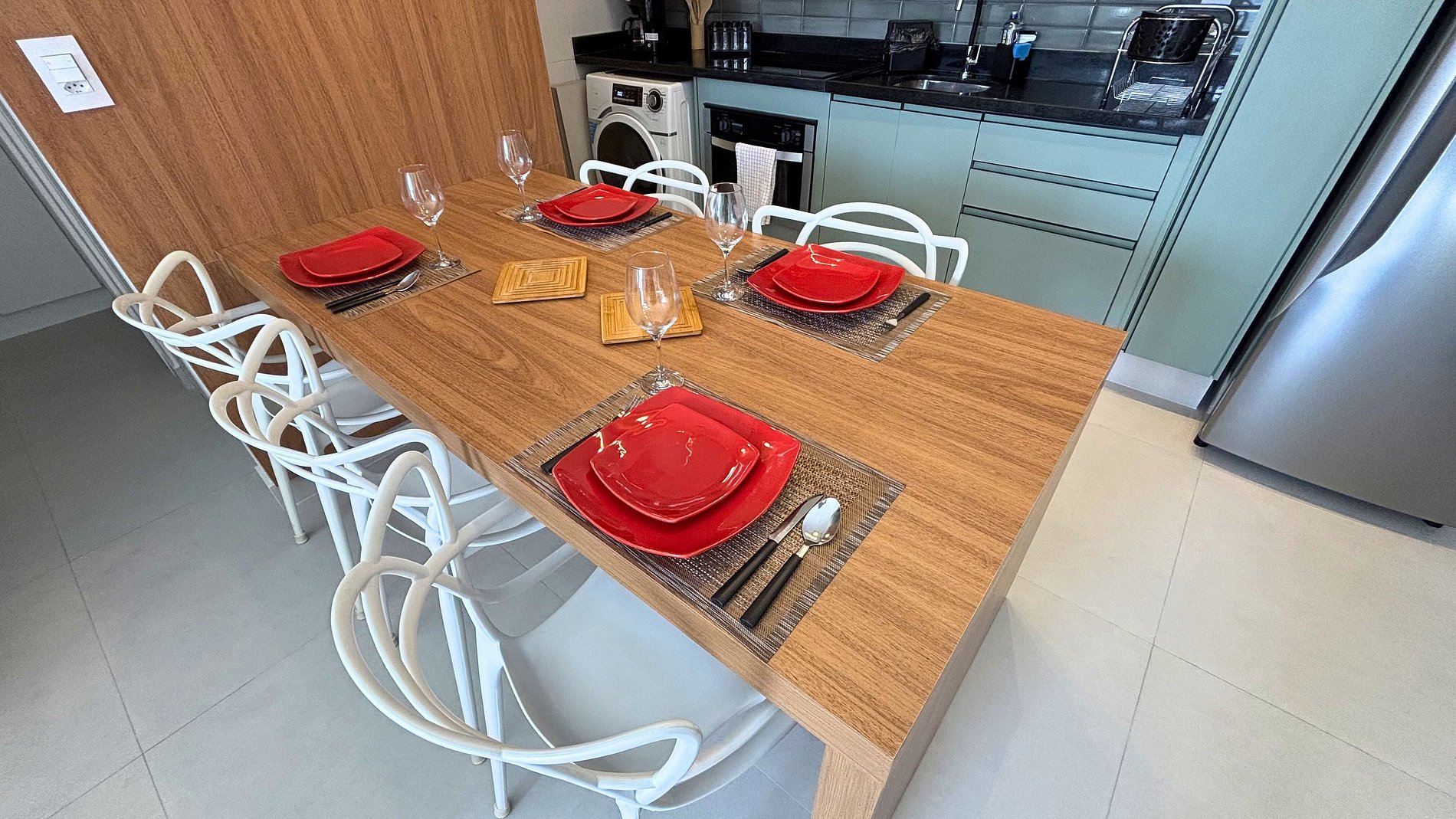 Comodidades: cozinha completa, máquina de lavar, 2 TVs Smart, Wi-Fi de alta velocidade e ar-condicionado na sala e no quarto.
