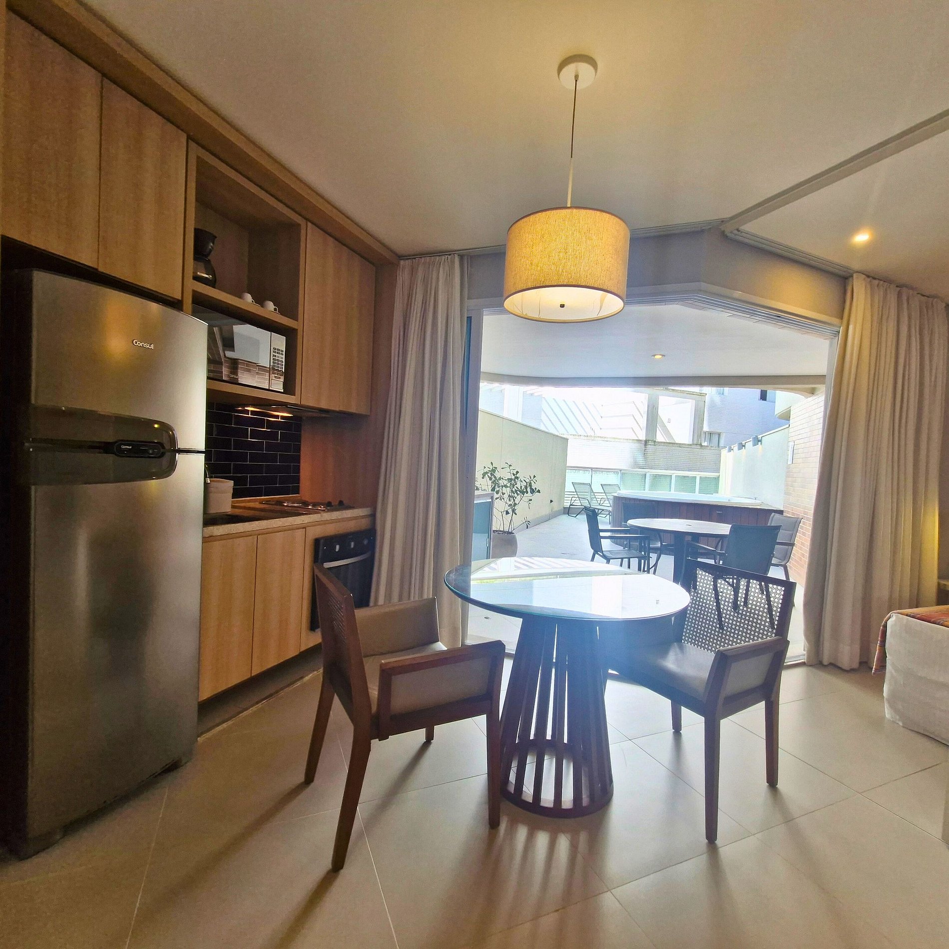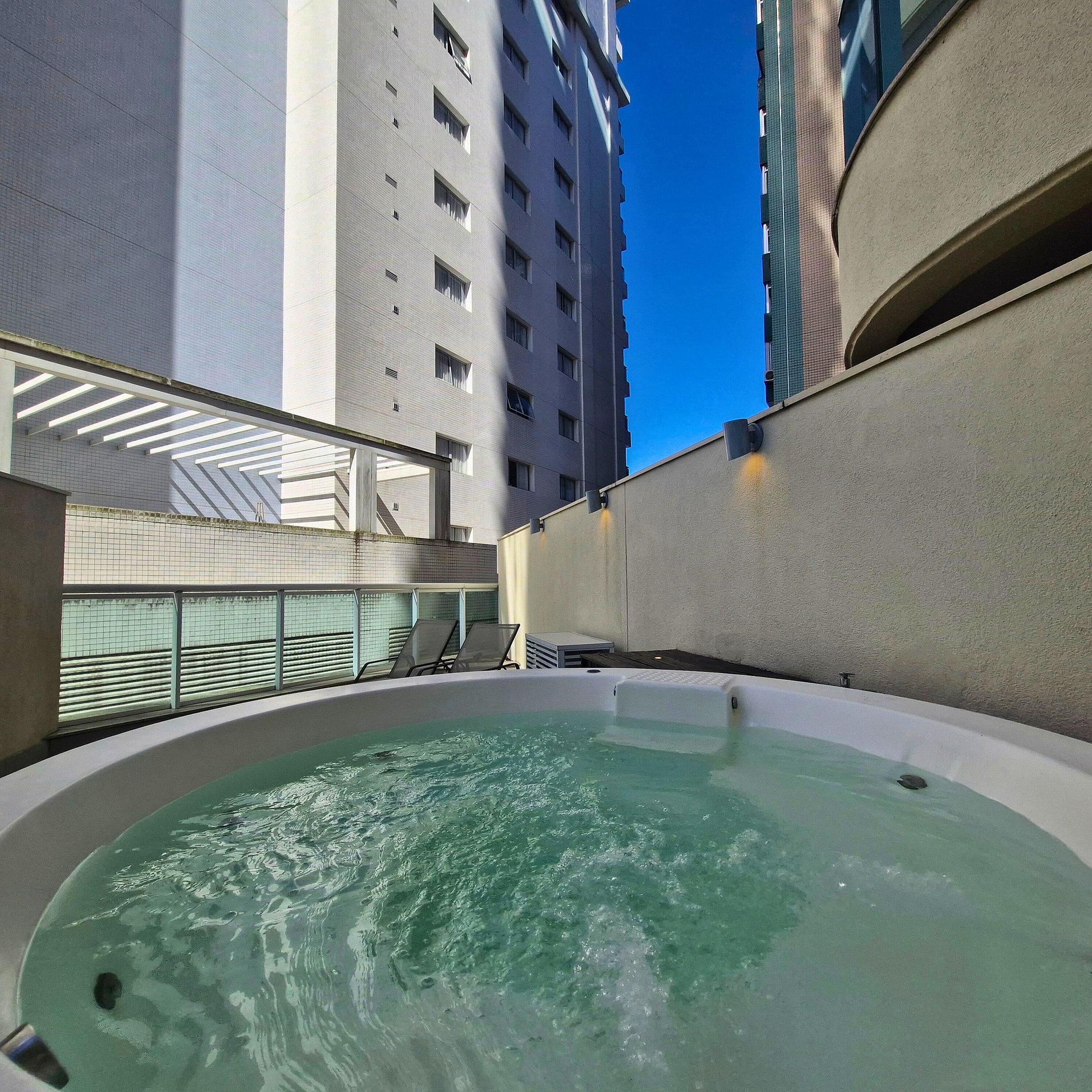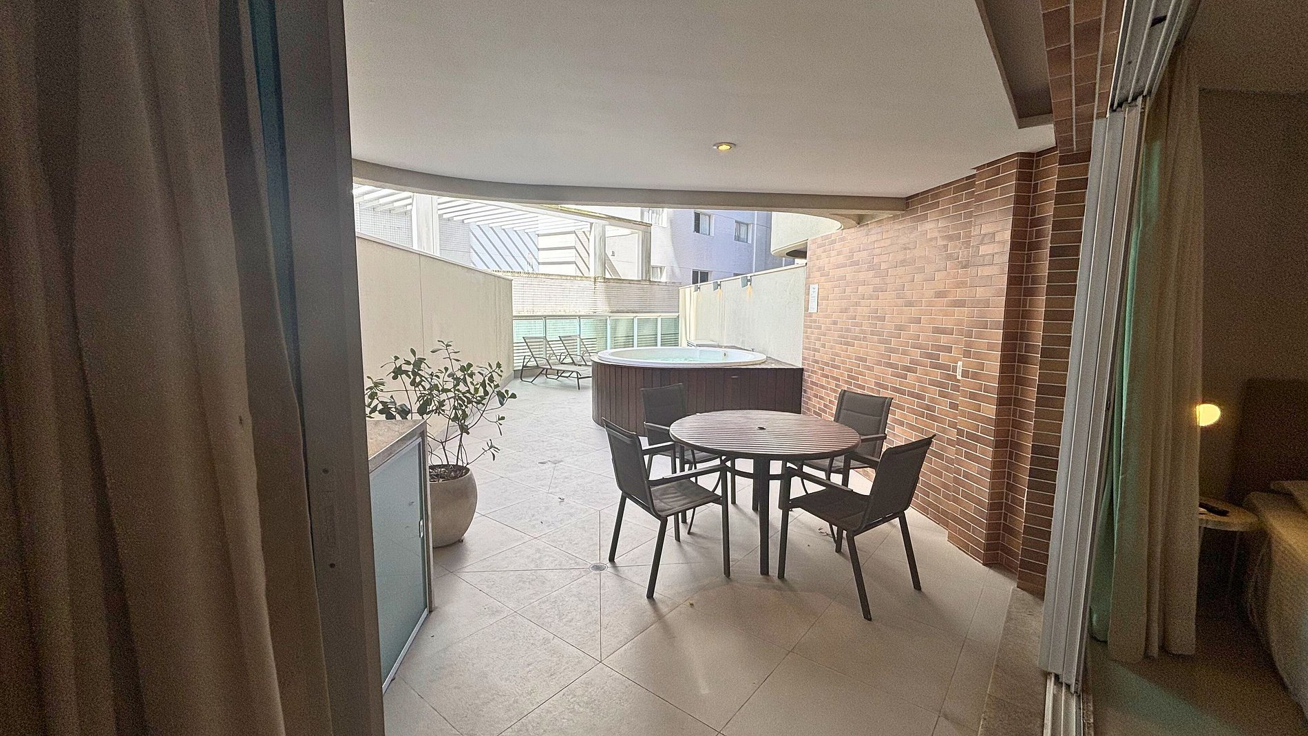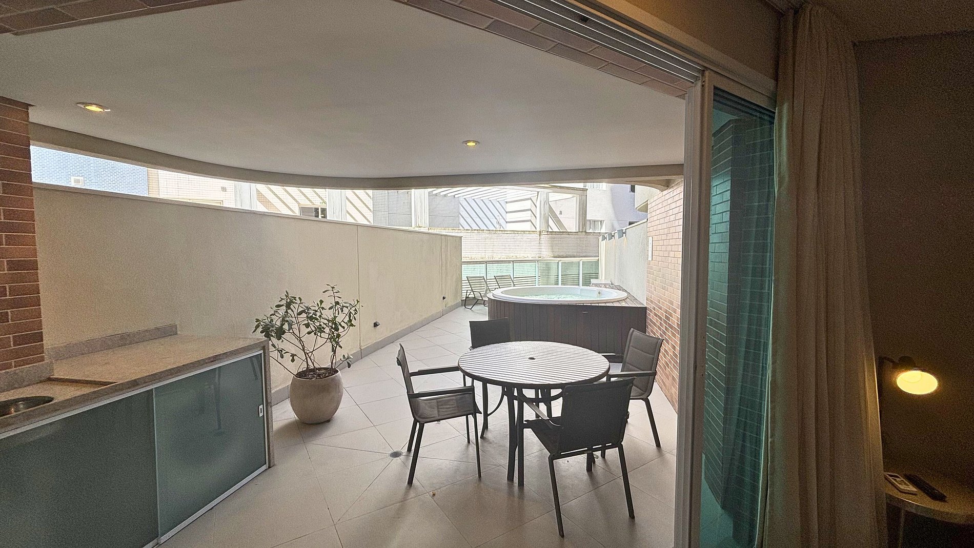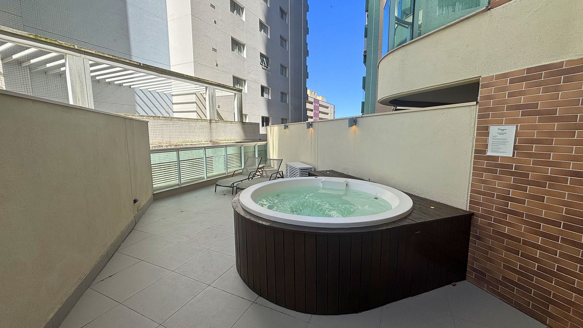 • são 83m² com quintal e jacuzzi privativa, espreguiçadeiras e mesa com cadeiras — perfeito para relaxar ao ar livre, de dia ou à noite, especialmente após a praia.