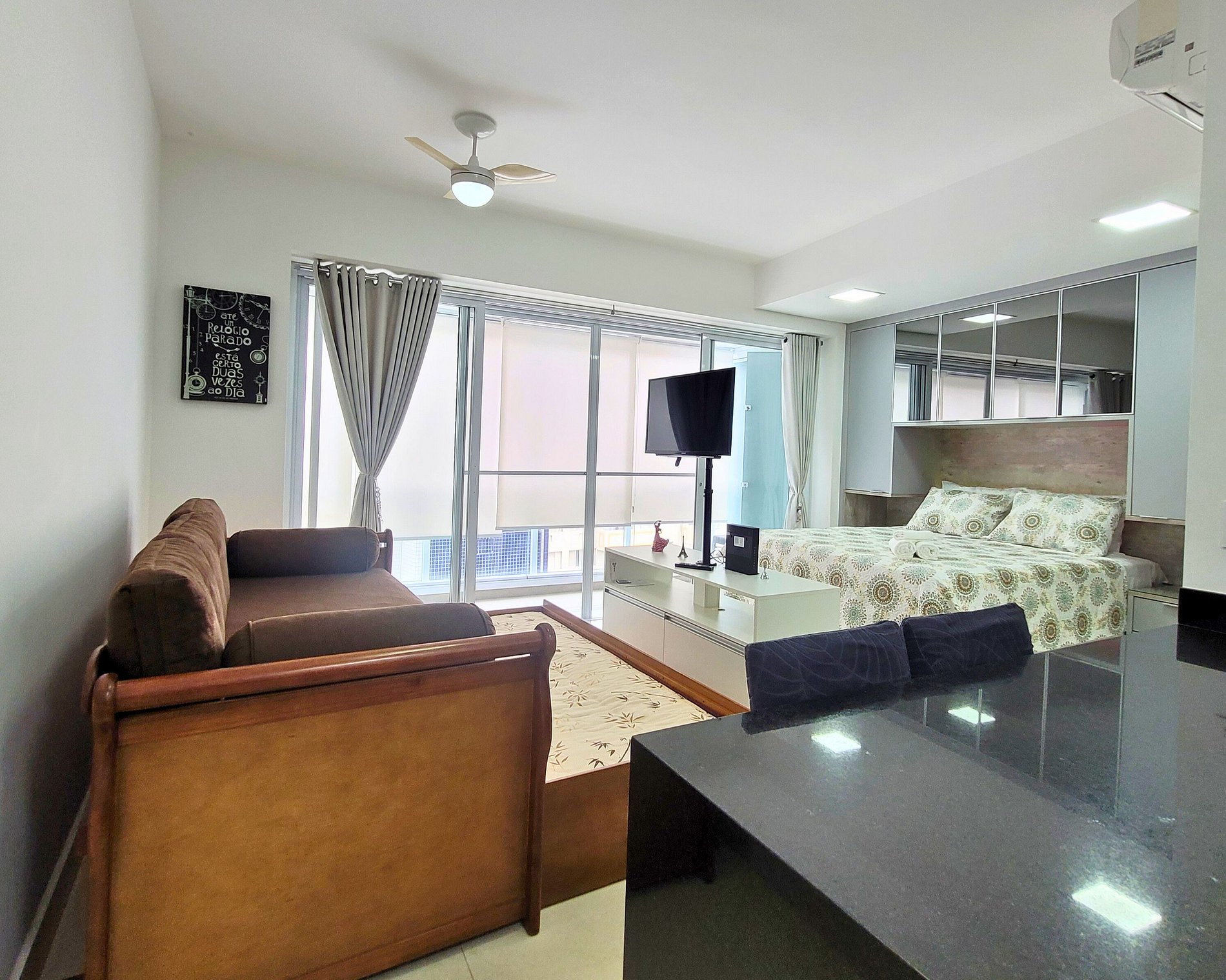 Moderno e aconchegante, com 50m², o estúdio é perfeito para até 4 pessoas.O espaço conta com uma cama queen, sofá com cama auxiliar e uma charmosa vista lateral para o mar. Ideal para relaxar ou explorar a cidade, o condomínio ainda oferece diversas comodidades para tornar sua estadia inesquecível.
