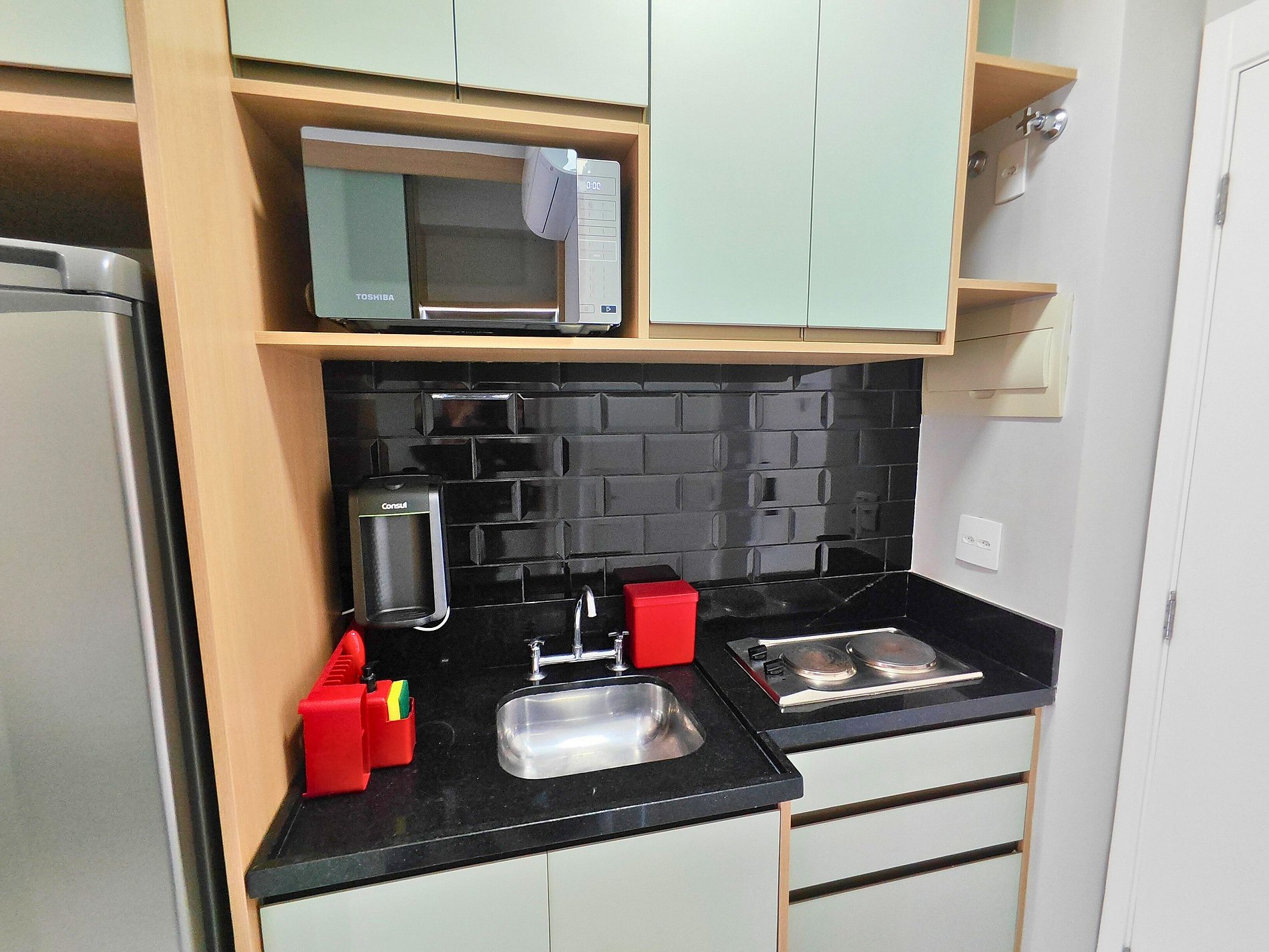 A cozinha compacta possui um cooktop de duas bocas, geladeira e micro-ondas, bem como utensílios básicos de cozinha, pratos e talheres, perfeitos para preparar refeições rápidas.