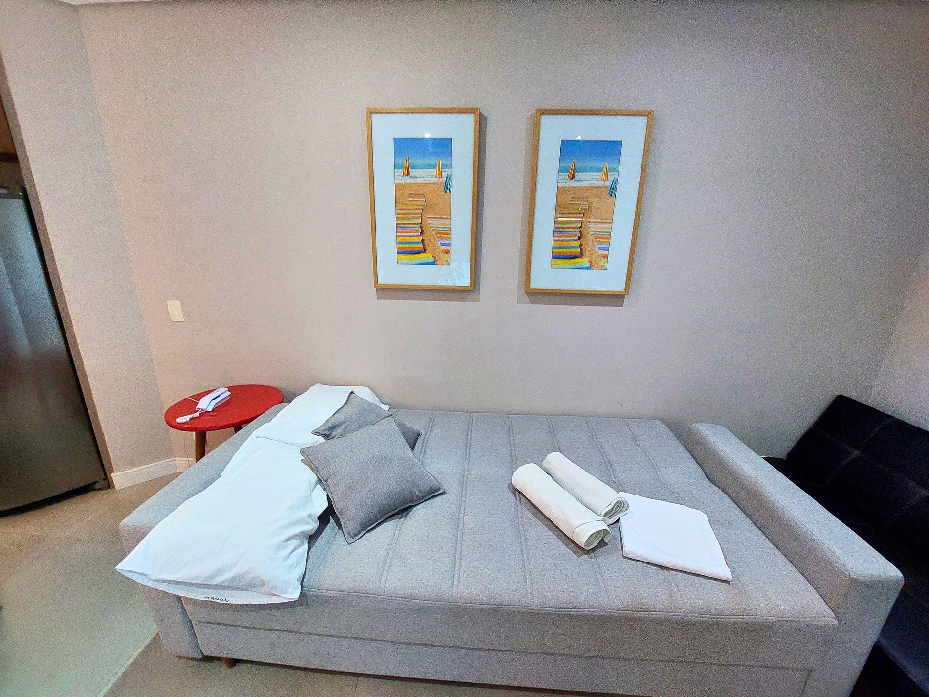• Roupa de cama, travesseiros e toalhas (toalhas de banho/piscina), conforme o número de hóspedes pagantes, da seguinte forma: A cama de casal estará preparada com os lençóis e 2 travesseiros, 1 toalha de banho por pessoa, há 1 toalha de rosto e 1 toalha de piso por banheiro e 1 manta disponível no apartamento. Os itens para o sofá-cama ficam dentro do armário/gaveta, caso seja uma reserva para mais de 2 pessoas