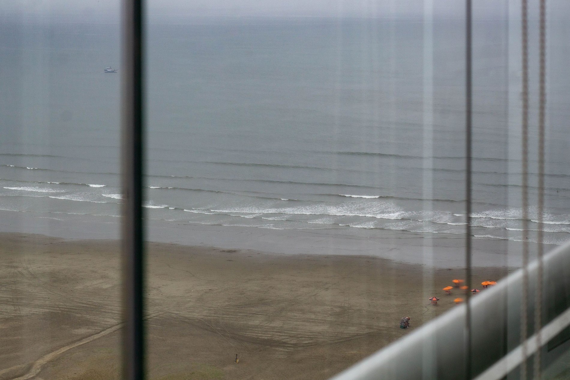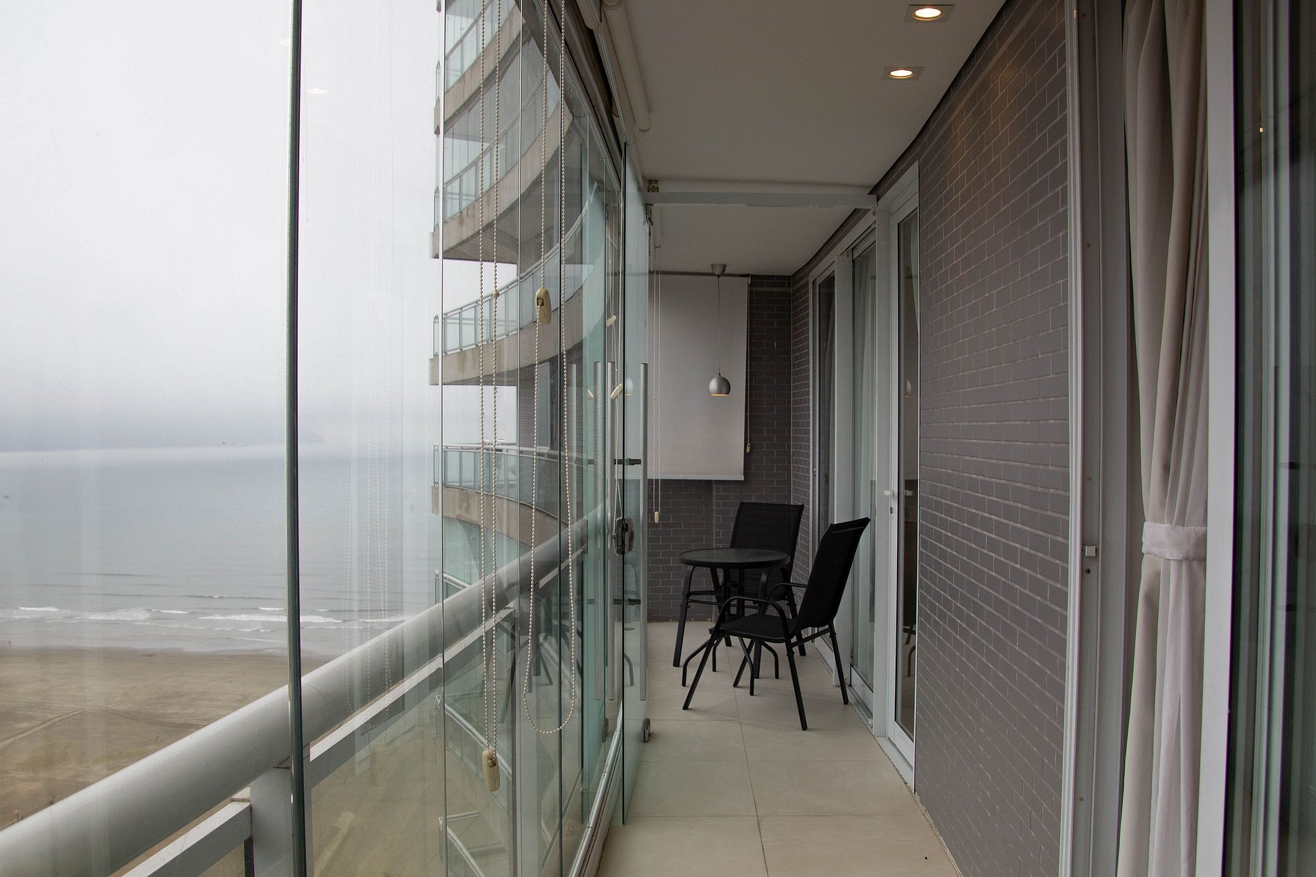 O apê 2103, no 21º andar, oferece vista para o mar e piscina, varanda envidraçada e decoração moderna.