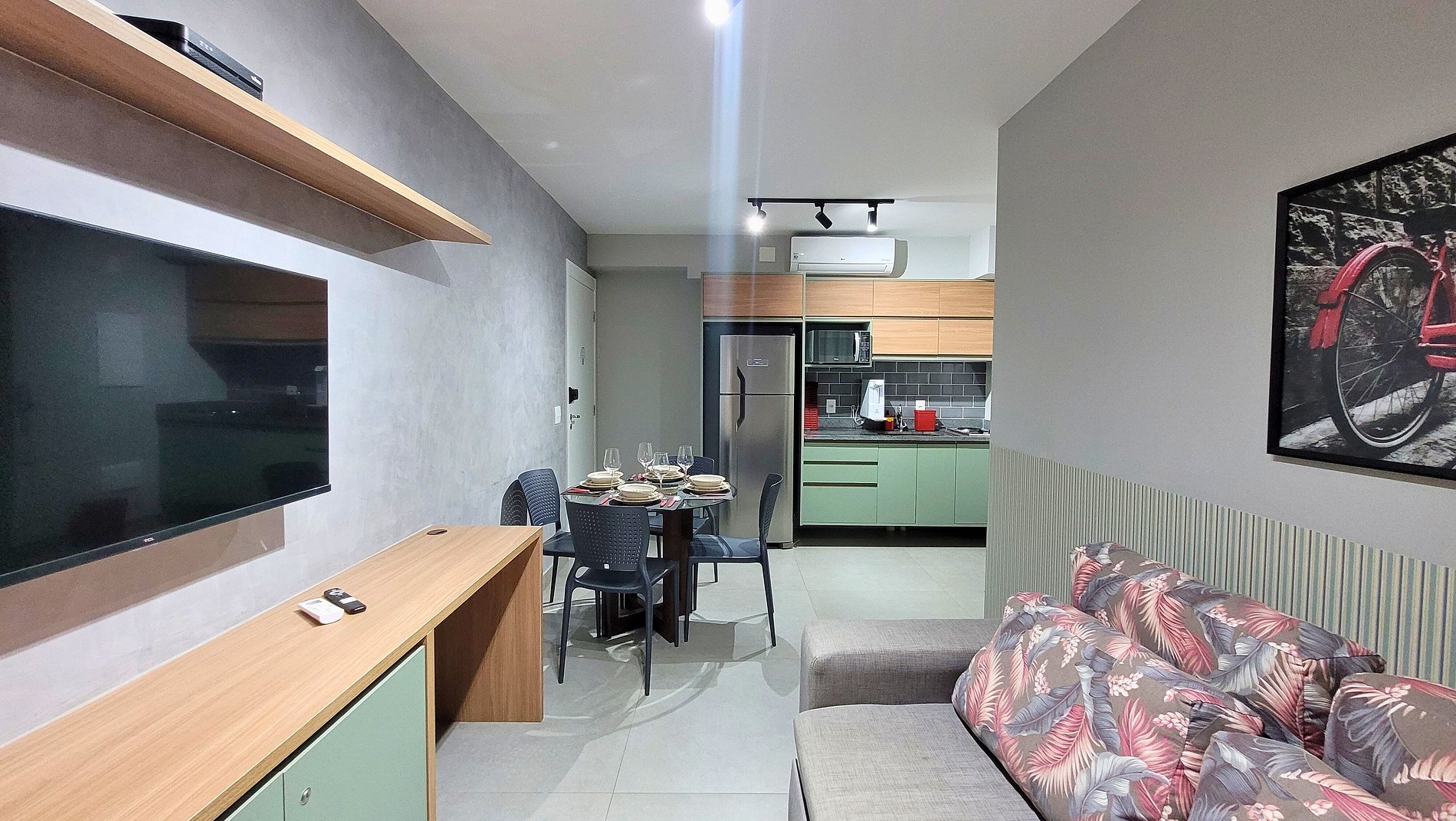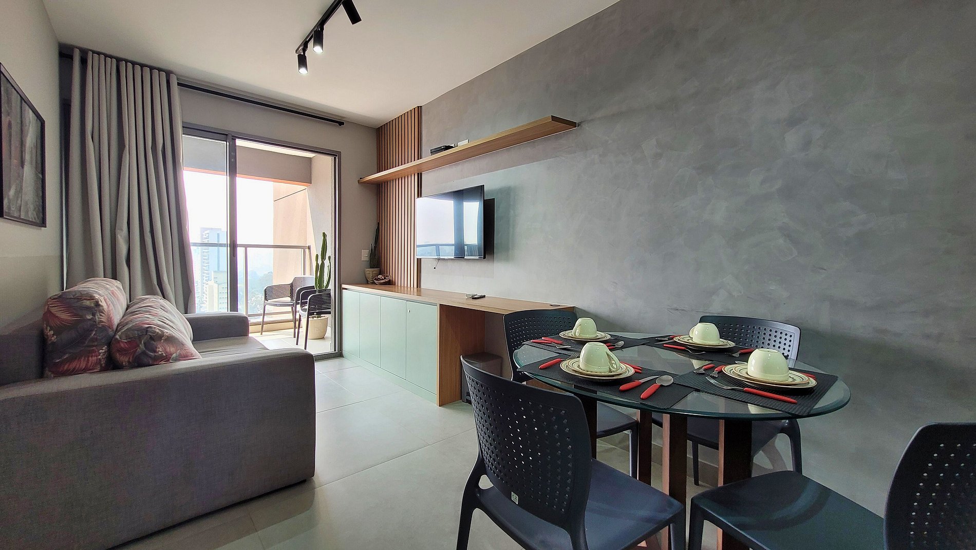 O apartamento é limpo e bem organizado. Corresponde ao anunciado. Os móveis são novos. A cozinha é equipada para curtas estadias. Seria ótimo se houvesse uma cafeteira, porem existe itens para coar o café. O mercado 24h no térreo do prédio é ótimo! Pãozinho fresco a toda hora, salgados etc Internet funcionou muito bem para fazer home office. A vista da varanda é sensacional!!! Da pra ver Sp em 180°C